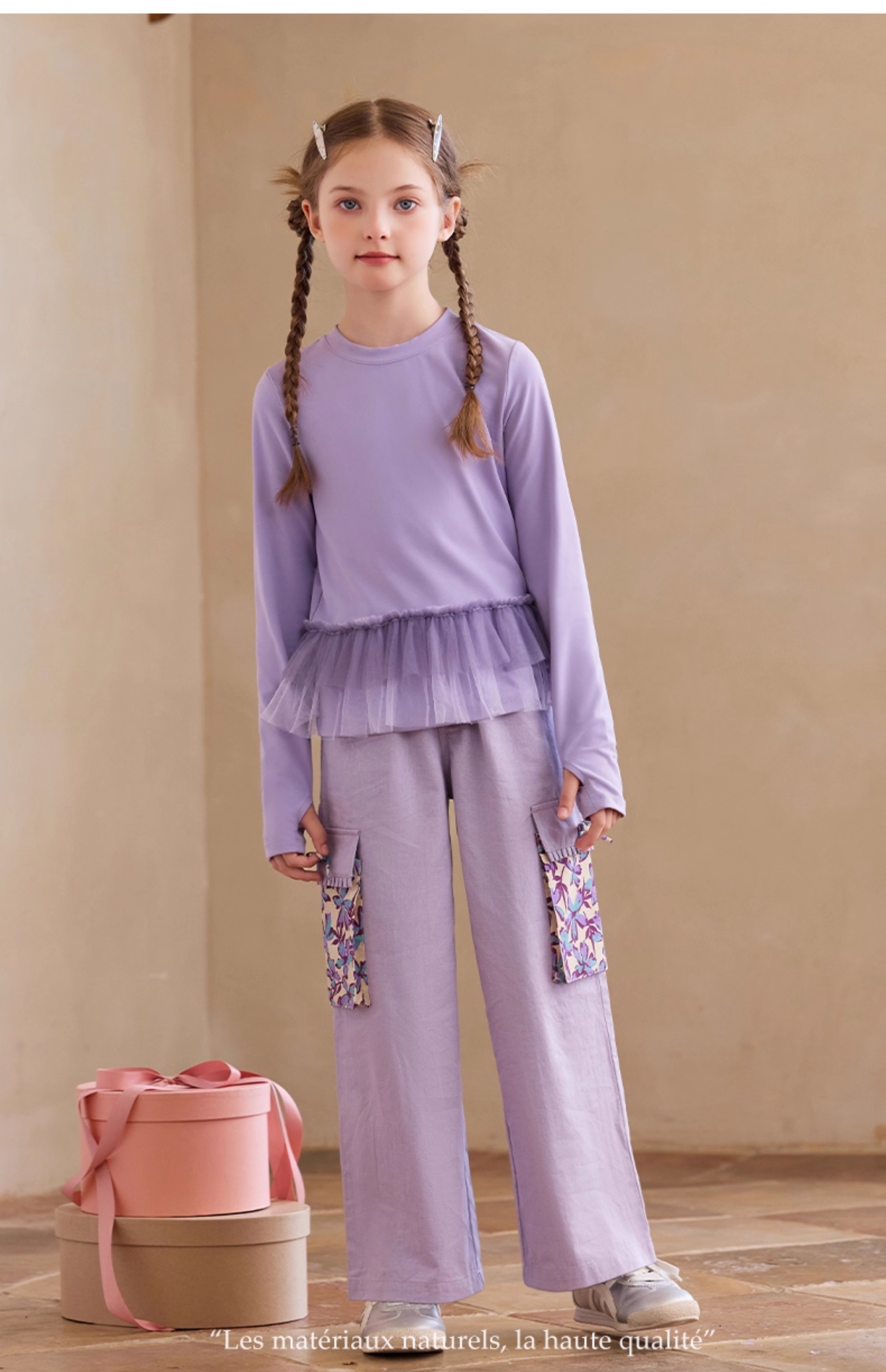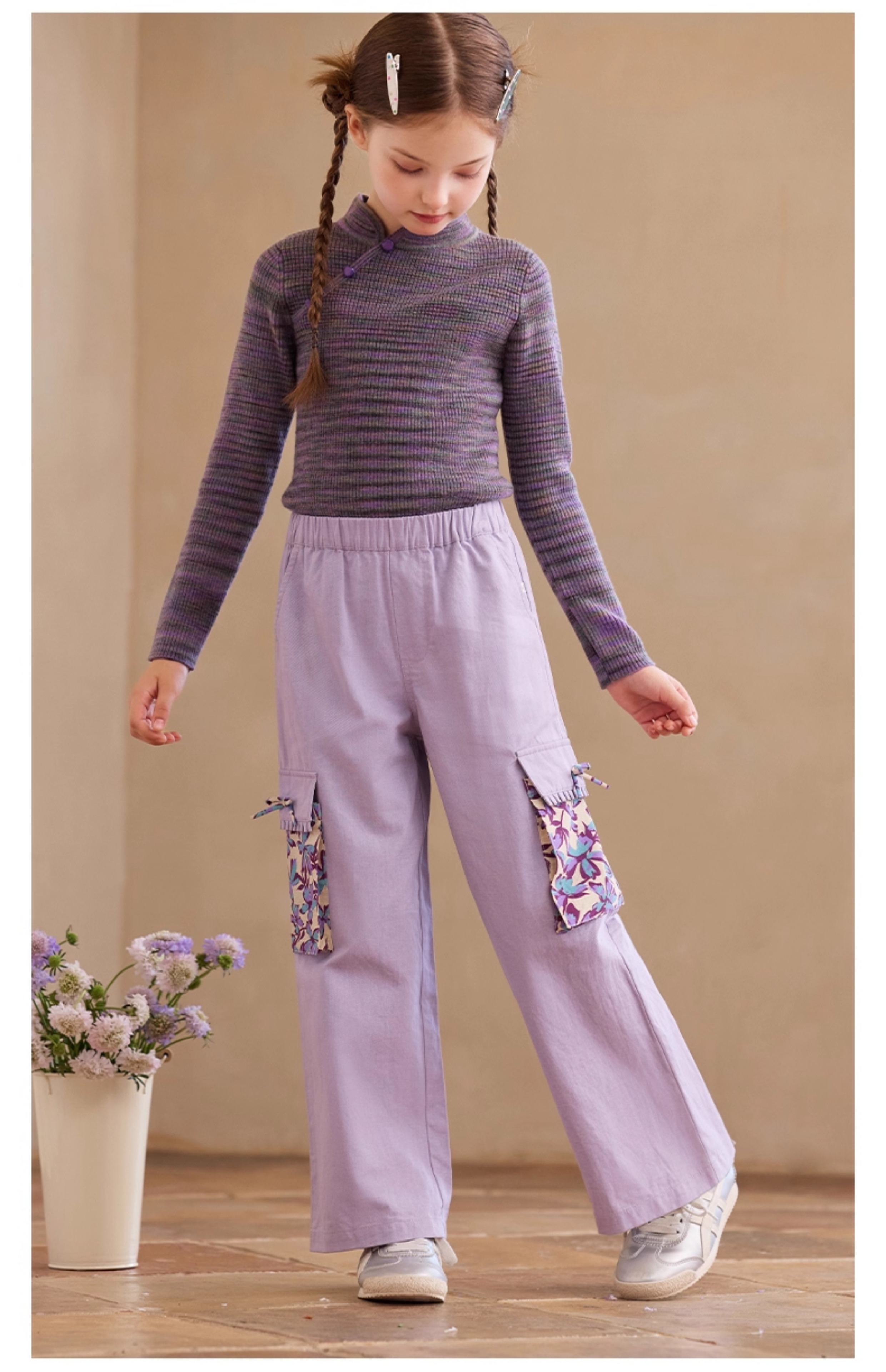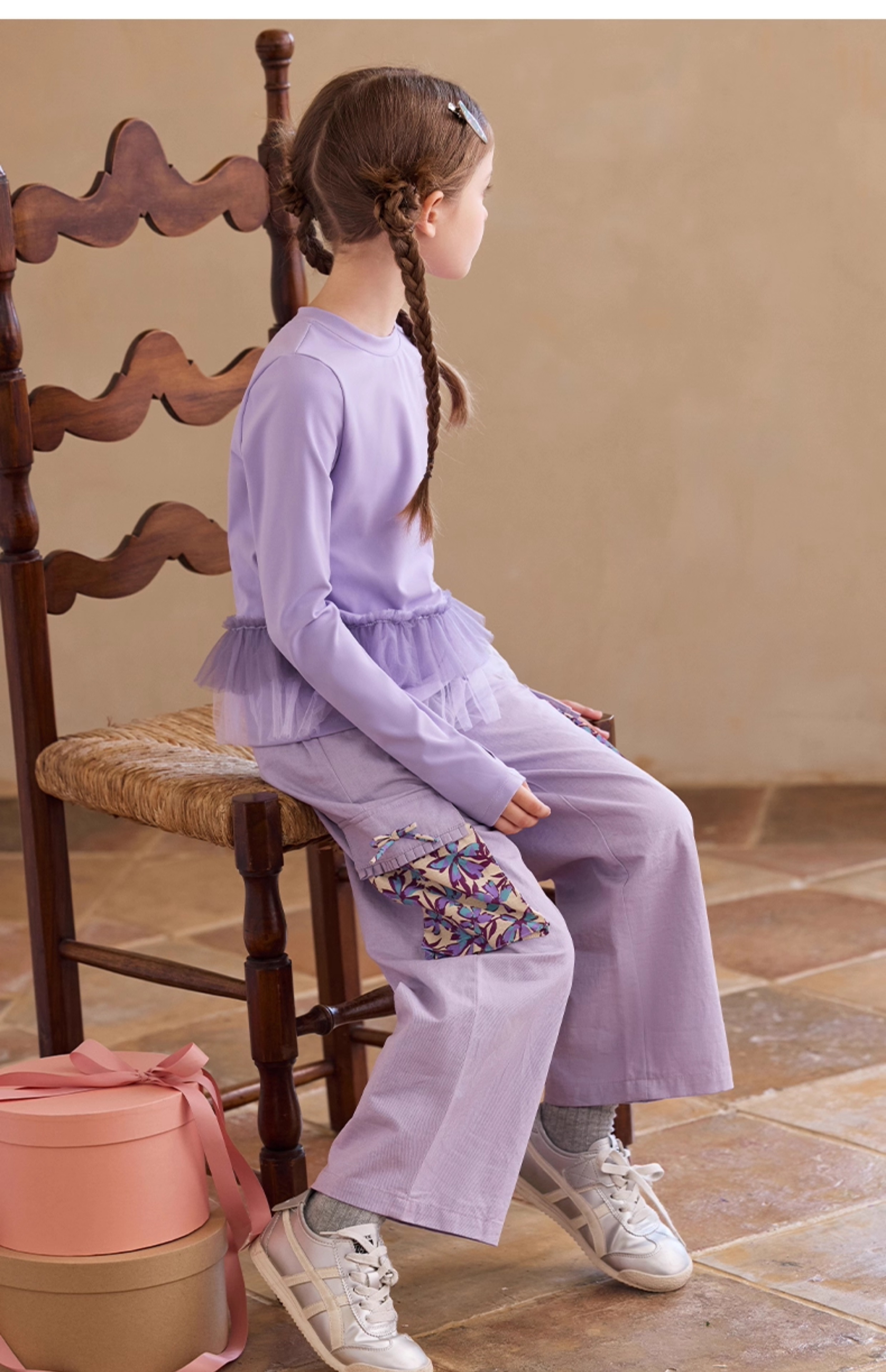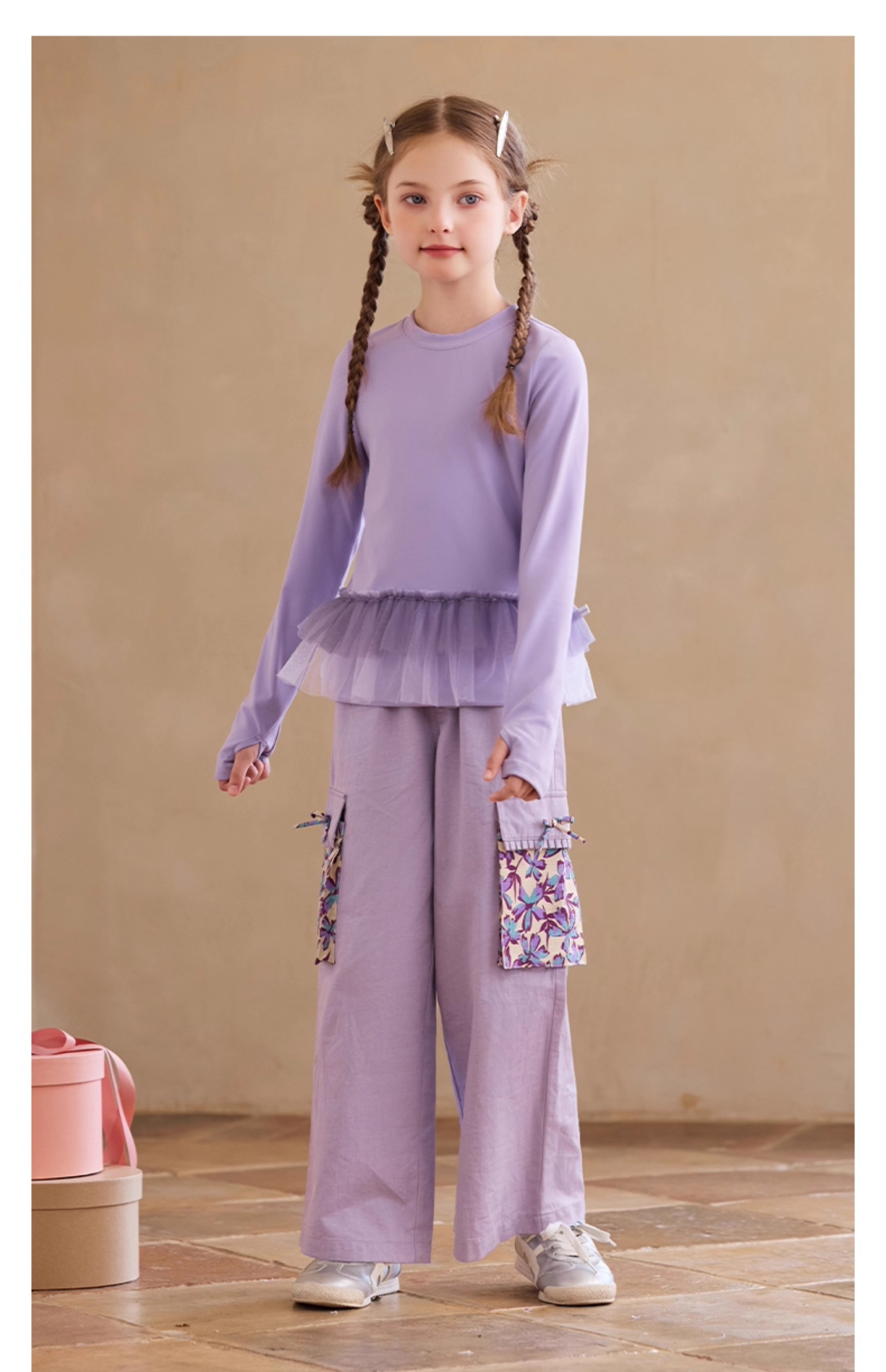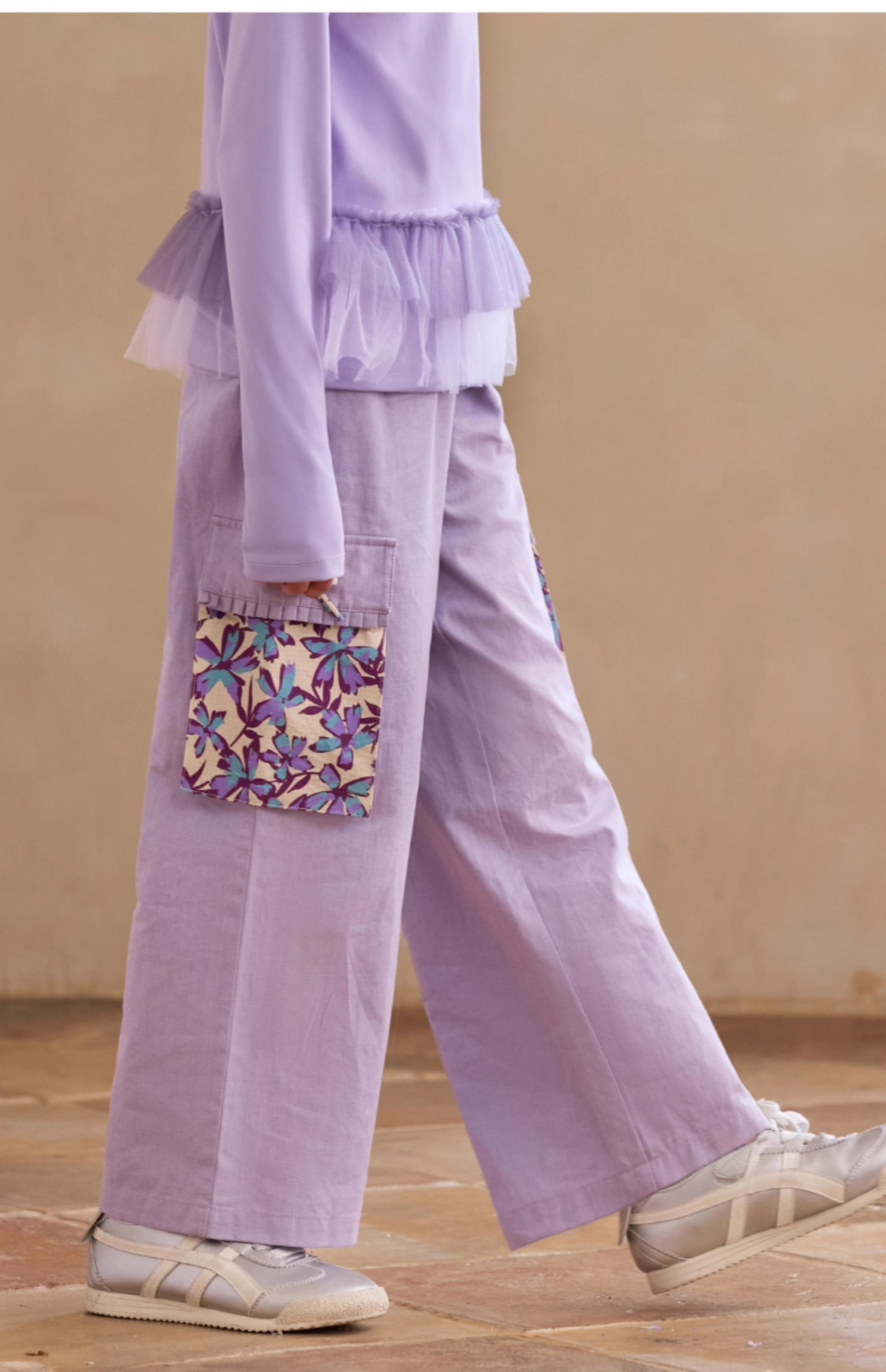 【云优选】Little Naive女童休闲裤秋季新款蝴蝶结花边口袋直筒裤儿童工装裤