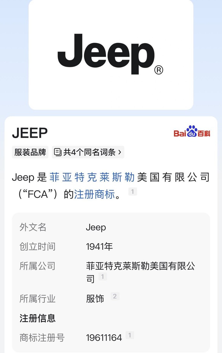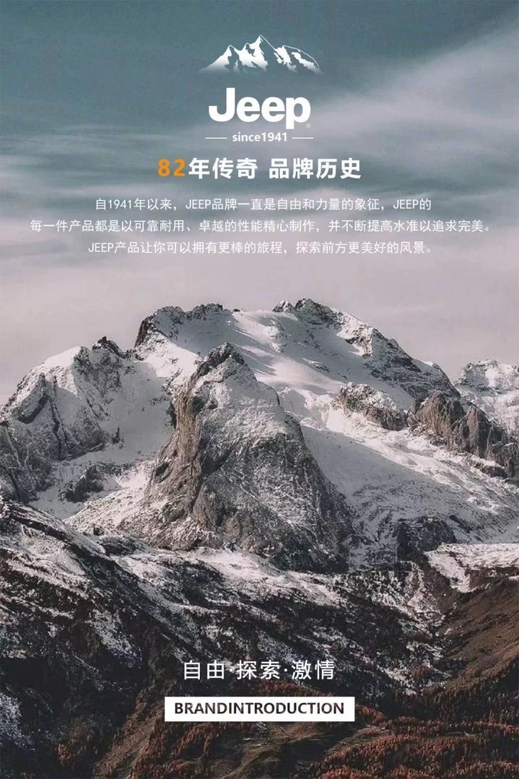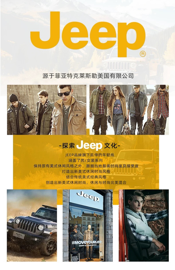 Jeep®创立于1941年,是全球知名品牌之一, Jeep®所代表的精神、所倡导的生活方式影响了一代又一代的忠实追随者。 Jeep是菲亚特克莱斯勒美国有限公司的注册商标, 遵循品牌延伸的发展战略, 菲亚特克莱斯勒美国有限公司逐步将Jeep品牌拓展到了除汽车以外的其他领域, 如服装、鞋帽、太阳镜、箱包、自行车、电器及户外运动装备等。 所有这些产品都秉承了Jeep创新、时尚、功能、耐用及持久的特性,而倍受人们的推崇。 其产品在逾100个国家销售。