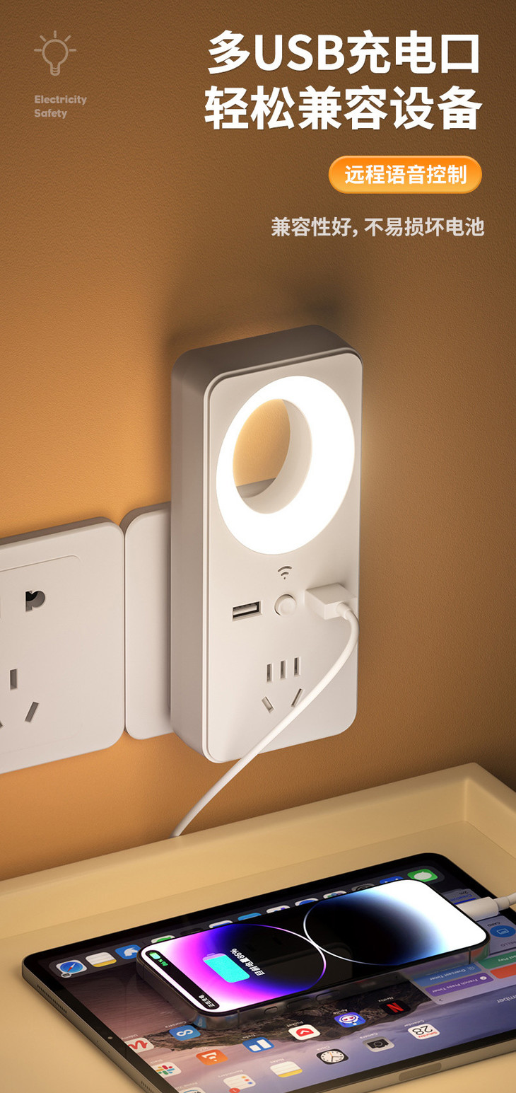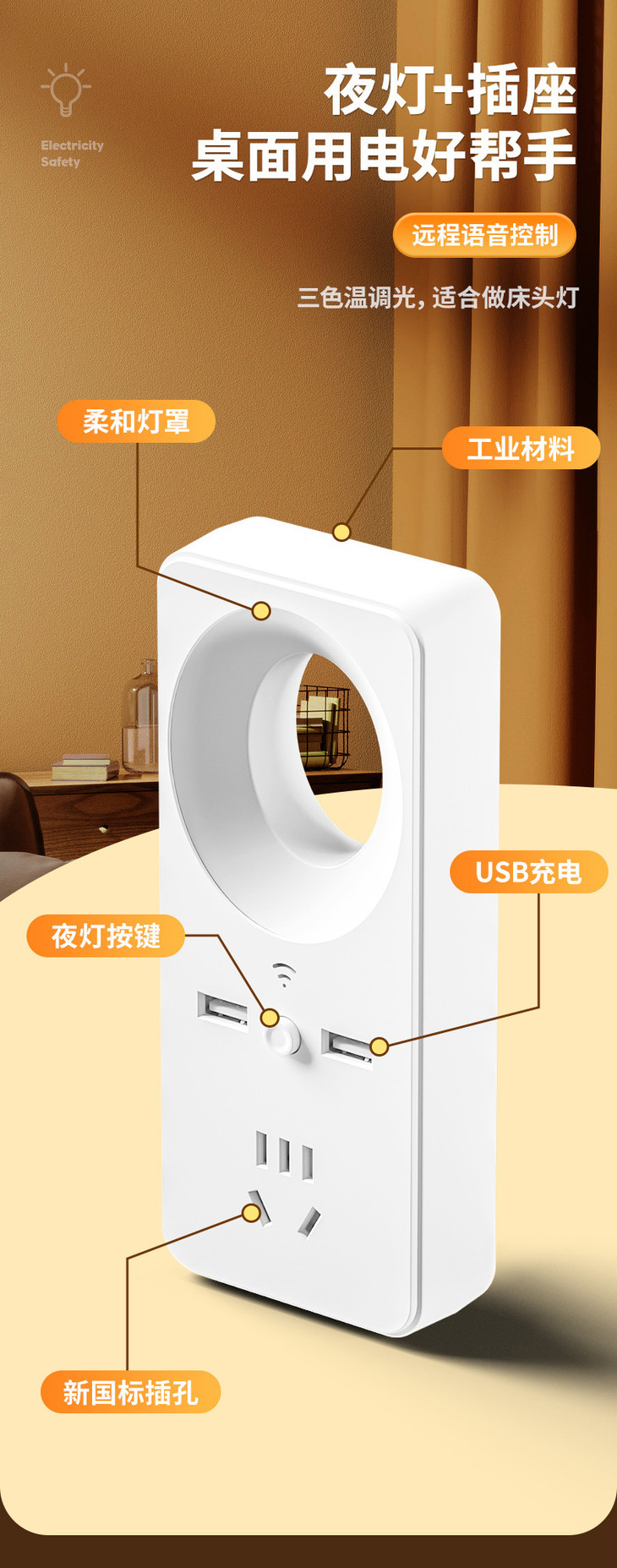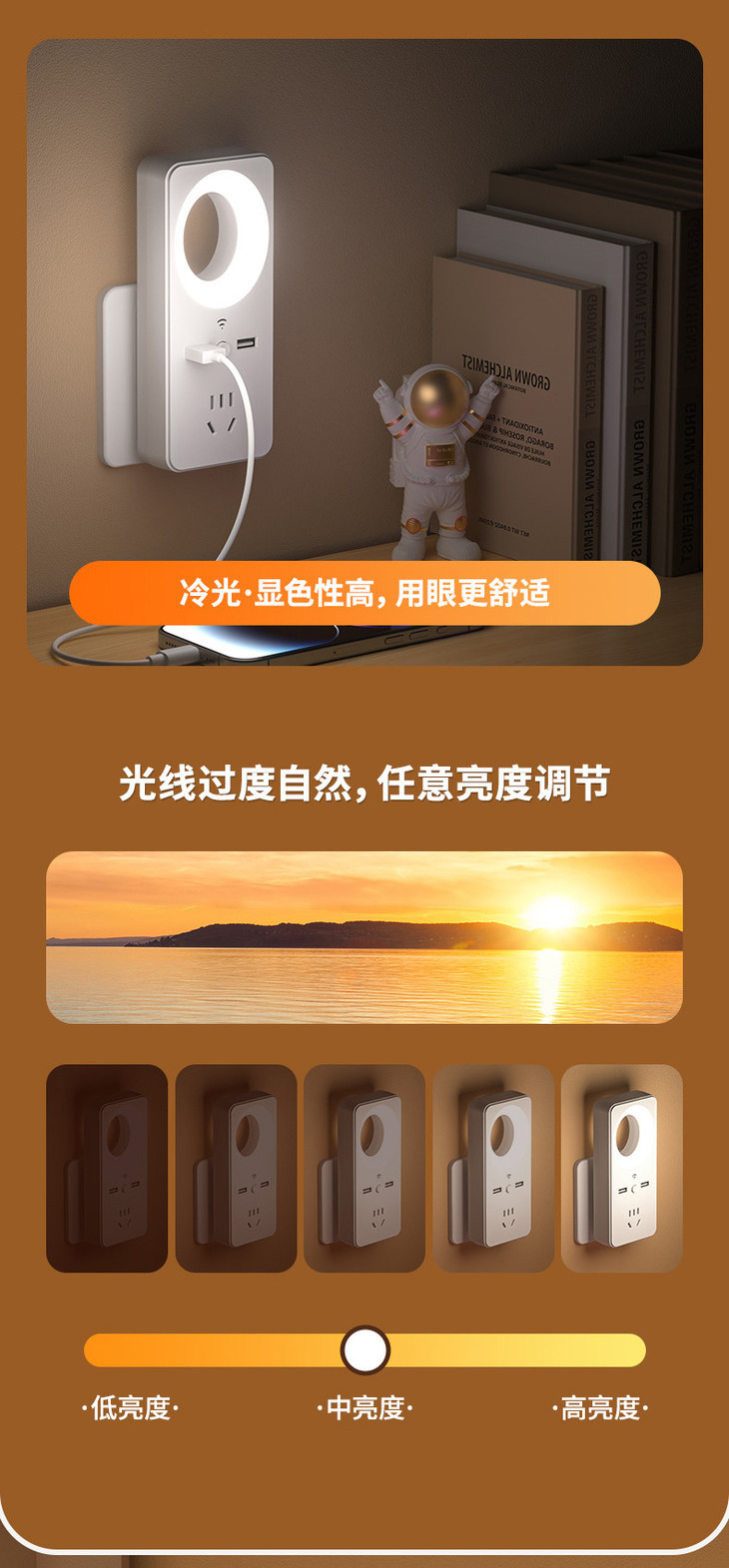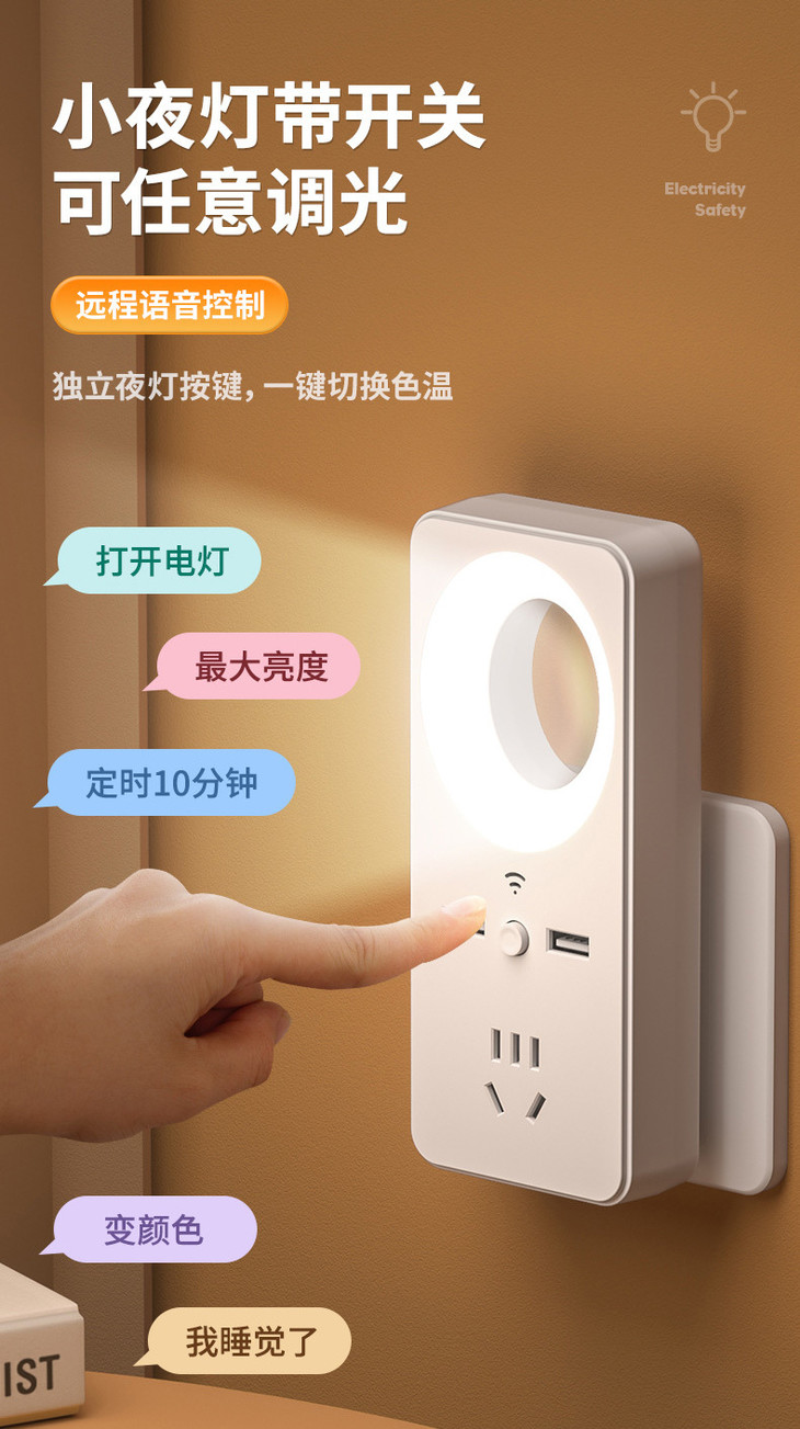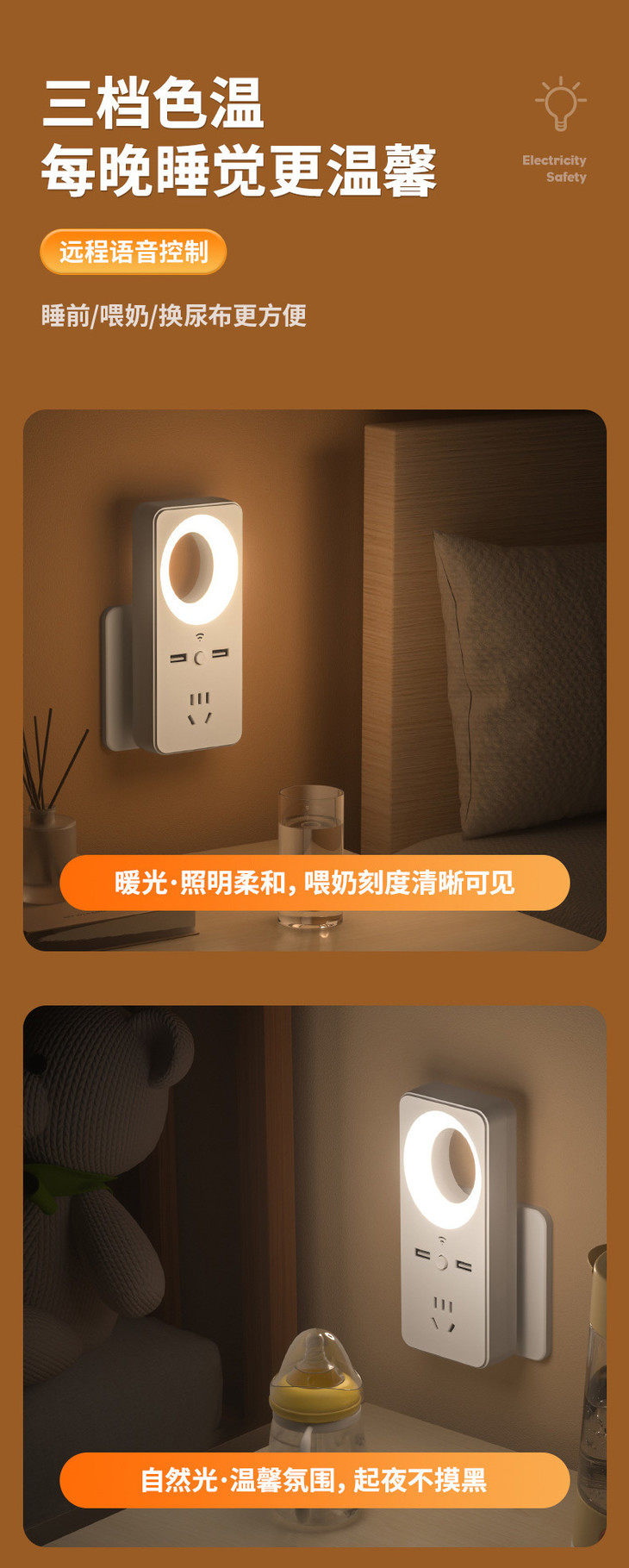 ✅一体三角插直接上墙,自带五孔插位=完全不占插位 ✅插座+夜灯+usb充电,轻松兼容设备,插座利用率拉满 ✅三档调光:暖光(助眠)/自然光(起夜)/冷光(阅读),一键切换 ✅开关灯/变色调亮度,声控秒召唤,完全就是懒人的专属定制