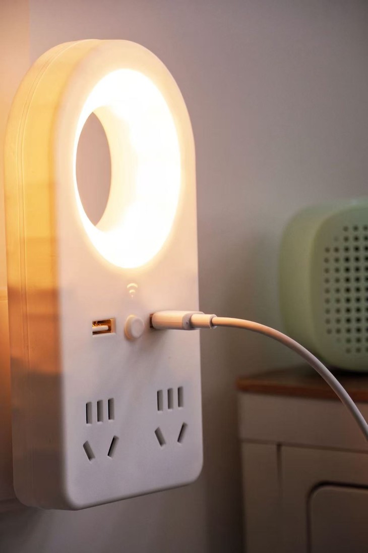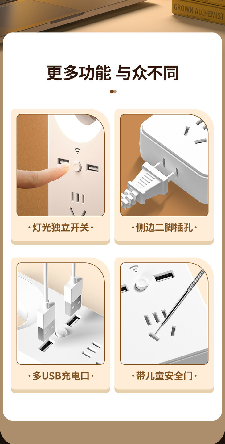 🔻插座+夜灯+usb充电,一物三用 不只是夜灯,还是插座和充电器 🔷插孔丰富多样 👉🏻国标插孔双孔*2、三孔*2 👉🏻USB直插孔*2