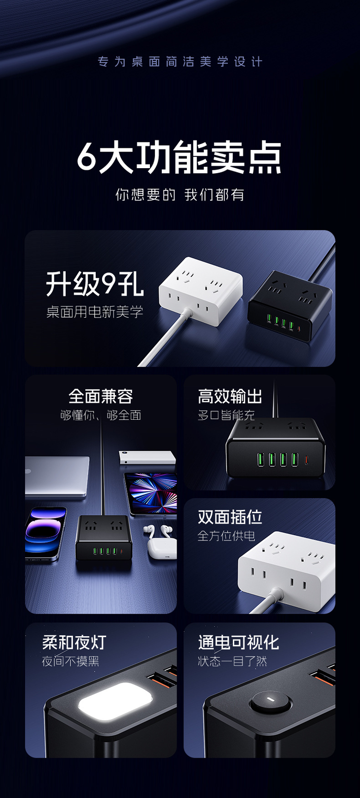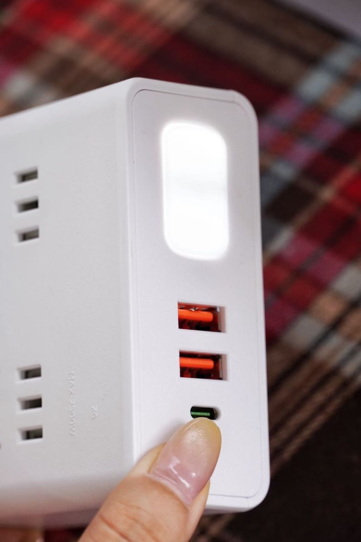 ✅多口同时输出,2500W超强承载力,同时充一样速度一样快 ✅丰富多接口,C口、USB口、两孔、五孔一应俱全 ✅迷你小体积,放桌面不占一点空间,却撑起整个桌面的电力宇宙 ✅配置柔亮小夜灯开关,夜间起夜不摸黑 ✅75N受力安全门,避免儿童手指或异物掉入,安心用电