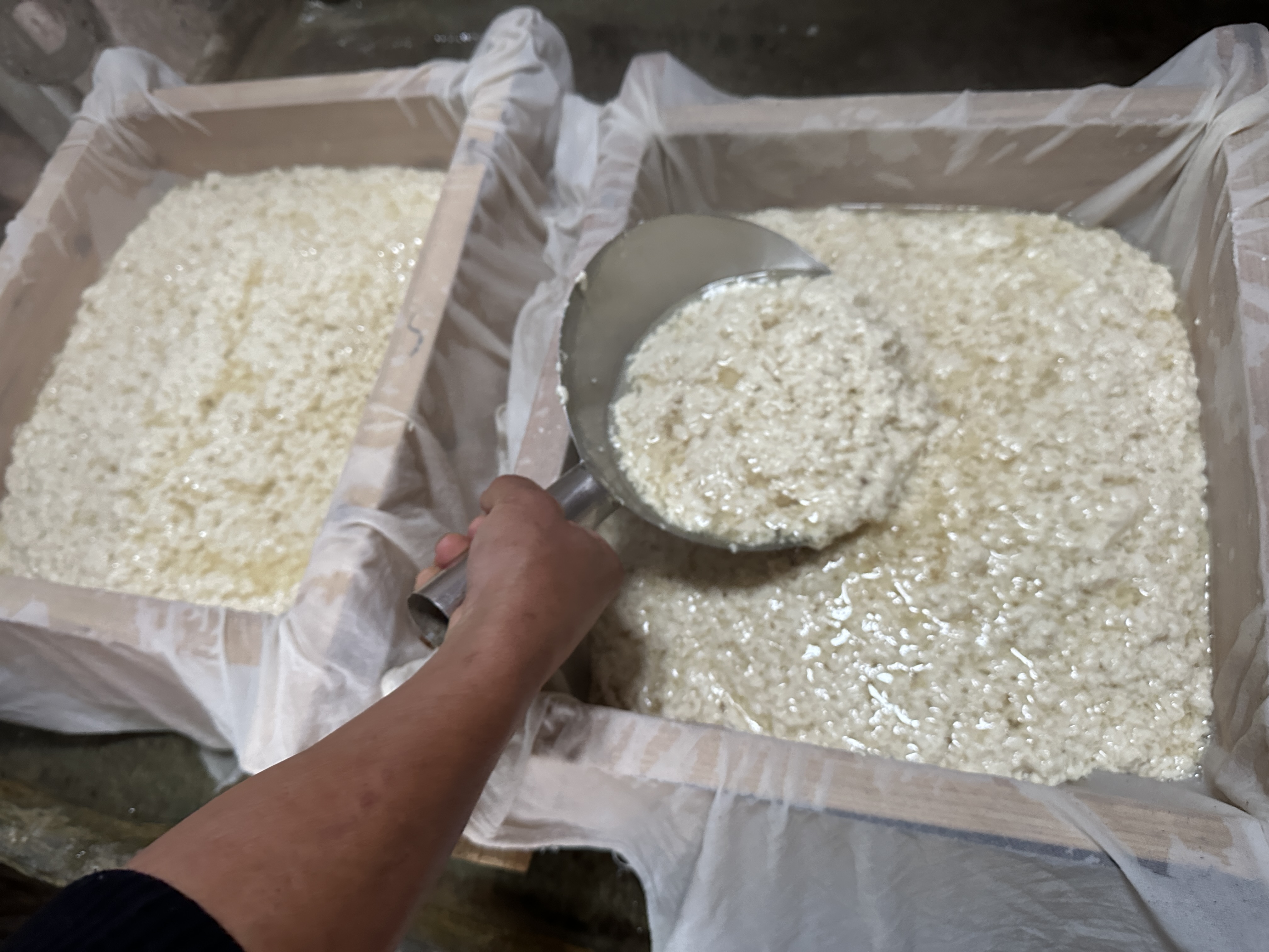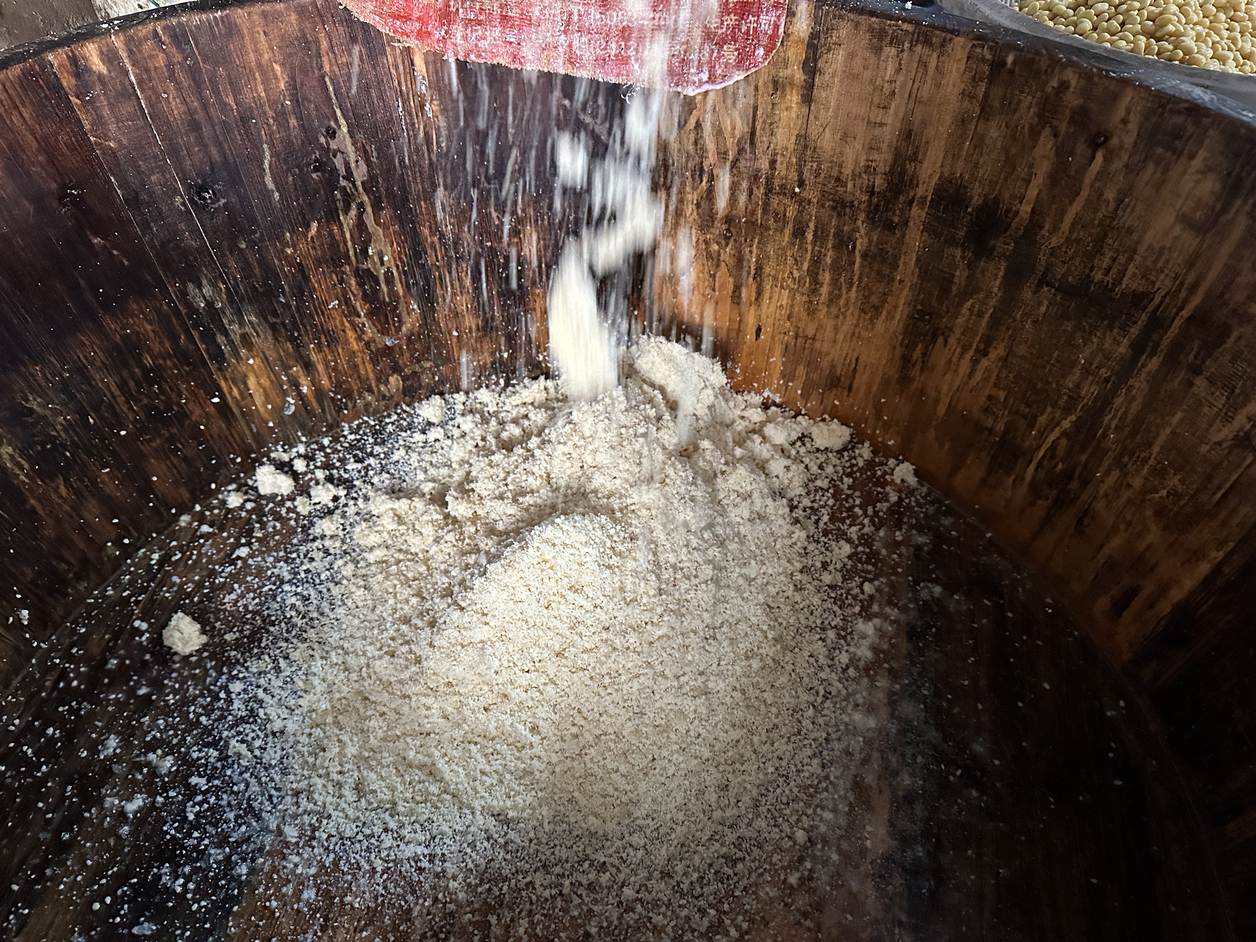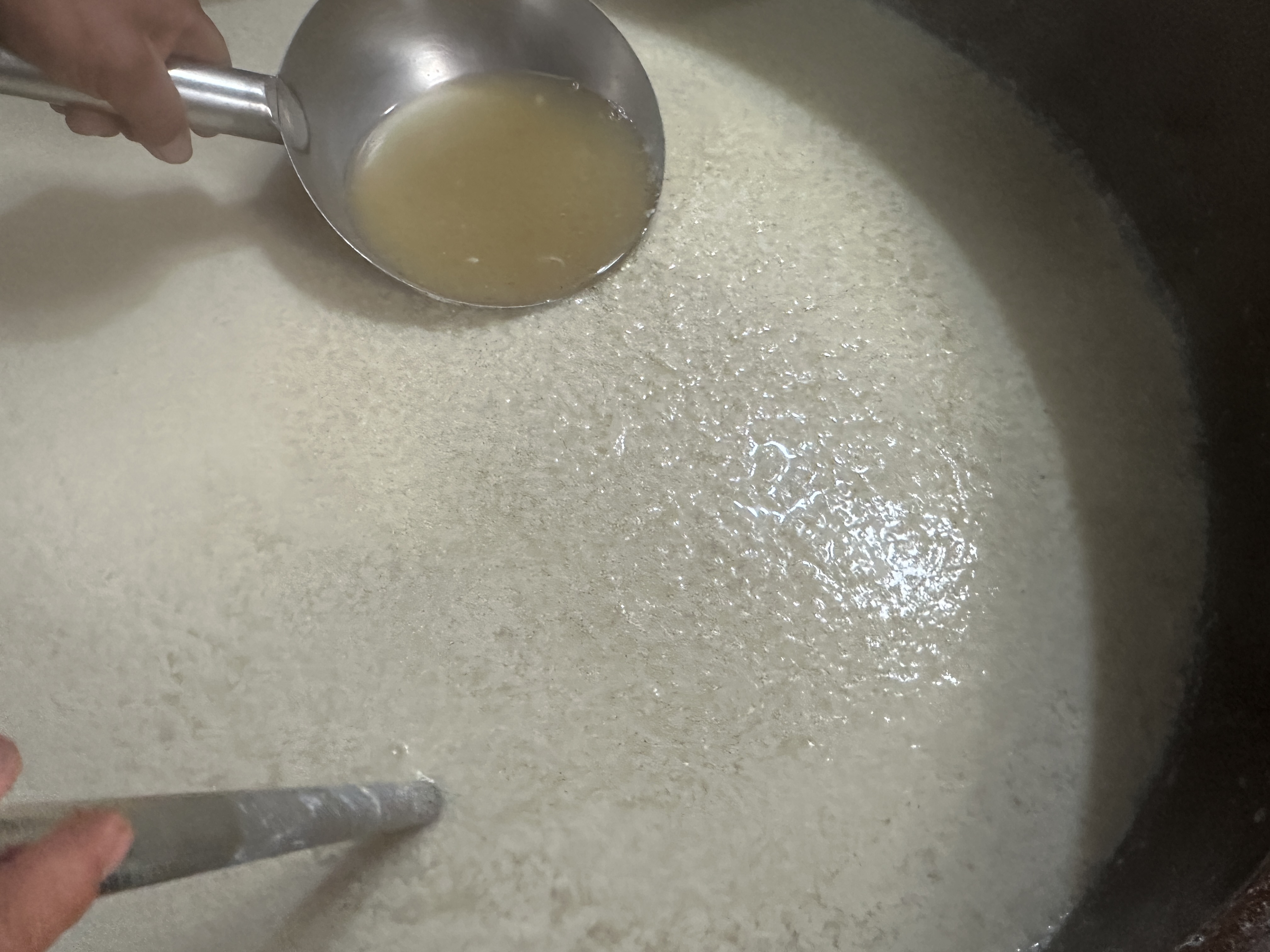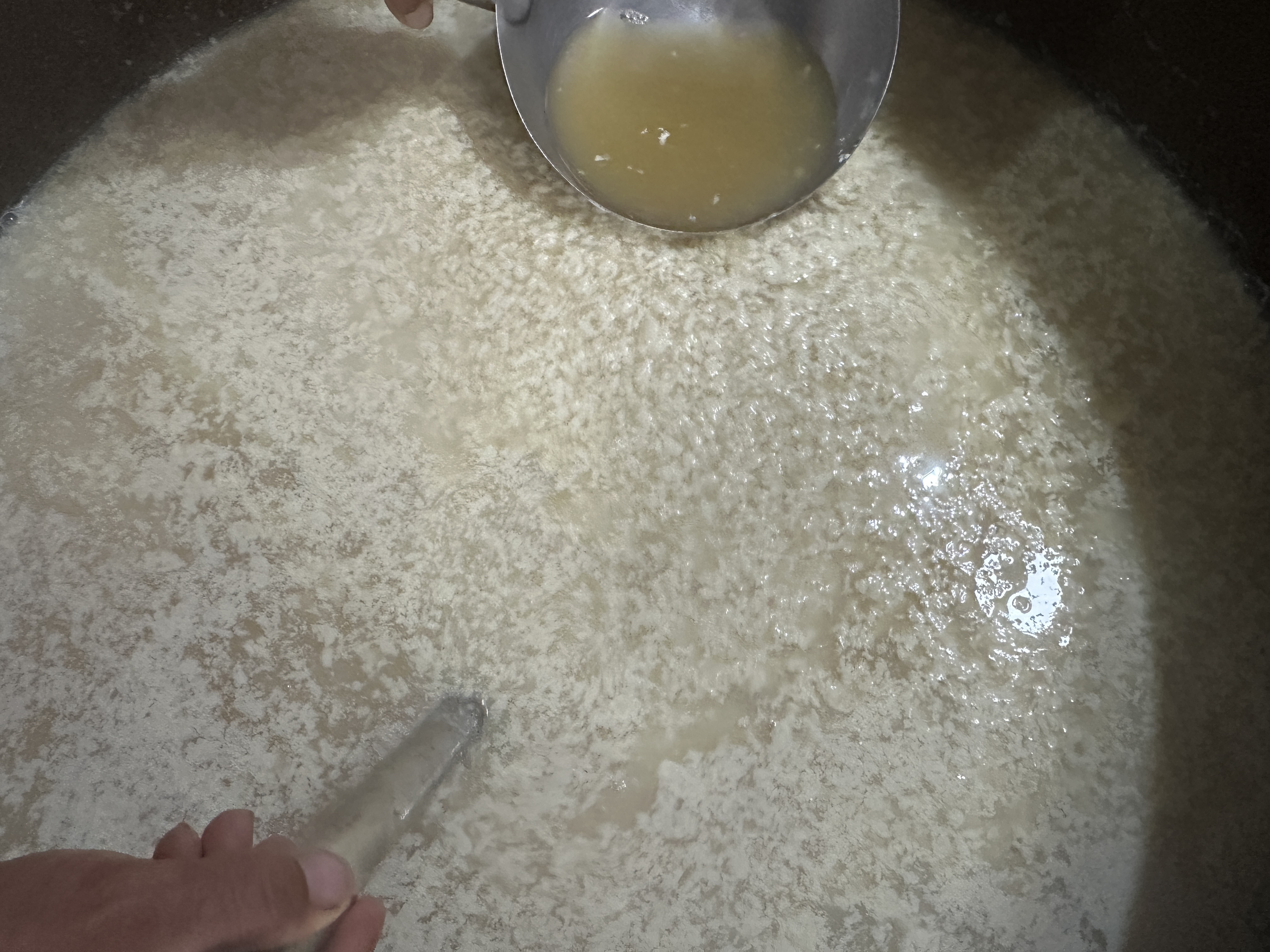 喝过豆浆后,继续干活,最关键也是最重要的环节就是点浆了,也是非常有技术含量,一个手均匀的搅动,一个手均匀的点浆,整个过程要非常耐心,动作需要快慢一致,这样豆腐也能均匀的凝固。