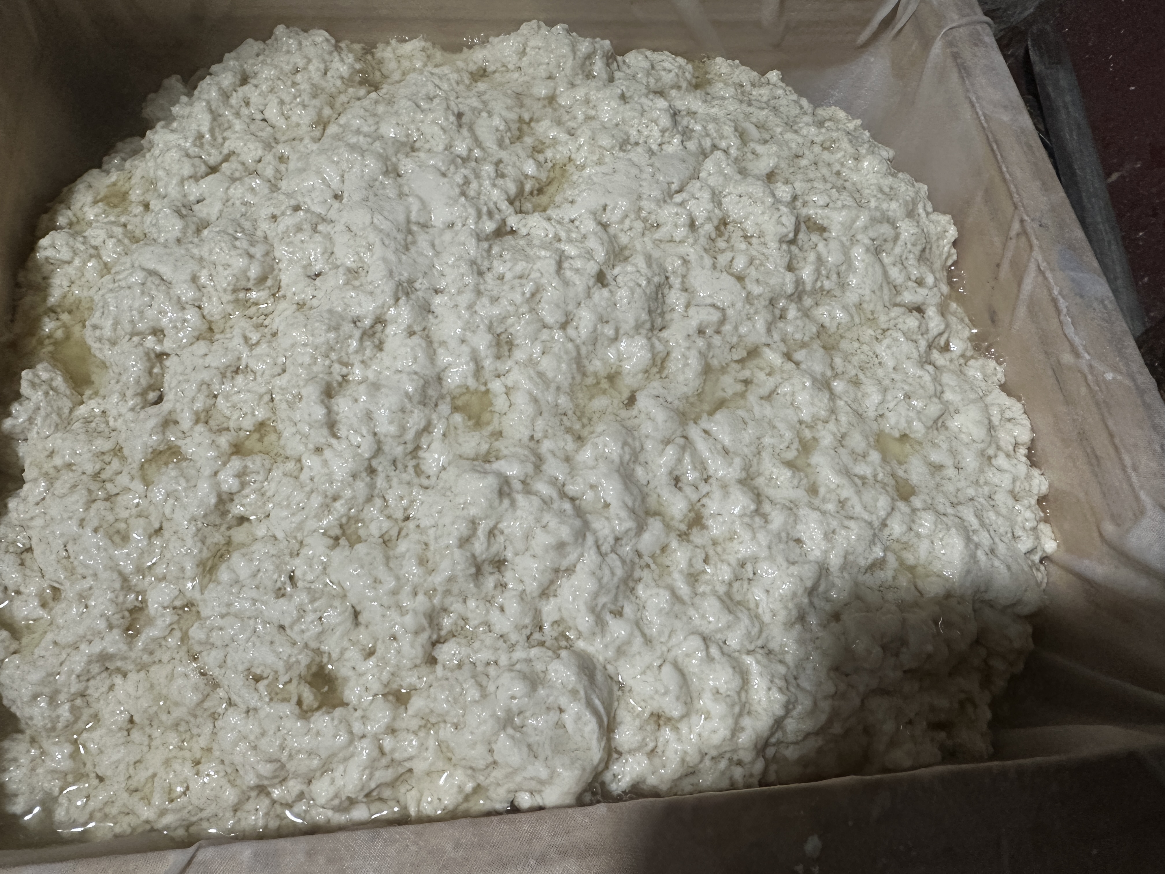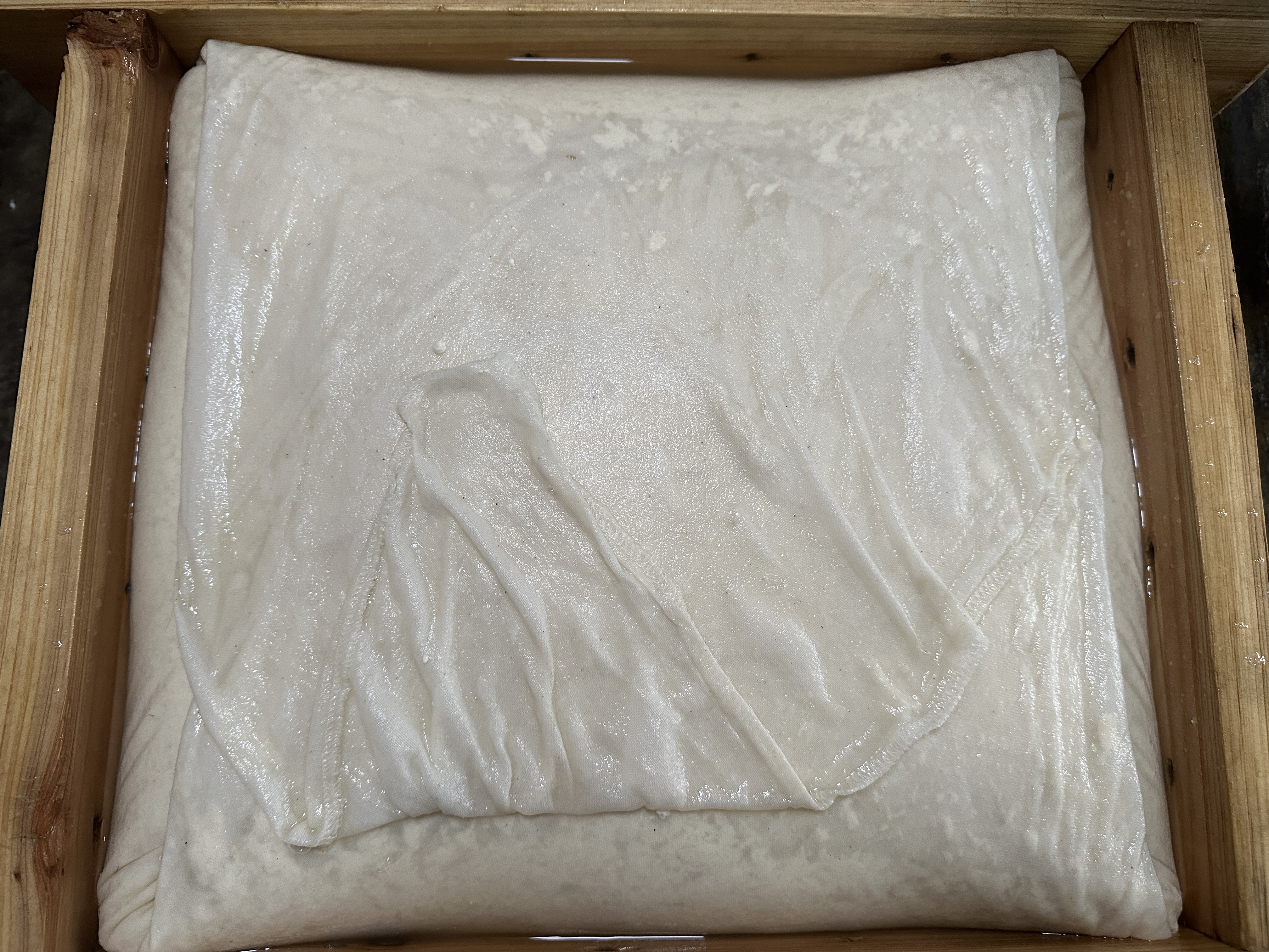 还有一个比较重要的环节就是留取下次做豆腐的酸浆,豆腐凝固后,上面黄色的液体我们会留下来,这就是下次做豆腐的酸浆: