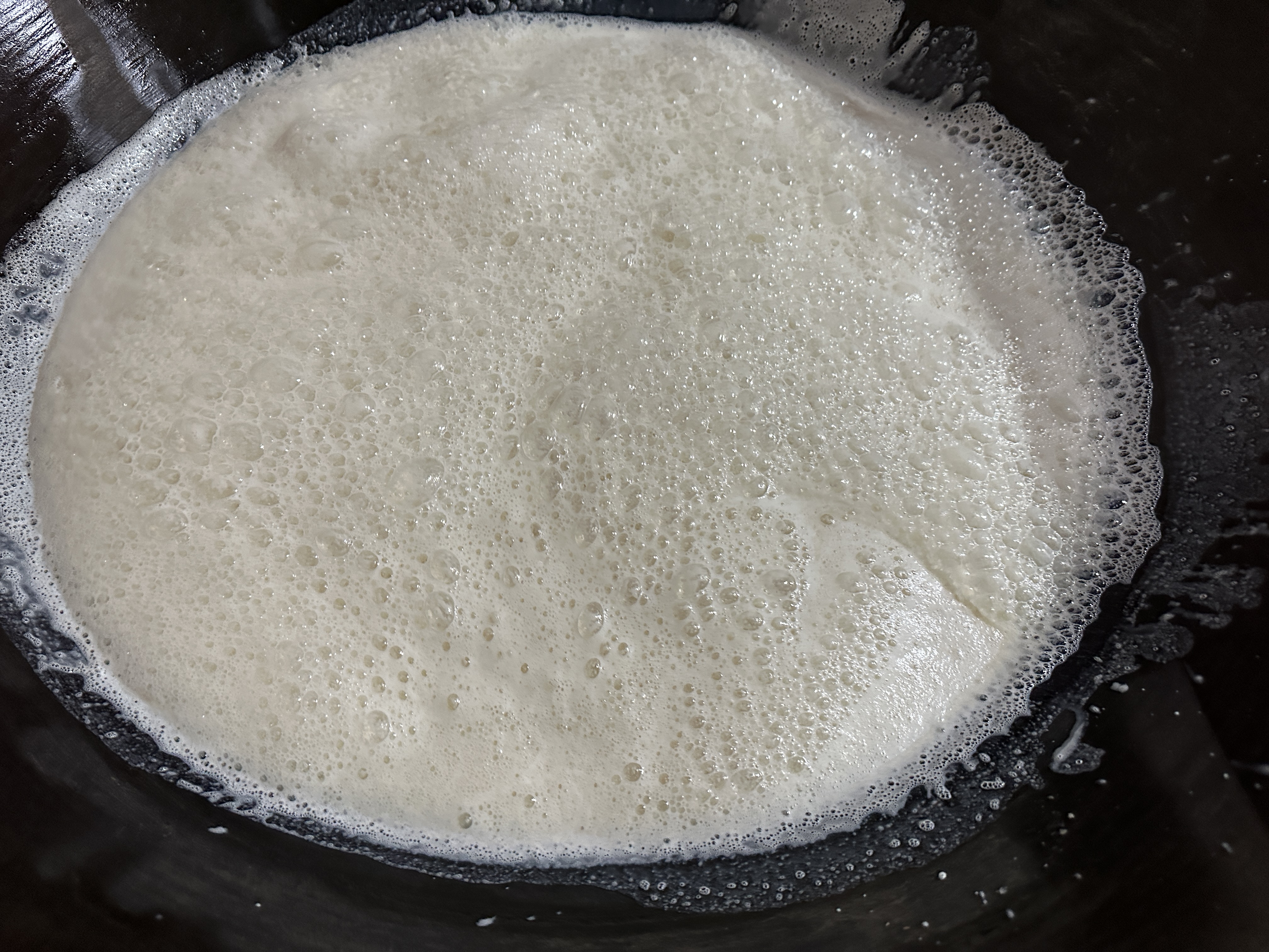大家最关心的问题之一就是消泡剂,豆浆煮开后,会产生大量的气泡漂浮在锅面,在工业豆腐制作过程中会用到消泡剂,感兴趣的大家可以去查一下消泡剂的含量。而我们就是用最笨但是最安全的办法,直接用瓢一瓢瓢的吧泡沫舀走,不断的重复。