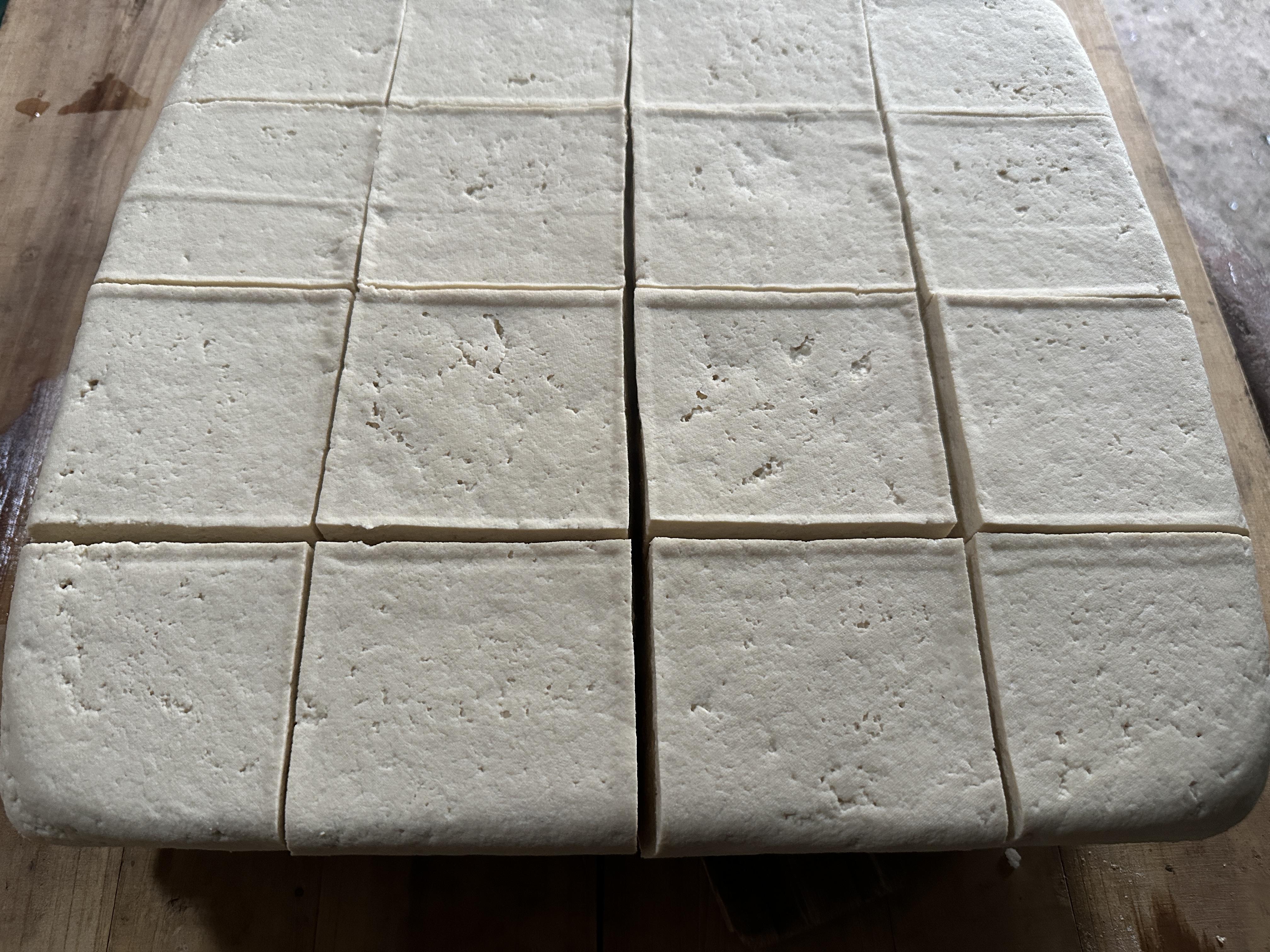 这种豆腐做出来了后,就是很自然的白里带黄的豆腐,而且带着一股微微的酸味。跟市场上的雪白雪白的豆腐完全不一样。