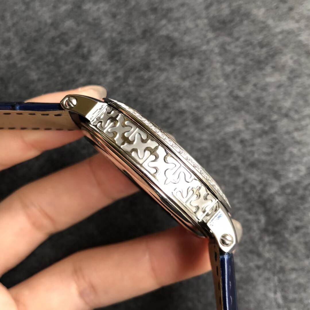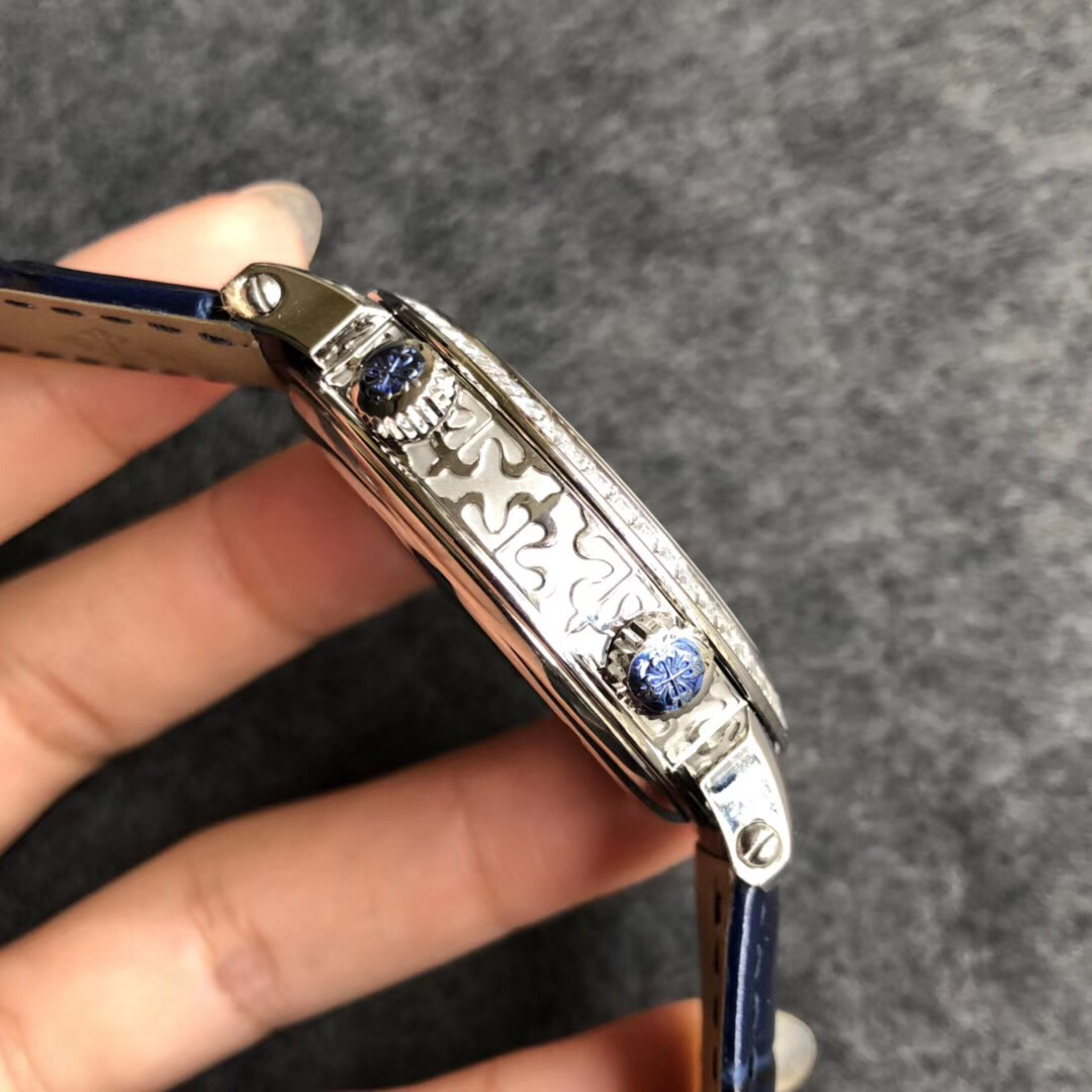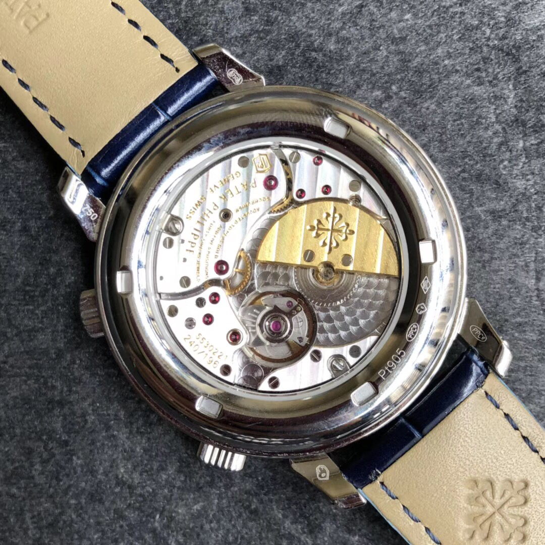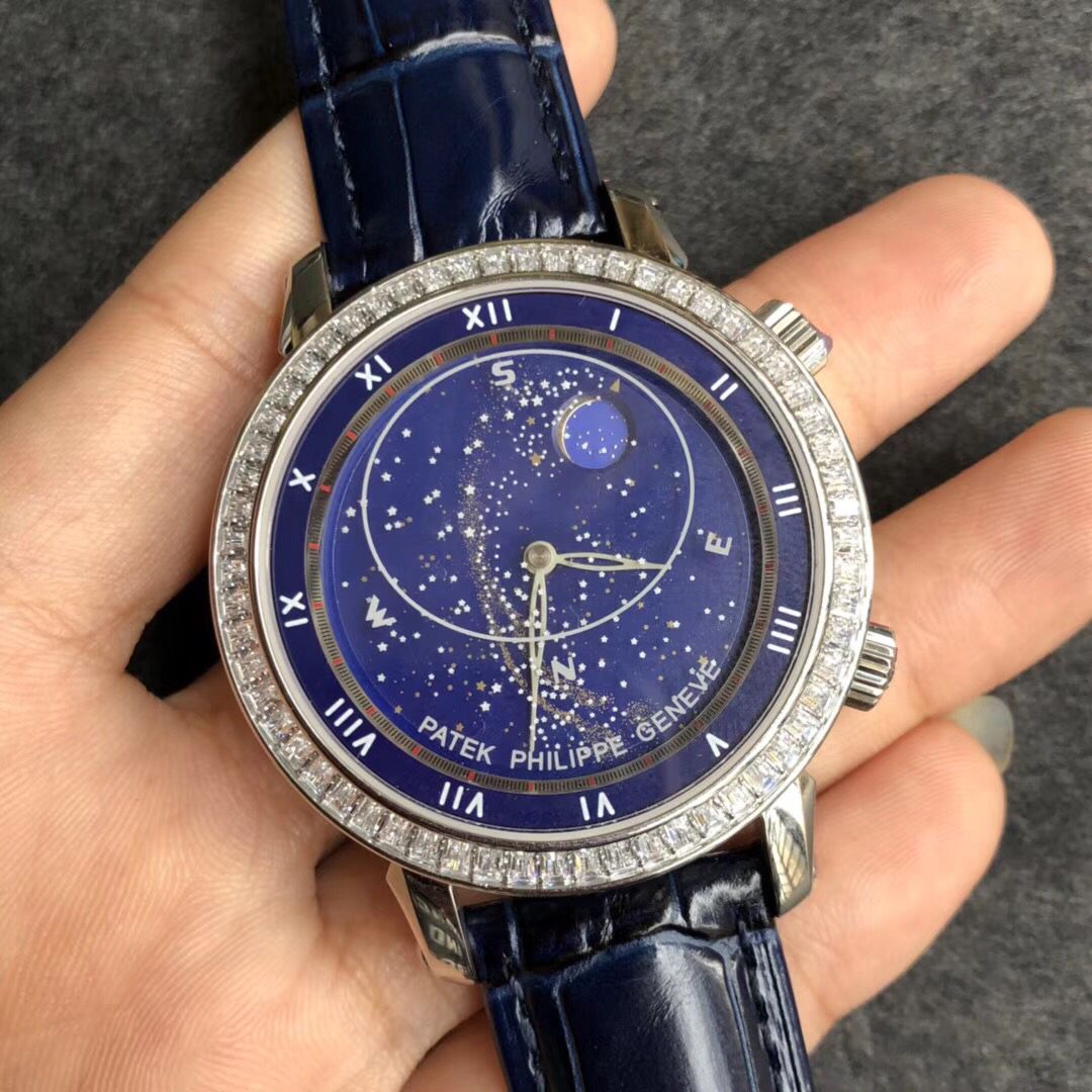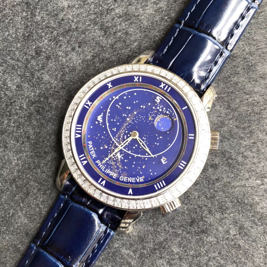 YL百达翡丽星空5102天月款日内瓦苍穹系列 这款星空腕表独具特别星象功能,蓝色圆表盘上就能欣赏日内瓦苍穹图,还有金色月球运行轨迹,熬时20个月 采用进口9015改造而成的珍珠陀,和正品一样机心 表盘上的月亮会根据天空的月亮月满圆月蚀弯的情况自动变化 表壳前后玻璃采用先进技术处理让玻璃折射光提高,让表盘看起来更加通透 似乎没有玻璃的感觉 5字位把头调星空盘转动。本厂壳身百达翡丽花纹 花重金采cnc深雕刻 立体感凹凸感 超强。升级了24小时自转的星空 表盘尺寸43mm