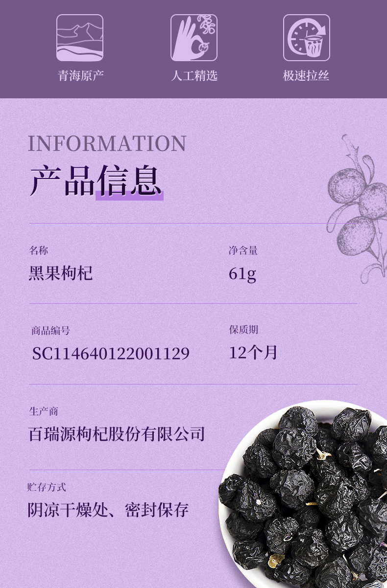 百瑞源 野生黑枸杞 精选青海柴达木黑果枸杞子 61g