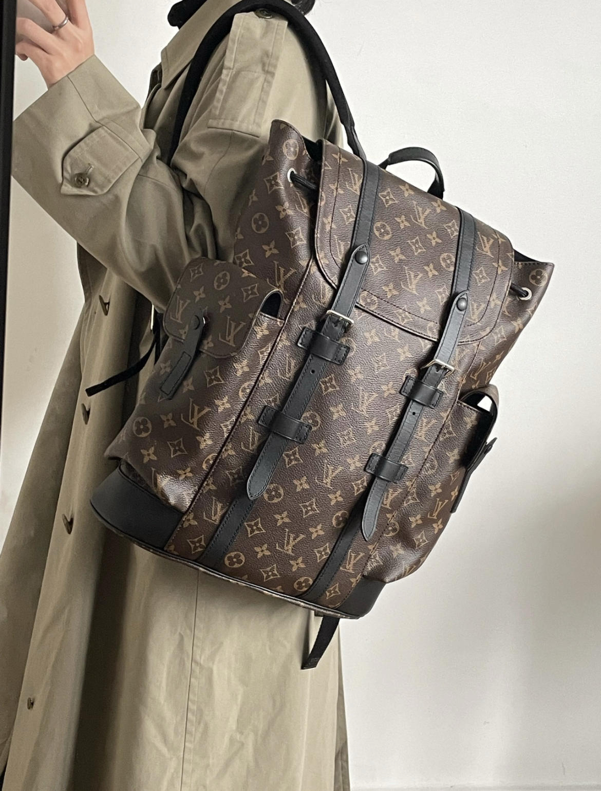 【商品詳情】正品二手 Lv 中号 老花拼皮 Christopher 翻盖 扣式 双肩包🦪 95新 34x42 底部配皮轻微使用磨损 内里有轻微使用感 旅行绝配
