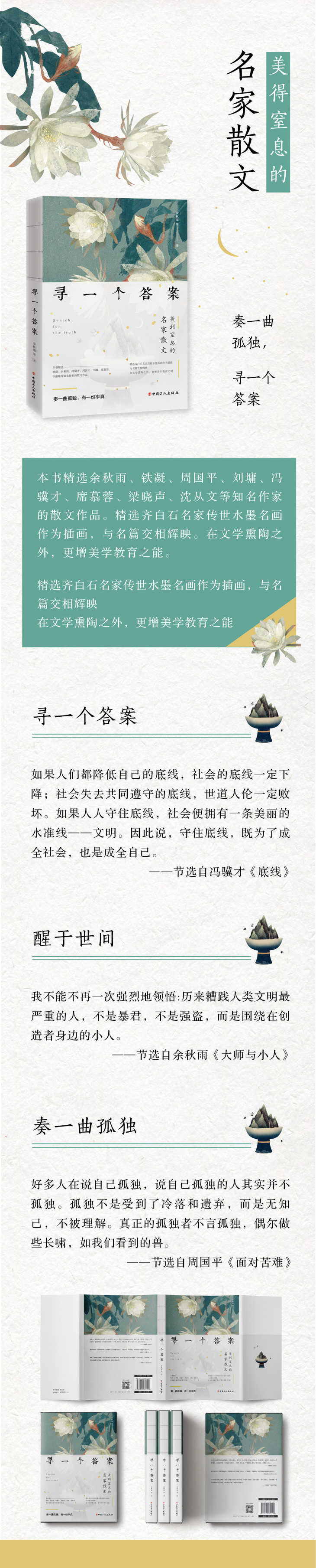 本书精选余秋雨、铁凝、周国平、刘墉、冯骥才、席慕蓉、梁晓声、沈从文等知名作家的散文作品,这些作家无疑是当代中国读书人中闪耀的明星,纵跨中国百年文学史,呈现传世文章精华。本书旨在以文学作品陶冶情操,用经典阅读触发思想,启迪人生智慧,于无声处滋养心灵的成长,在美文阅读中拓宽人生视野,实现人生境界的升华。本书还精选了齐白石名家传世水墨名画作为插画,与名篇交相辉映,在文学熏陶之外,更添美学教育之能。