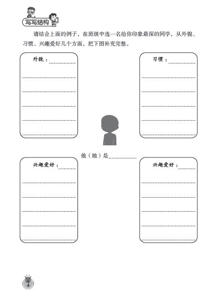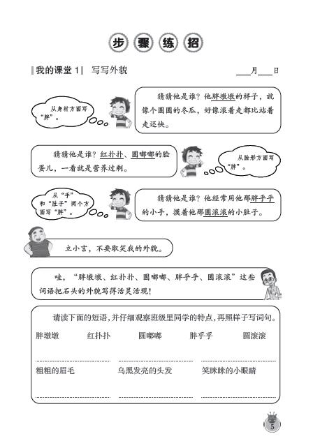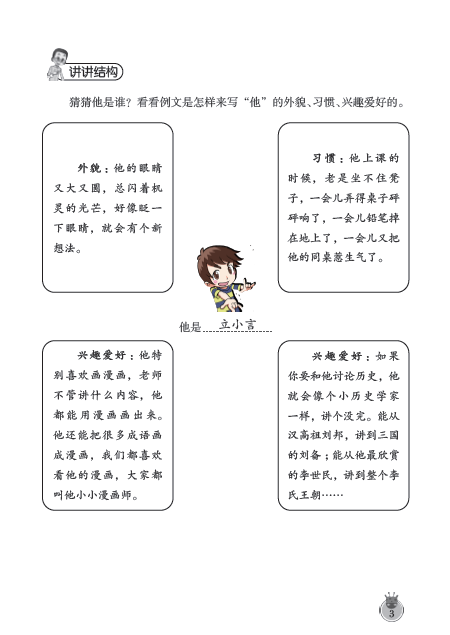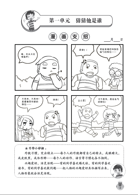 “漫画支招”之后,就是“讲讲解招”了,在这一环节里,讲讲老师会告诉你如何运用习作小妙招。以本册第一单元为例,读例文《猜猜他是谁》,你就会发现:“他的眼睛又大又圆,总闪着机灵的光芒,好像眨一下眼睛,就会有个新想法。”这句话抓住了“他”的外貌特点——灵气十足的大眼睛,极具个人特色。接着作者又详细描写了“他”玩中带学的习惯