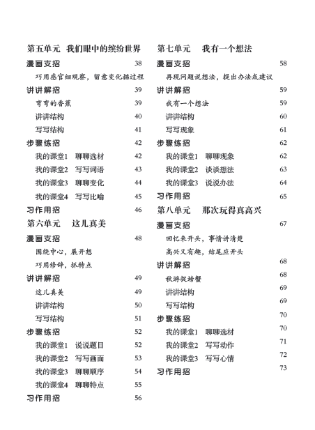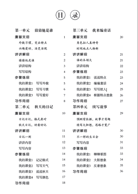 “再现问题说想法,提出办法或建议”。本册有八个这样的习作小妙招,从三年级到六年级共有64个这样的习作小妙招。我相信,通过你的自学,小学阶段你就可以掌握这64个习作小妙招。
