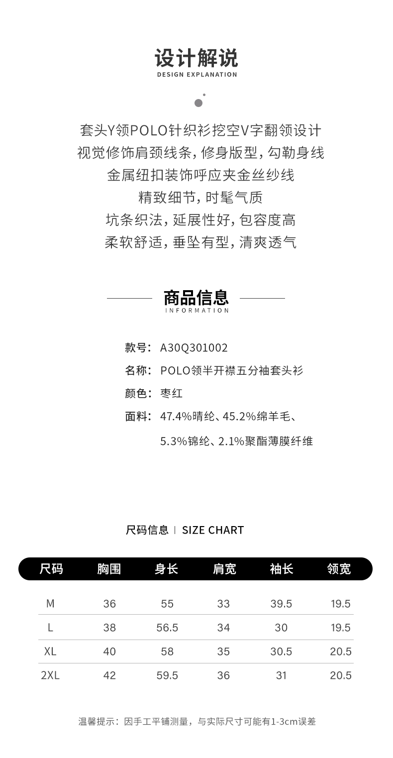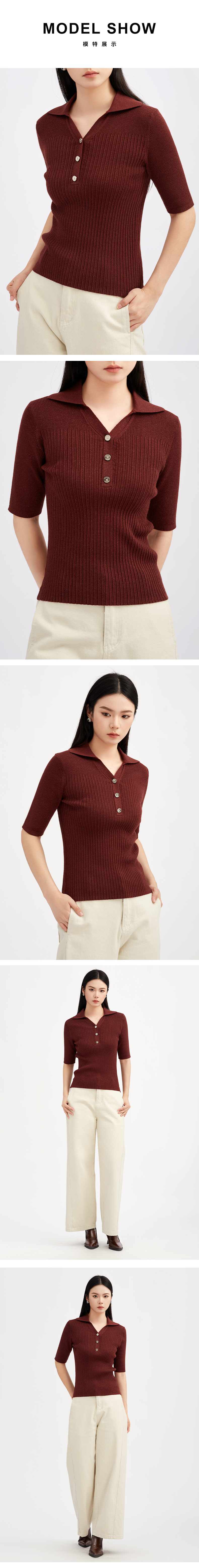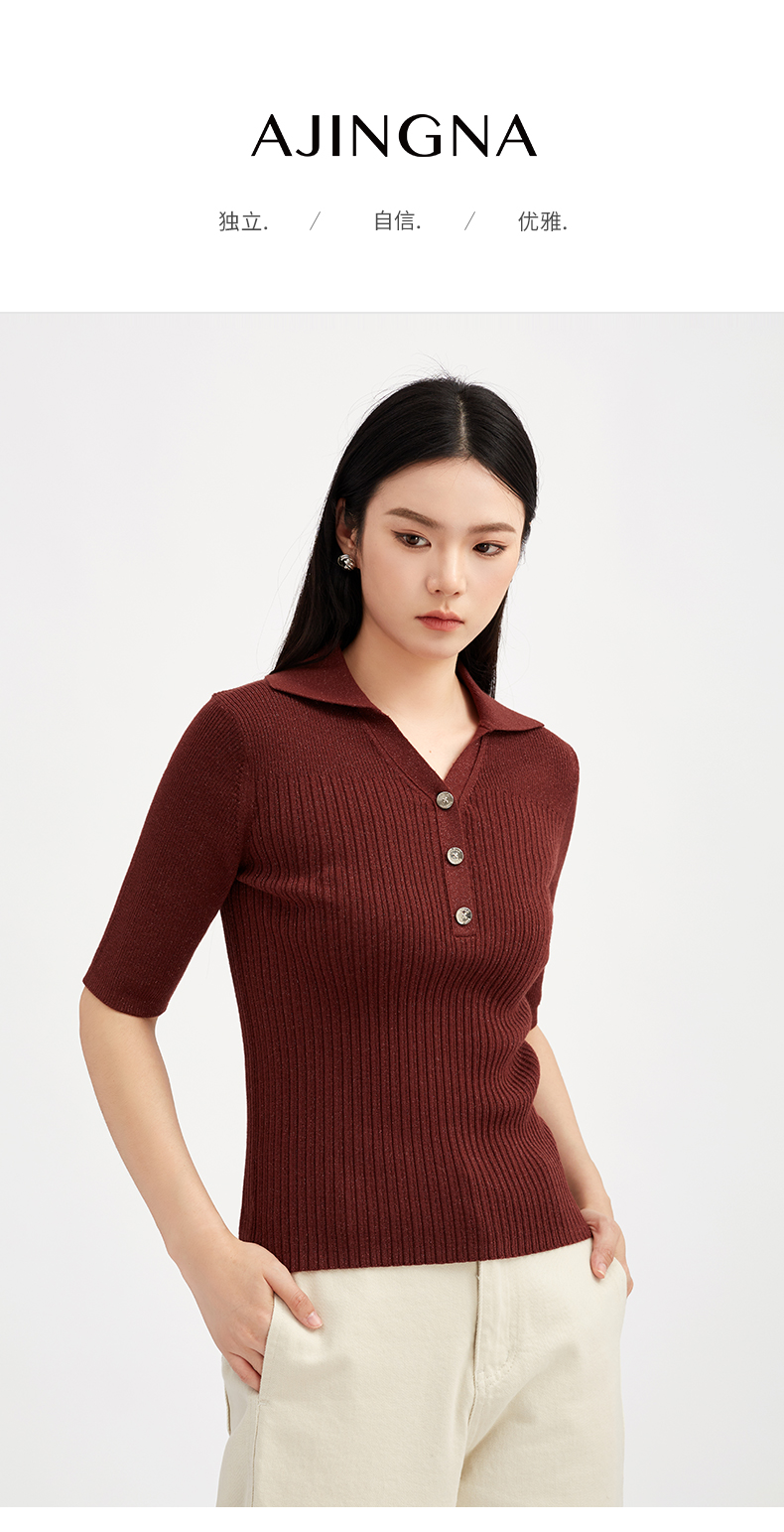 【商场同款】阿菁娜秋季新款挖空V领POLO衫夹金丝坑条针织衫金属扣修身显瘦A30Q301002
