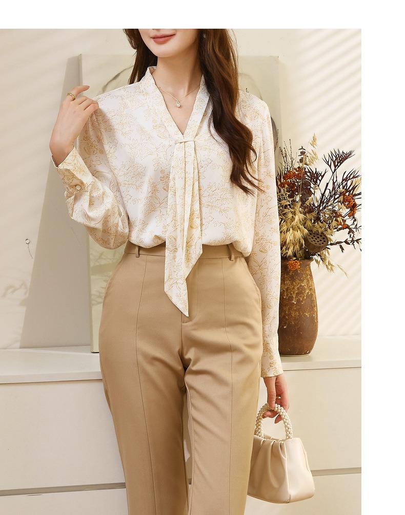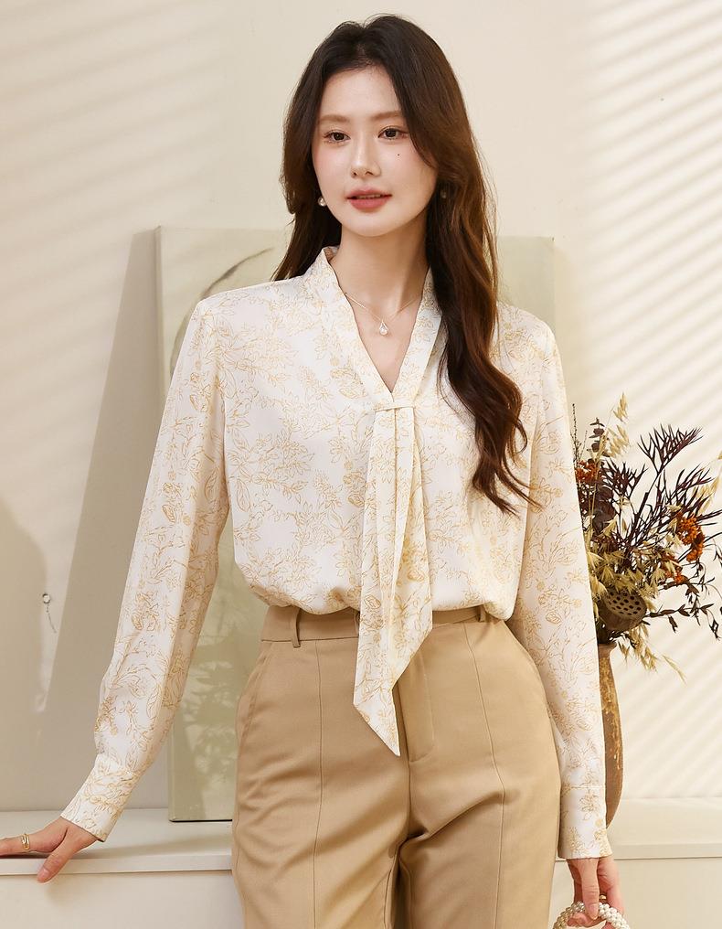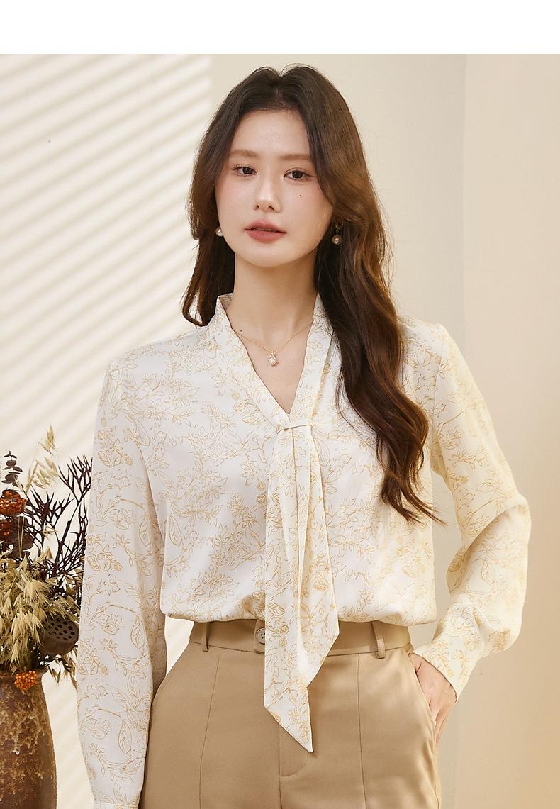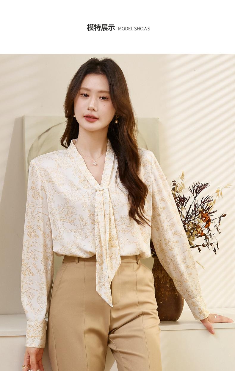 百姿 秋意微凉V领长袖衬衫女2023早秋新款优雅名媛领带衬衣231223