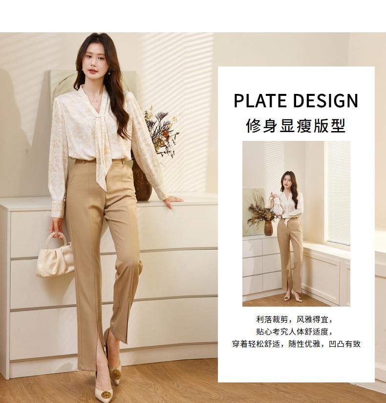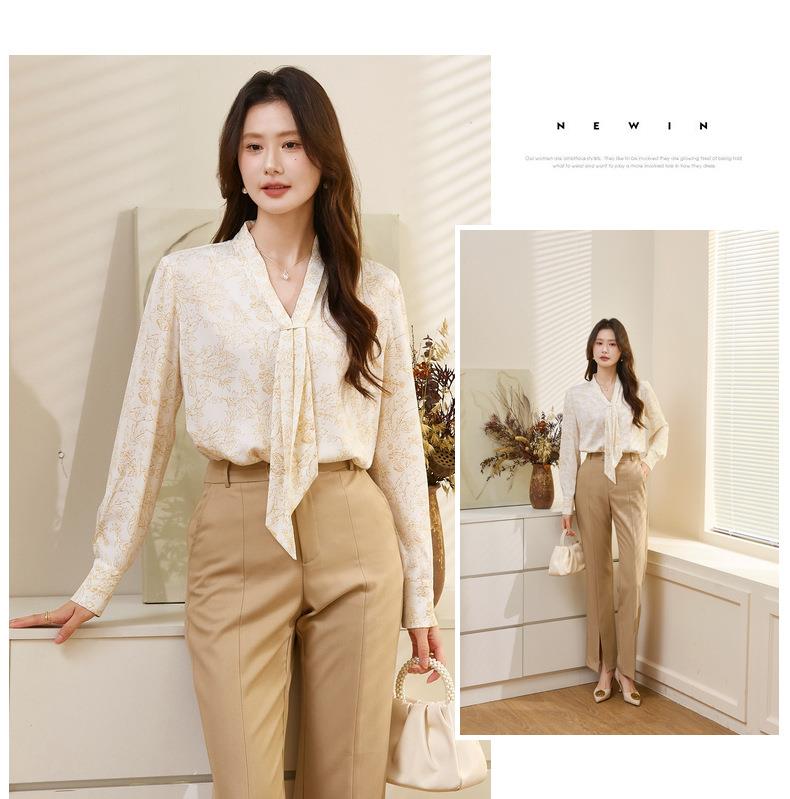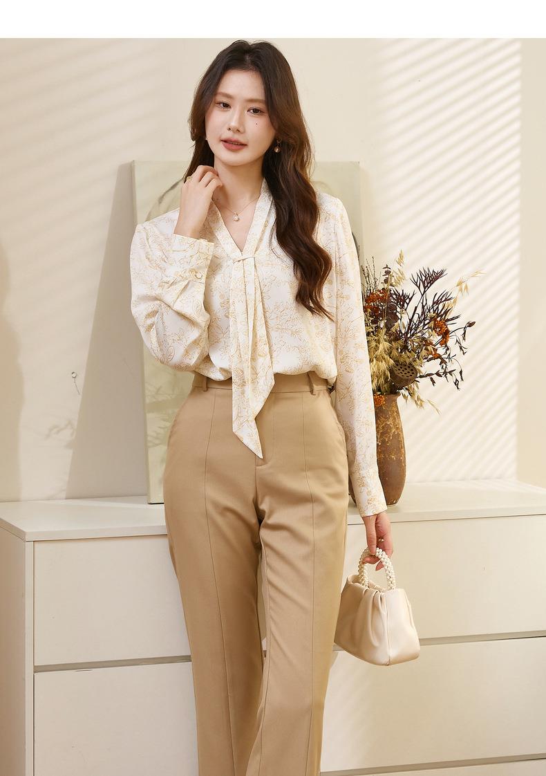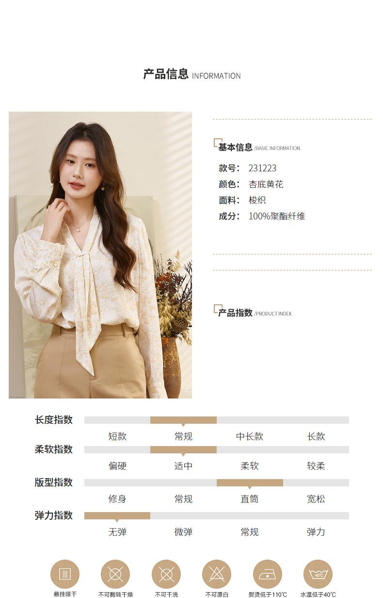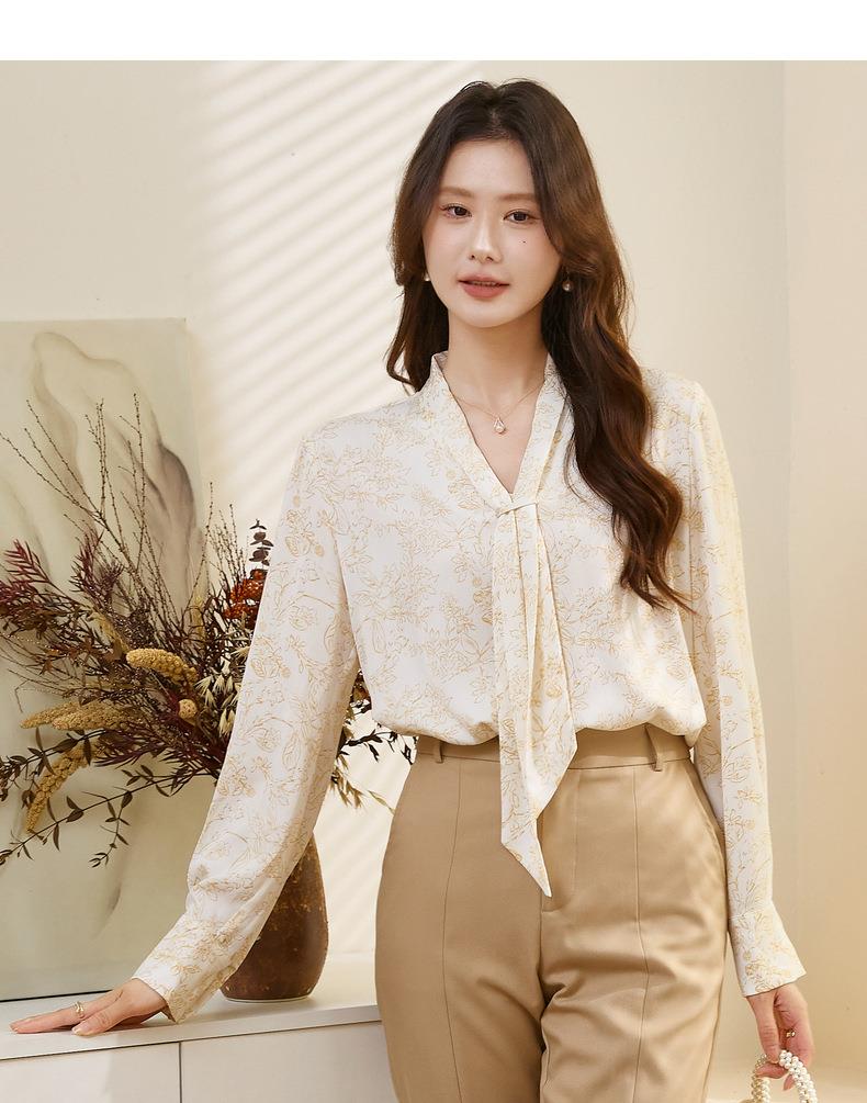 百姿 秋意微凉V领长袖衬衫女2023早秋新款优雅名媛领带衬衣231223