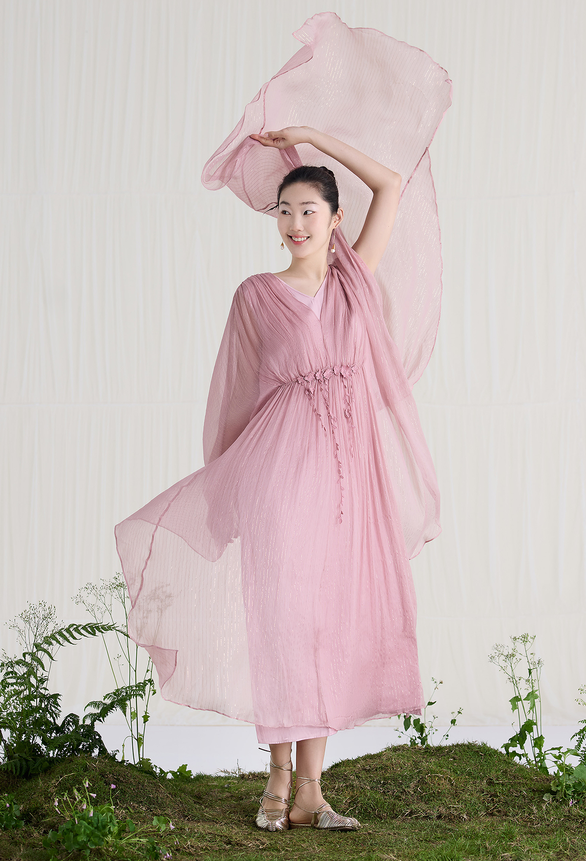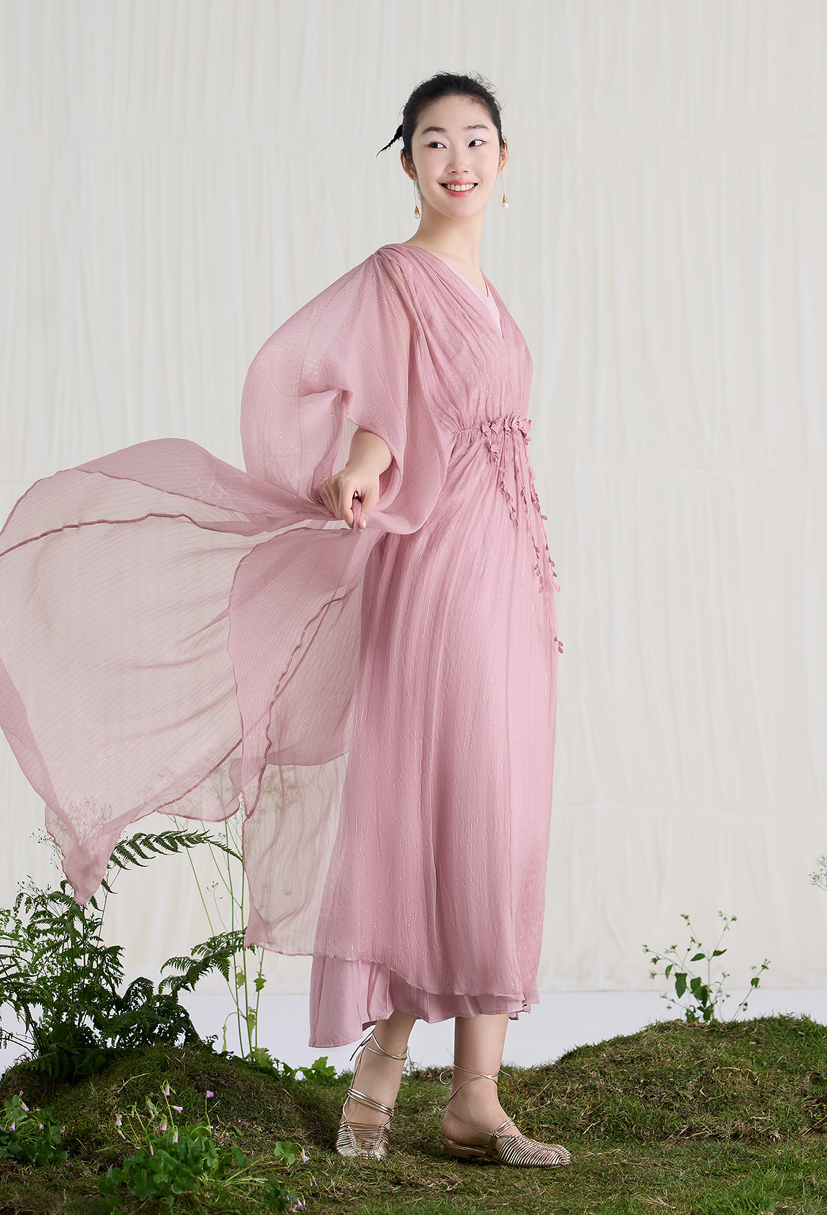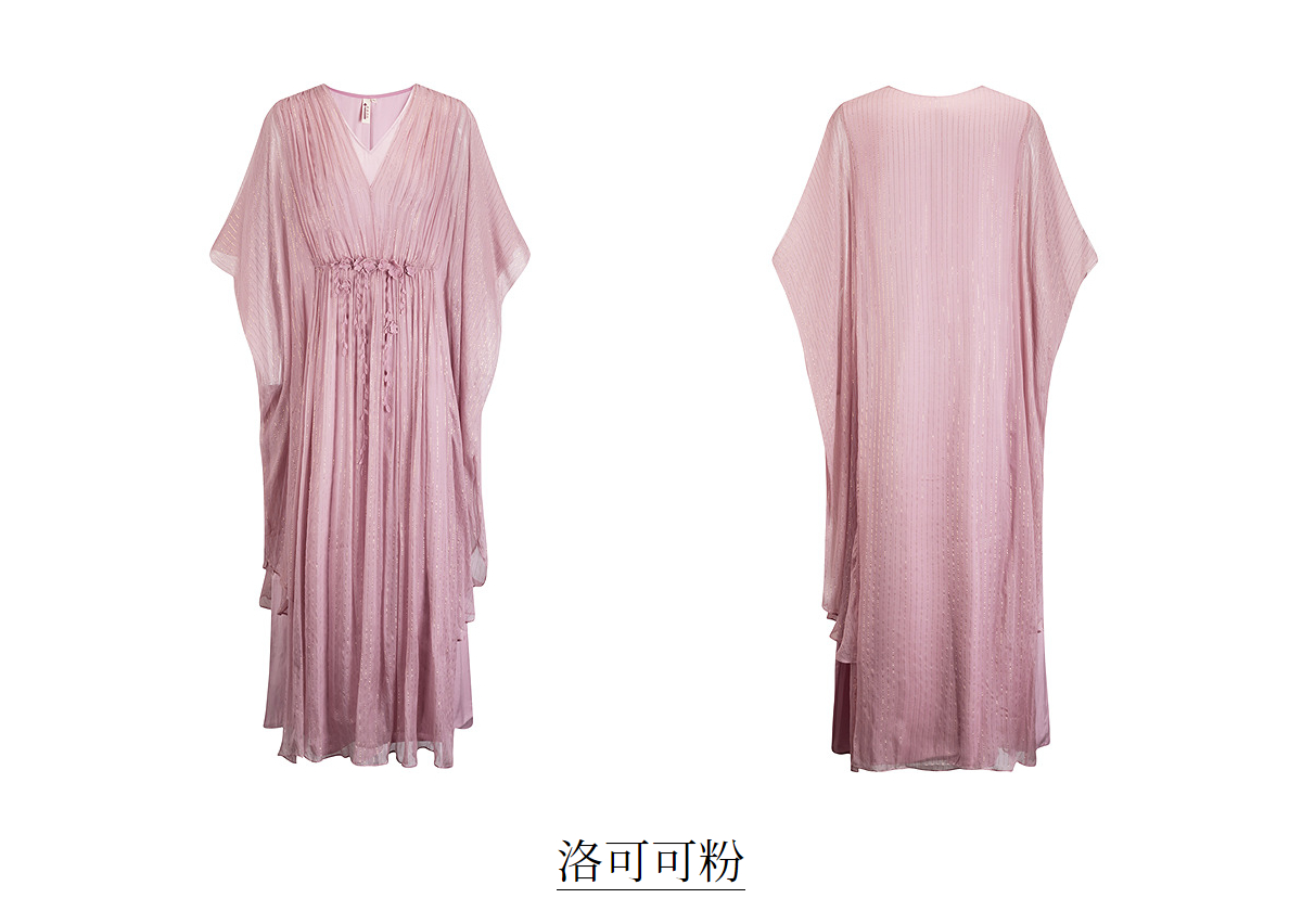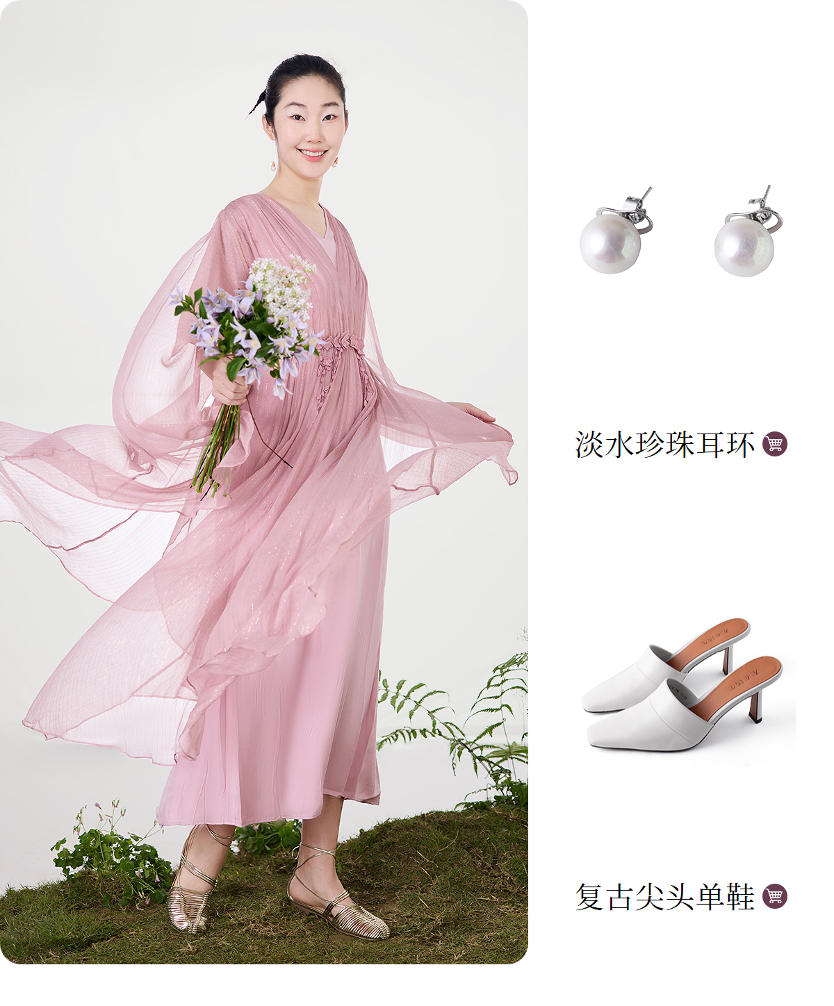 【林栖设计小店】【现货】粉色连衣裙桑蚕丝混纺金丝复古宽松2025春夏新品长裙女1933250B