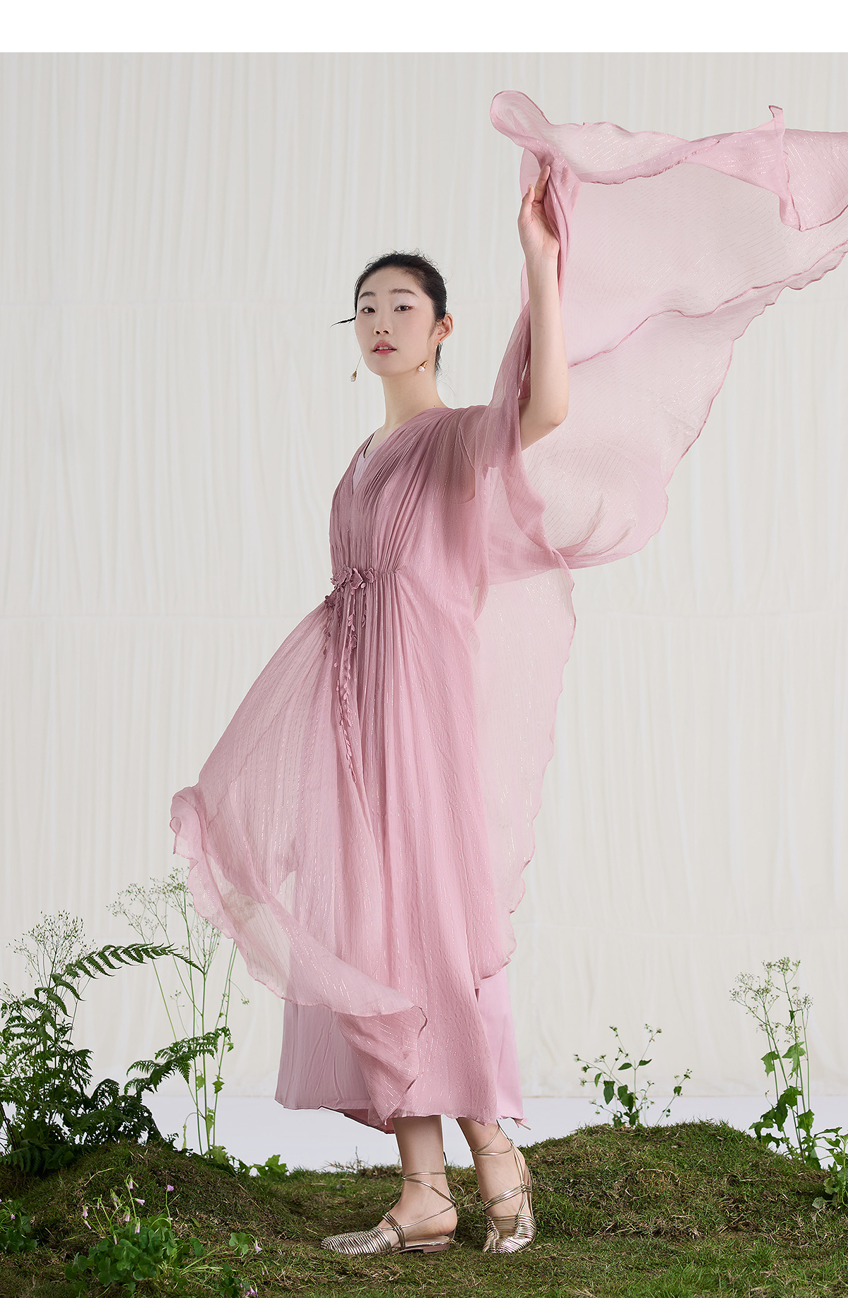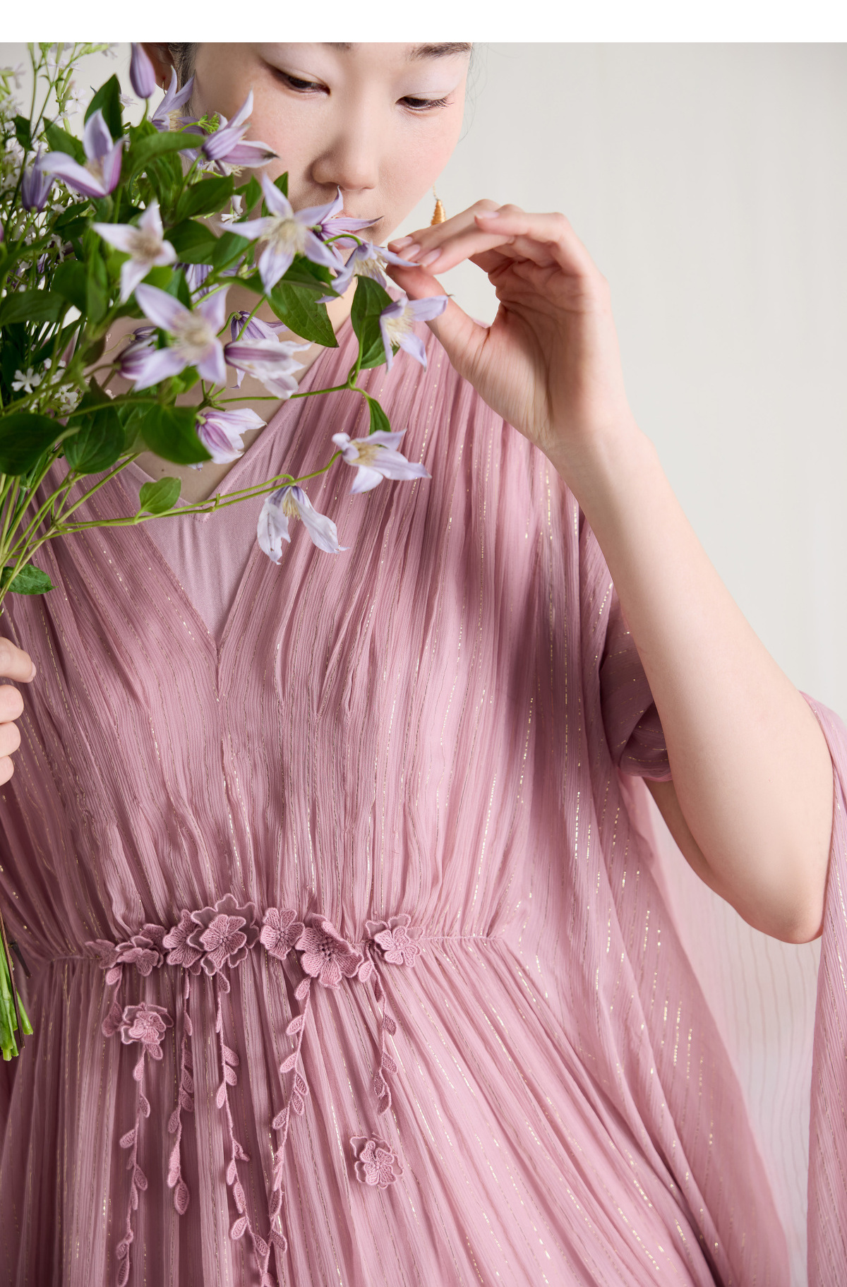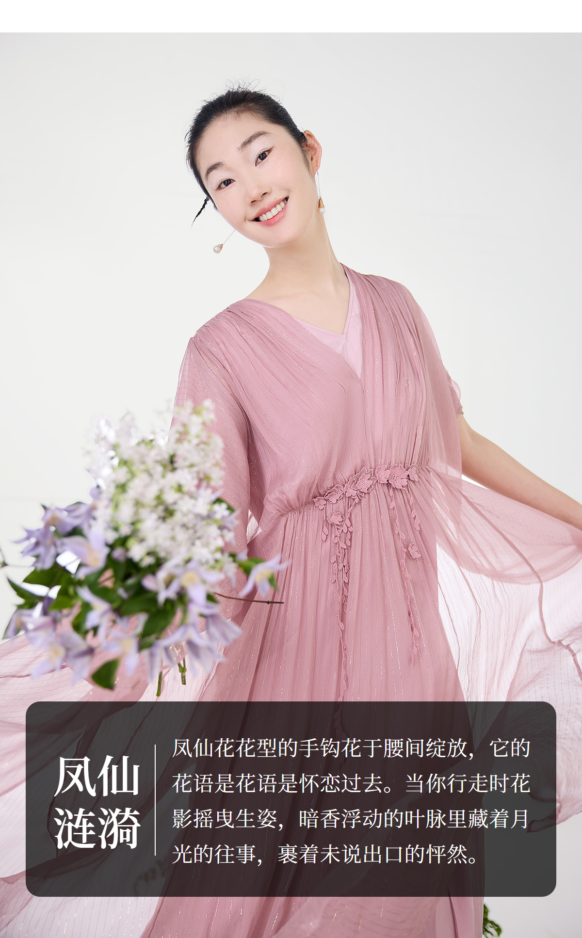 【林栖设计小店】【现货】粉色连衣裙桑蚕丝混纺金丝复古宽松2025春夏新品长裙女1933250B
