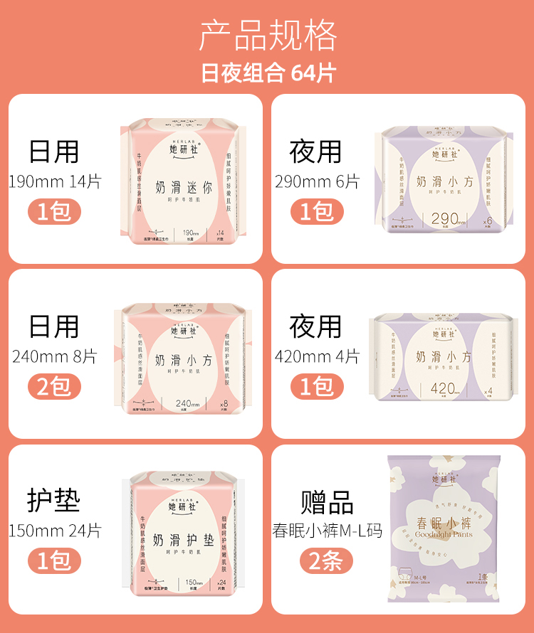 她研社奶滑小方日夜组合6包64片 送2条春眠小裤 细腻面层 高吸水性 时刻保持干爽