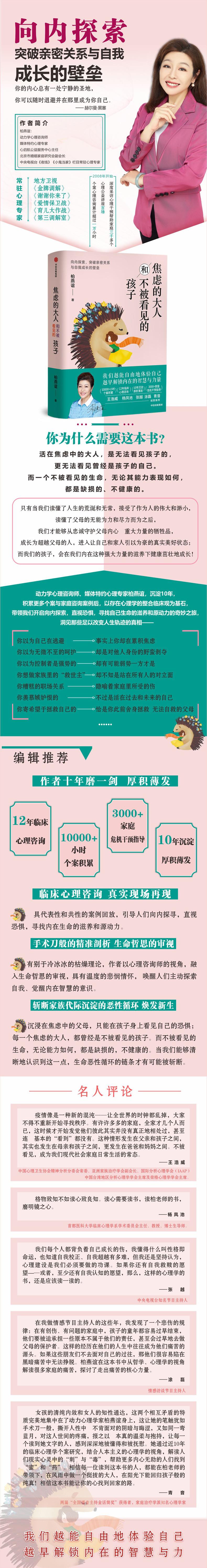2.临床心理咨询,真实现场再现 具有代表性和共性的案例回放,引导人们向内探寻,直视恐惧,寻找内在生命的滋养和源动力。 3.手术刀般的精准剖析,生命哲思的审视 有别于冷冰冰的枯燥理论,作者以心理咨询师的视角,融入生命哲思的审视,具有温度的悲悯情怀,唤醒人们主动探索自我、觉醒内在智慧的意识。 4.斩断家族代际沉淀的恶性循环,焕发新生 沉浸在焦虑中的父母,只能在孩子身上看见自己的恐惧;每一个焦虑的大人,曾经是不被看见的孩子。而不被看见的生命,无论能力如何,是缺损的,不健康的。当我们能够清晰地认识到这些,生命恶性循环的链条才有可能被斩断。