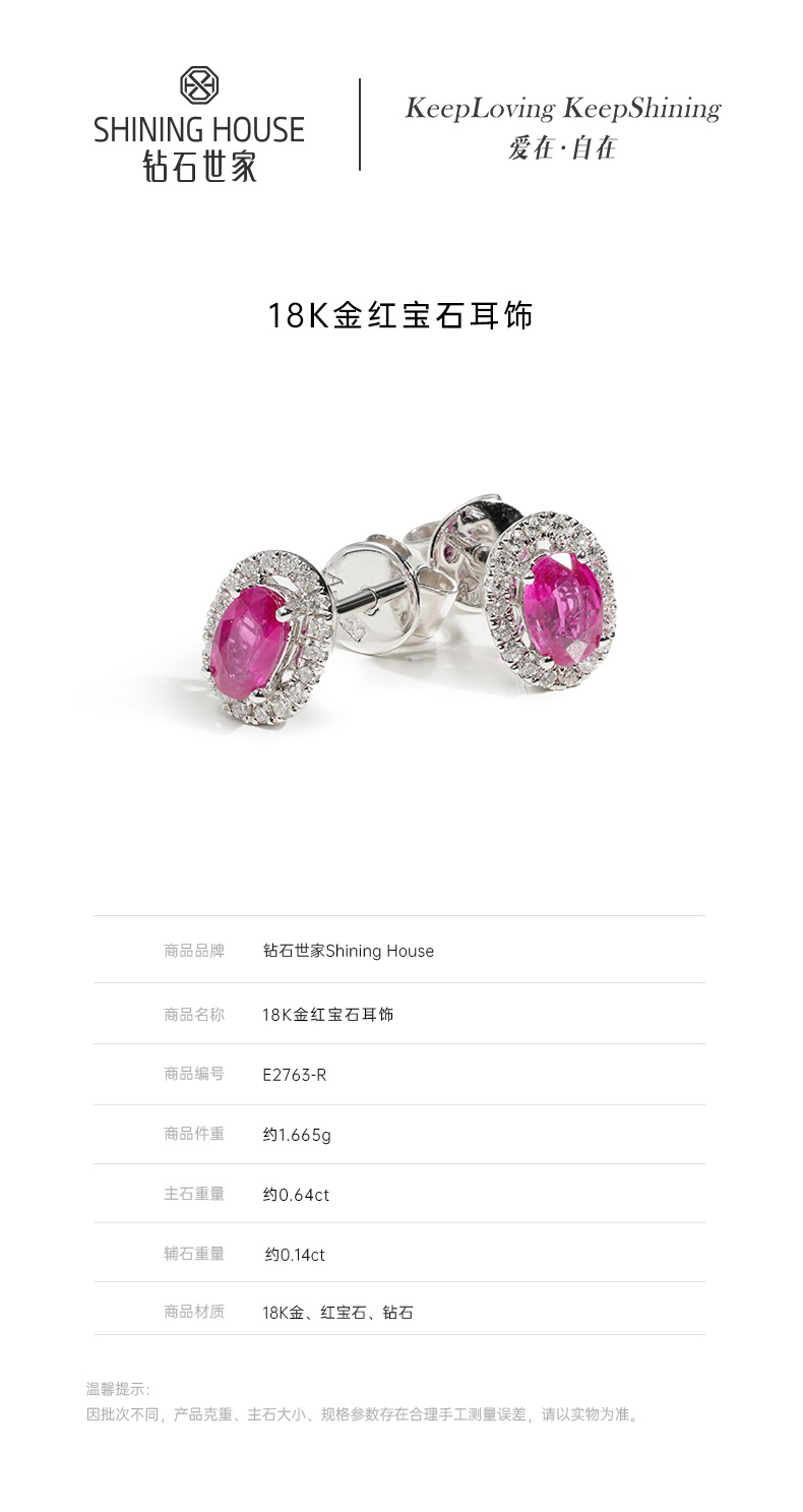 【红宝石耳饰】钻石世家 18K金红宝石耳饰耳环耳钉 让人一见倾心的红宝石 演绎女性的高贵柔情 也寓意着浪漫炙热的美好感情