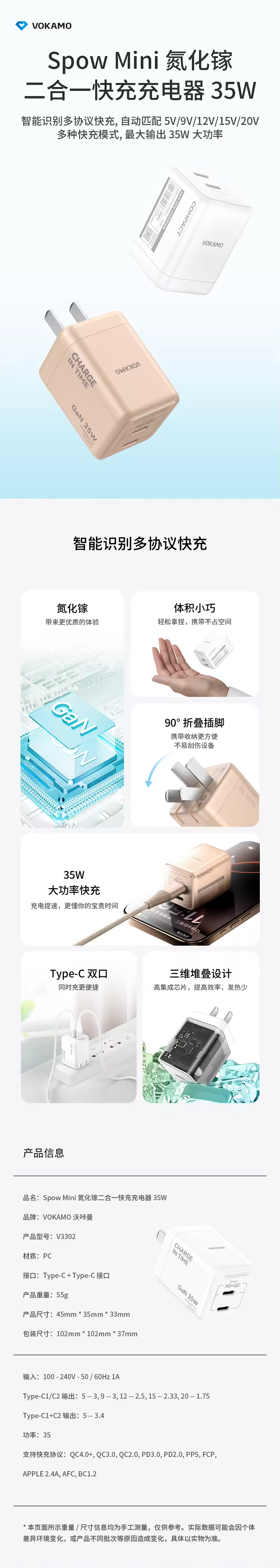 VOKAMO 沃咔曼 Spow Mini GaN Type-C双口充电器