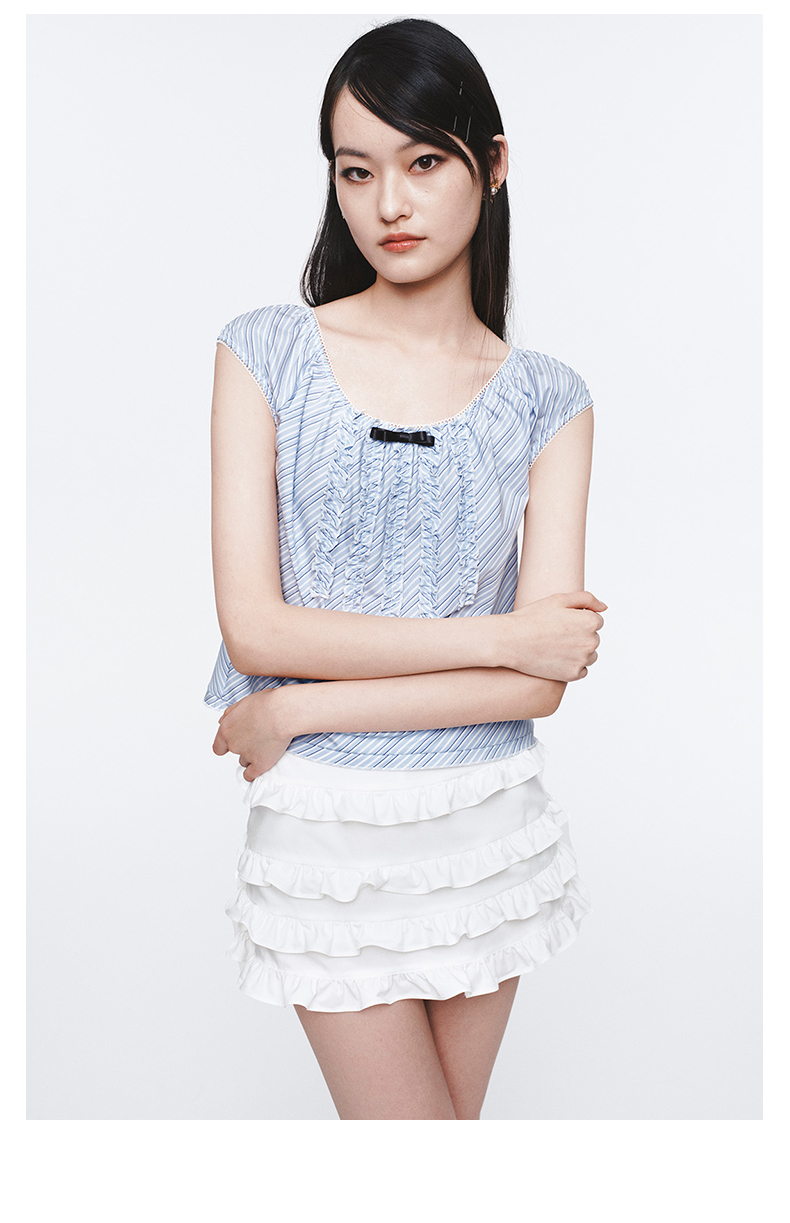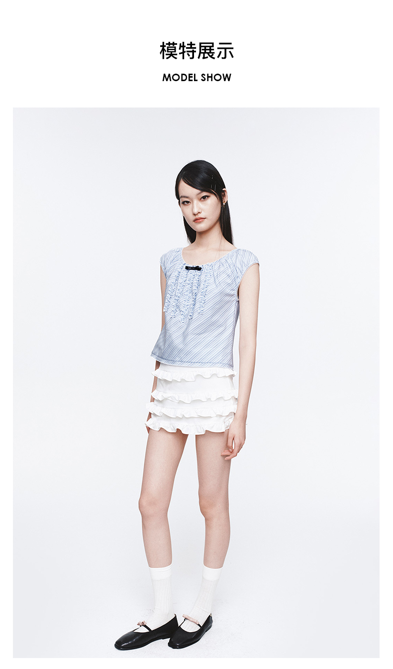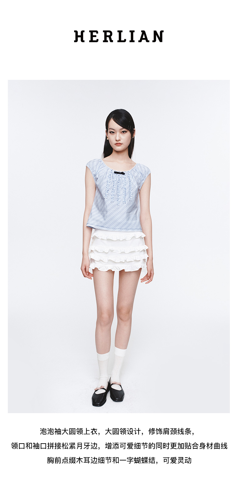 HERLIAN 2025夏季新品女士木耳边设计斜条纹小上衣