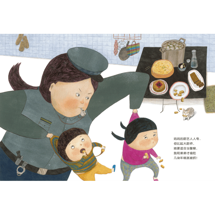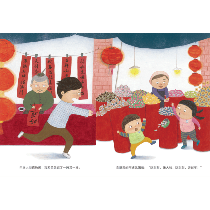 《好忙的除夕》以孩子热情参与过节,却越帮越忙的逗趣经过,搭配时而押韵的文字,将三代同堂忙碌准备过年的点滴描绘得有情有味,仿佛你我家中的过年片段,令人备感亲切熟悉。当中细腻埋设的年夜饭、花卉、糖果等,应景过年之余,更蕴含喜气洋洋的过节吉祥话——“吃甜甜,好过年”“吃鱼年年有余”“吃菜头,好彩头”——让孩子在互道恭喜、温馨团聚中,感受文化传承的祝福心意,也储存满满的过年幸福滋味。
