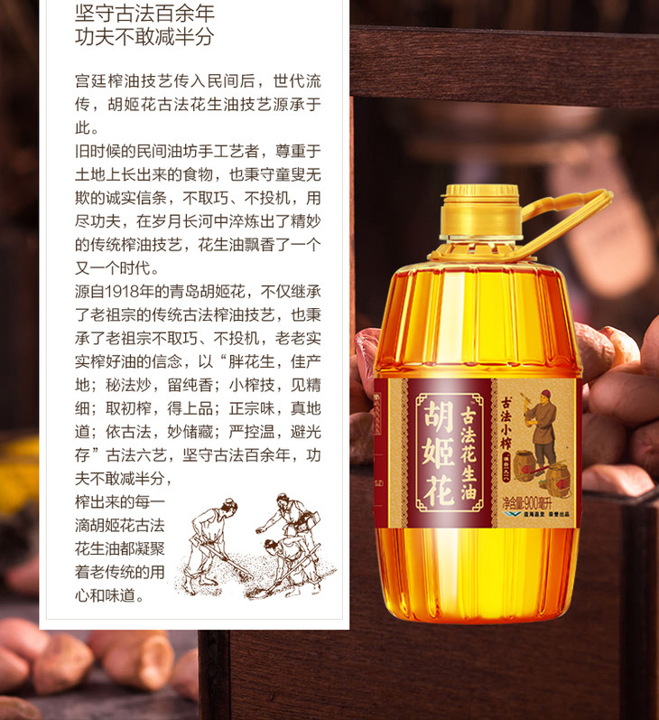 胡姬花 古法小榨花生油900ml*2瓶 食用油物理压榨 炒菜家用瓶装