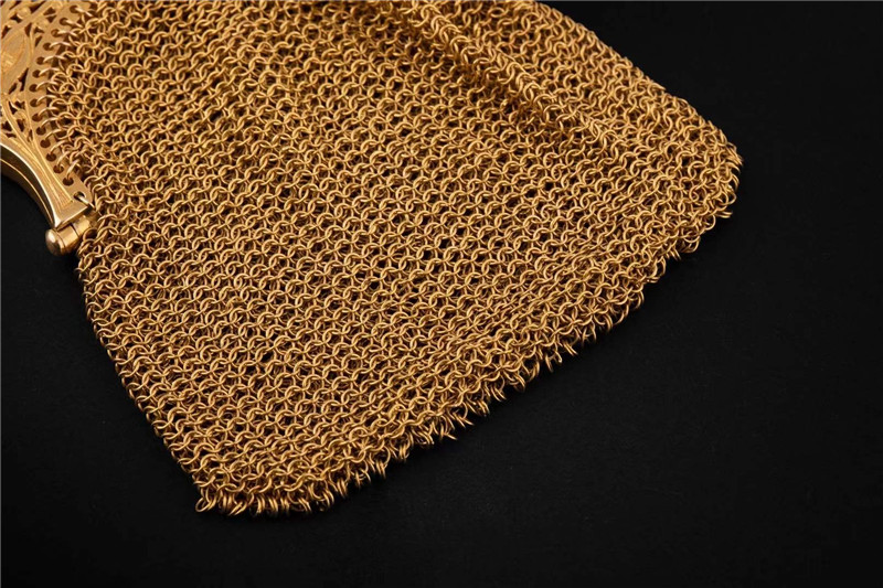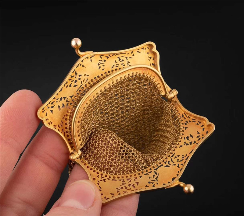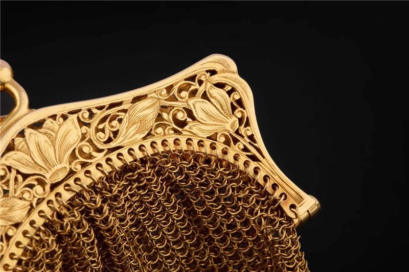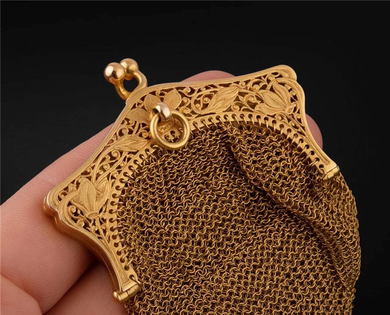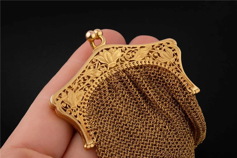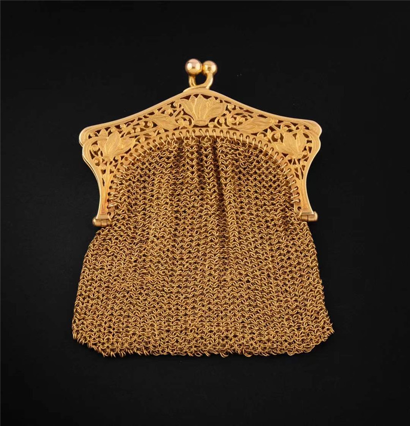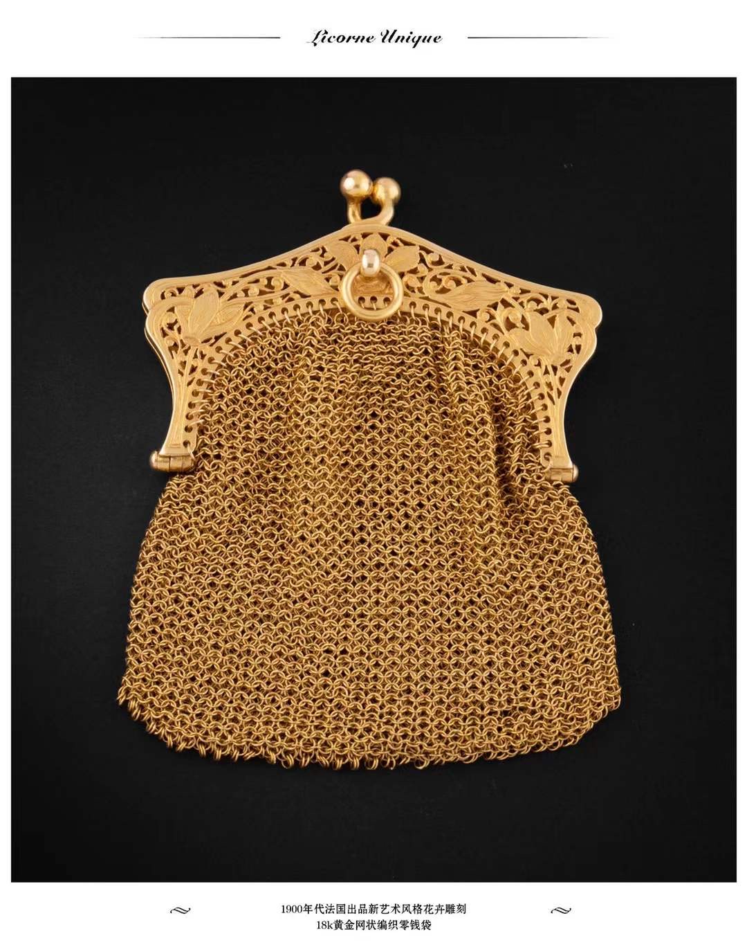 独角鹿西洋古董法国新艺术风格花卉雕刻18K黄金网状编织零钱袋