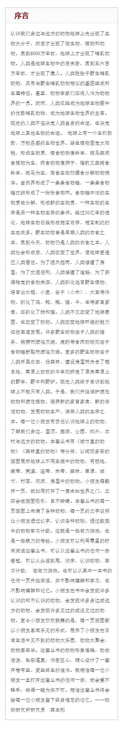 本丛书是专为3-6岁儿童精心打造的视觉益智科普游戏书。本书以大幅精美的图画向小读者展示出大自然中形形的动物,让儿童在家长的帮助下识别这些动物并简单地了解它们的习性,几乎收入了世界各地的各种动物。另外,本丛书也为儿童与家长提供了互动游戏,在图画中寻找特定的动物或是寻找数量的某种动物。本丛书不仅增长了孩子的科普知识、让孩子了解许许多多的动物,而且还能锻炼儿童的观察力、培养儿童的耐心、使学前儿童的脑海里形成数的概念。此外,亲子互动游戏也更加促进了儿童与父母的感情交流,,增加了家庭的凝聚力,让亲情得以升华。
