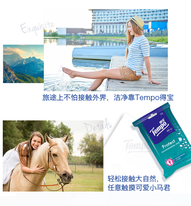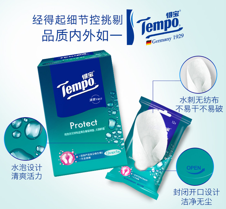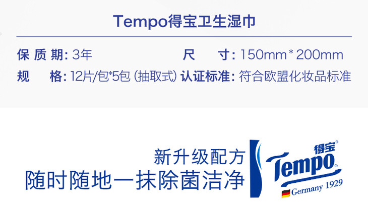 【吴亦凡同款】Tempo得宝卫生湿巾12片/包x5包盒装 便携装湿纸巾纸柔湿巾