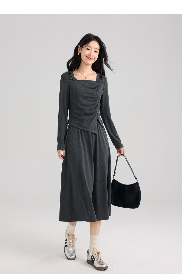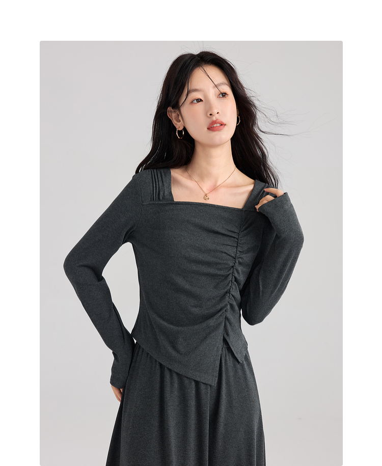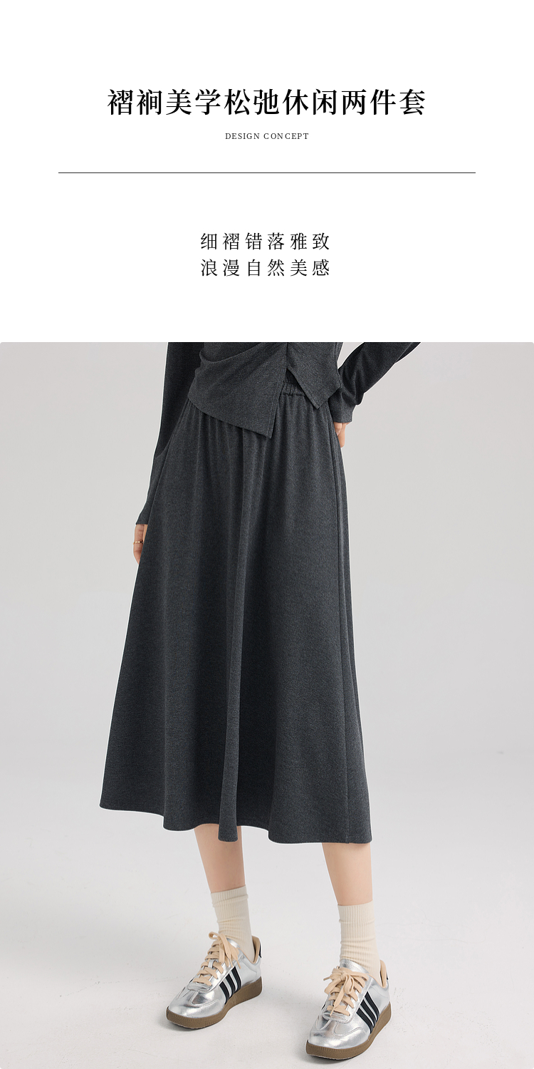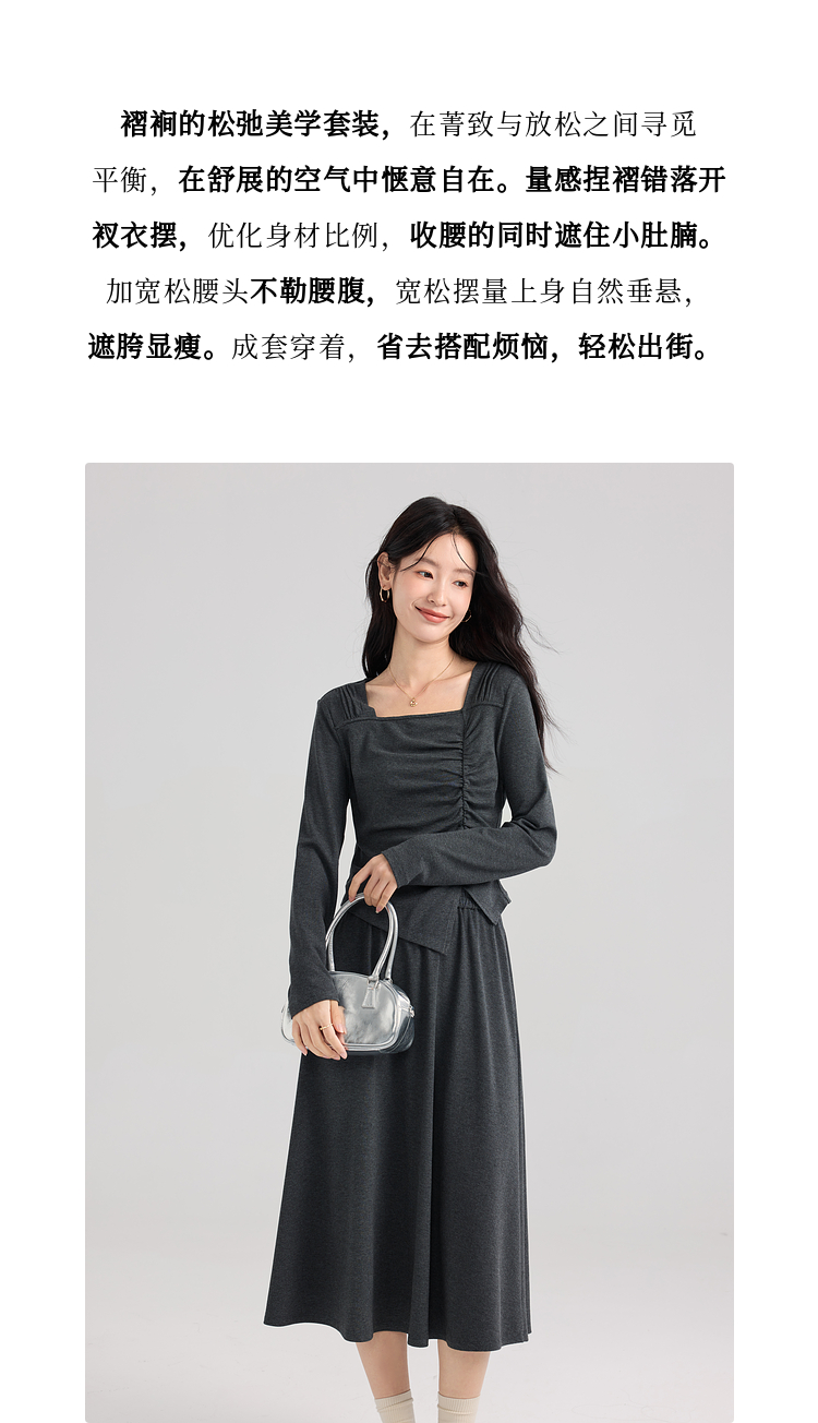 【专属特价】熙世界秋季穿搭一整套新款休闲捏褶针织方领上衣半身裙两件套装