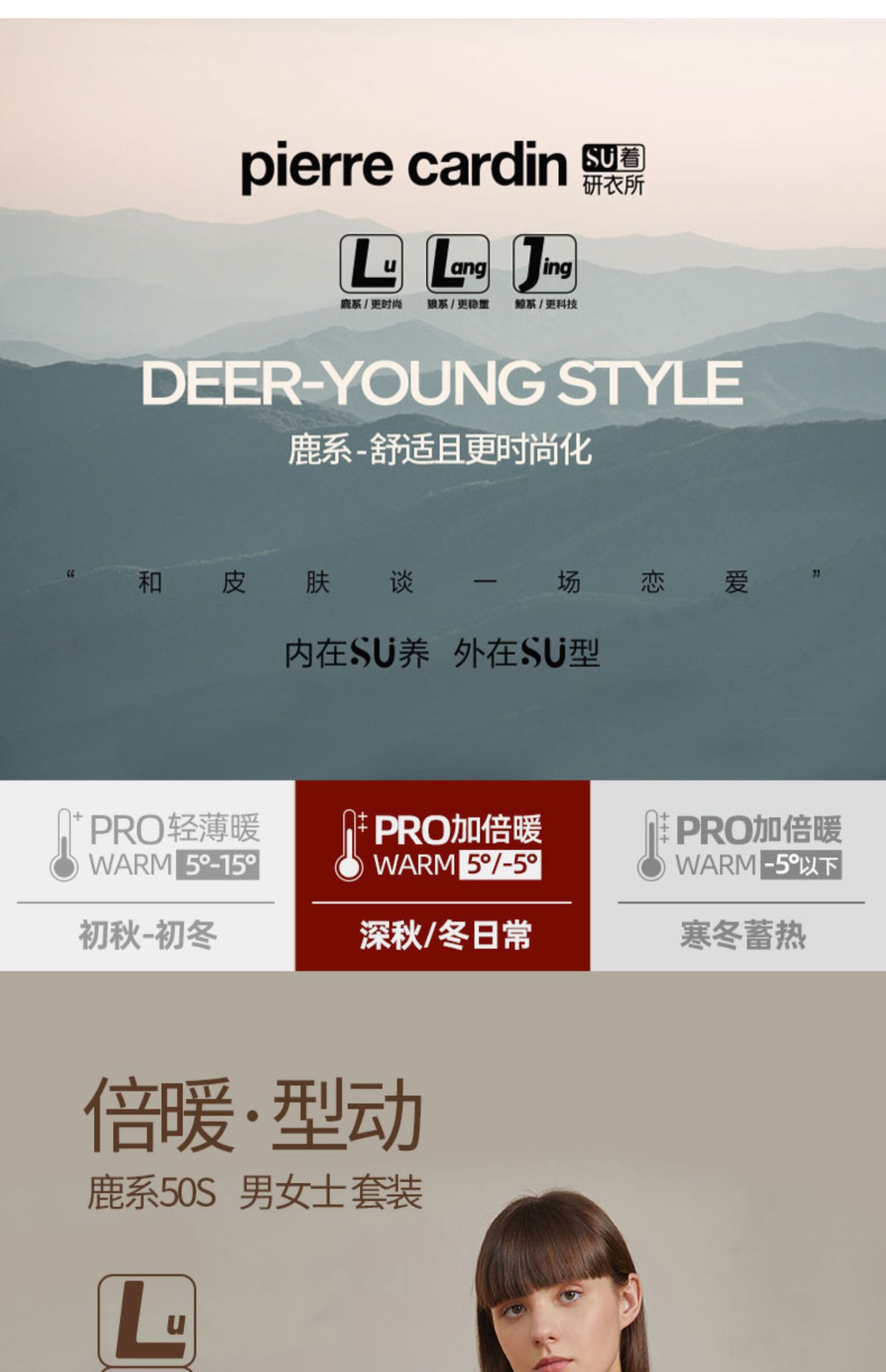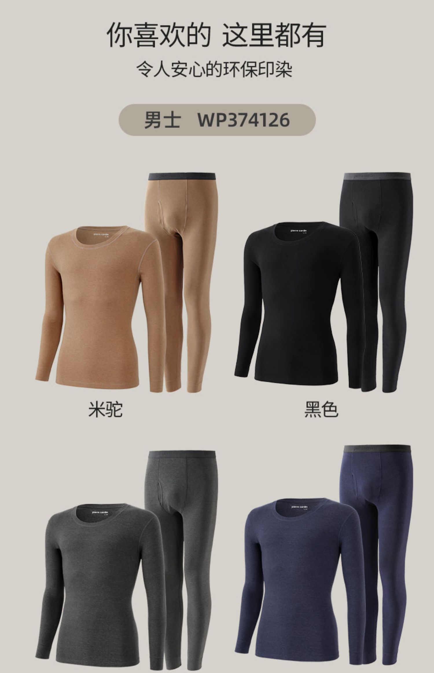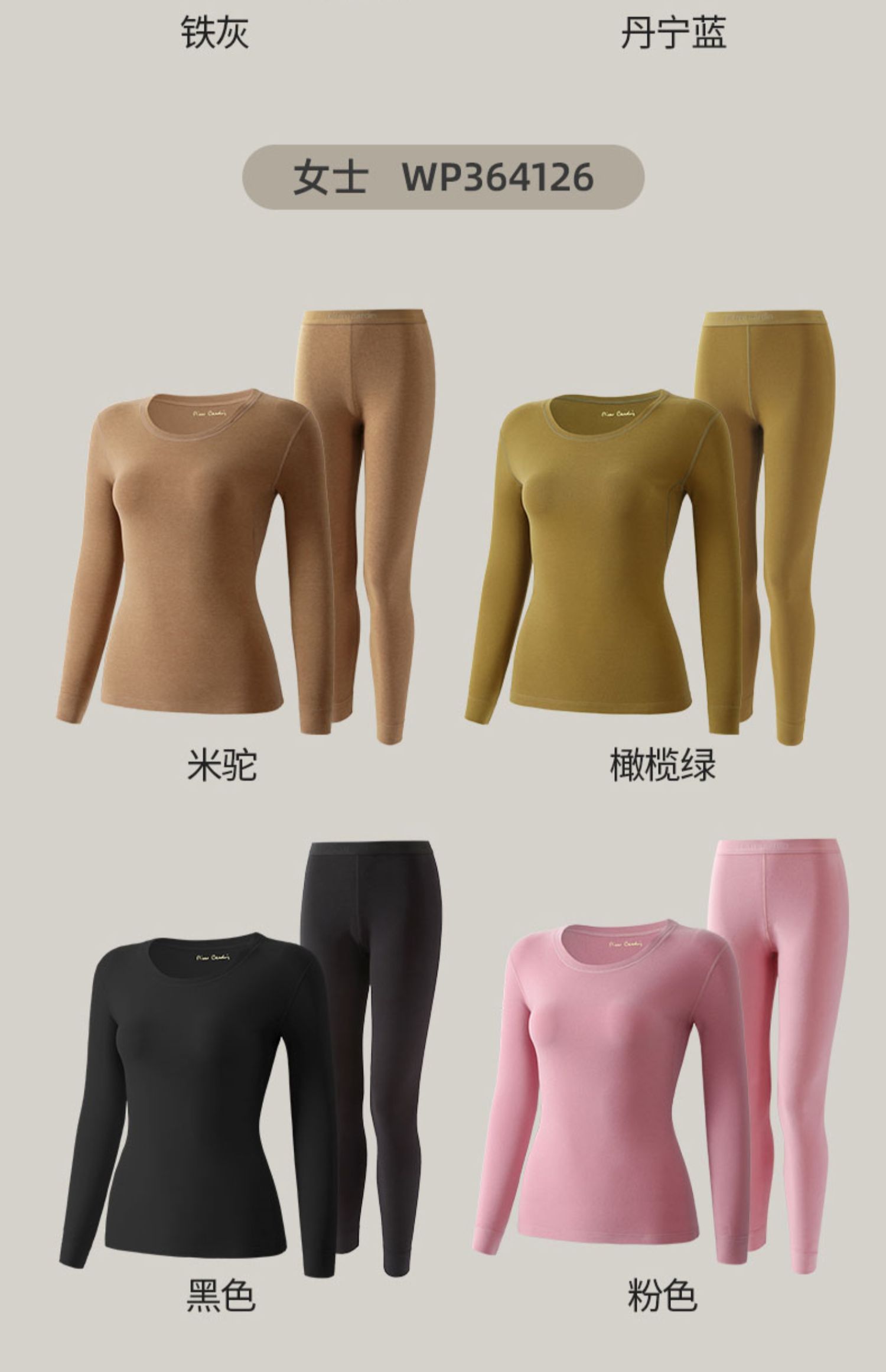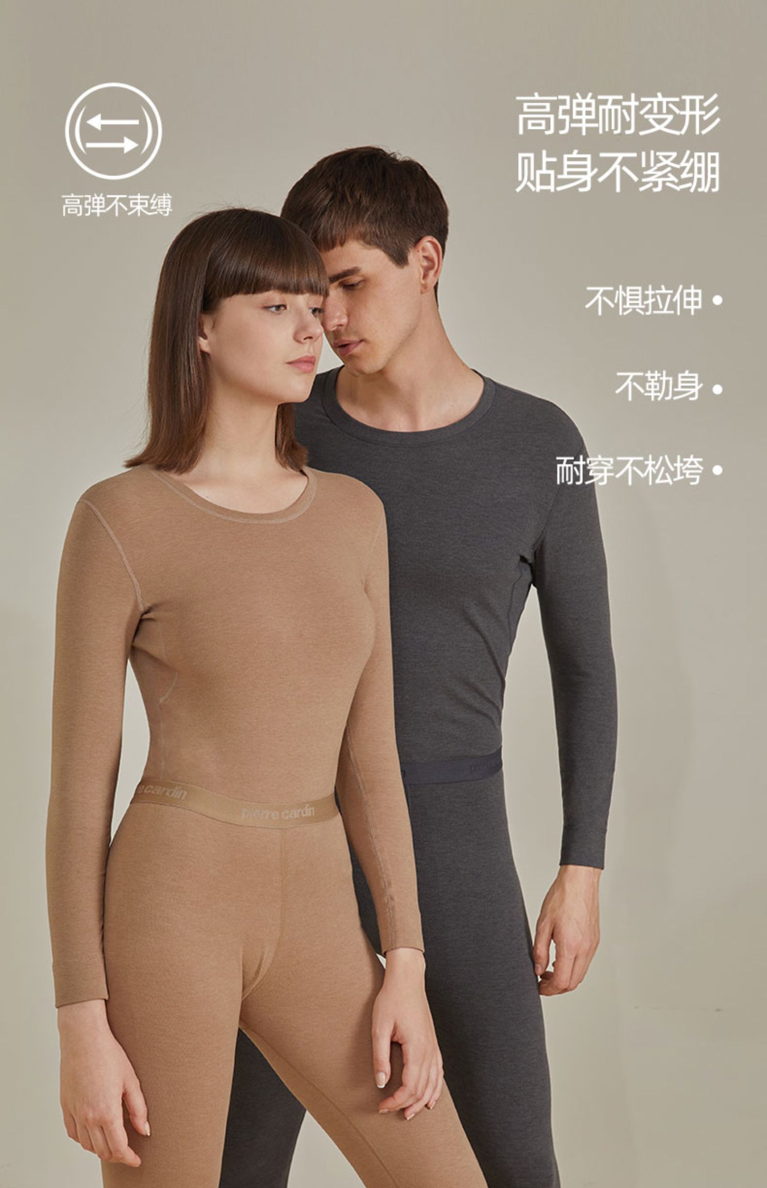 皮尔卡丹男女士保暖套装罗纹布保暖内衣秋衣秋裤圆领双面碳素磨绒WP374126/WP364126