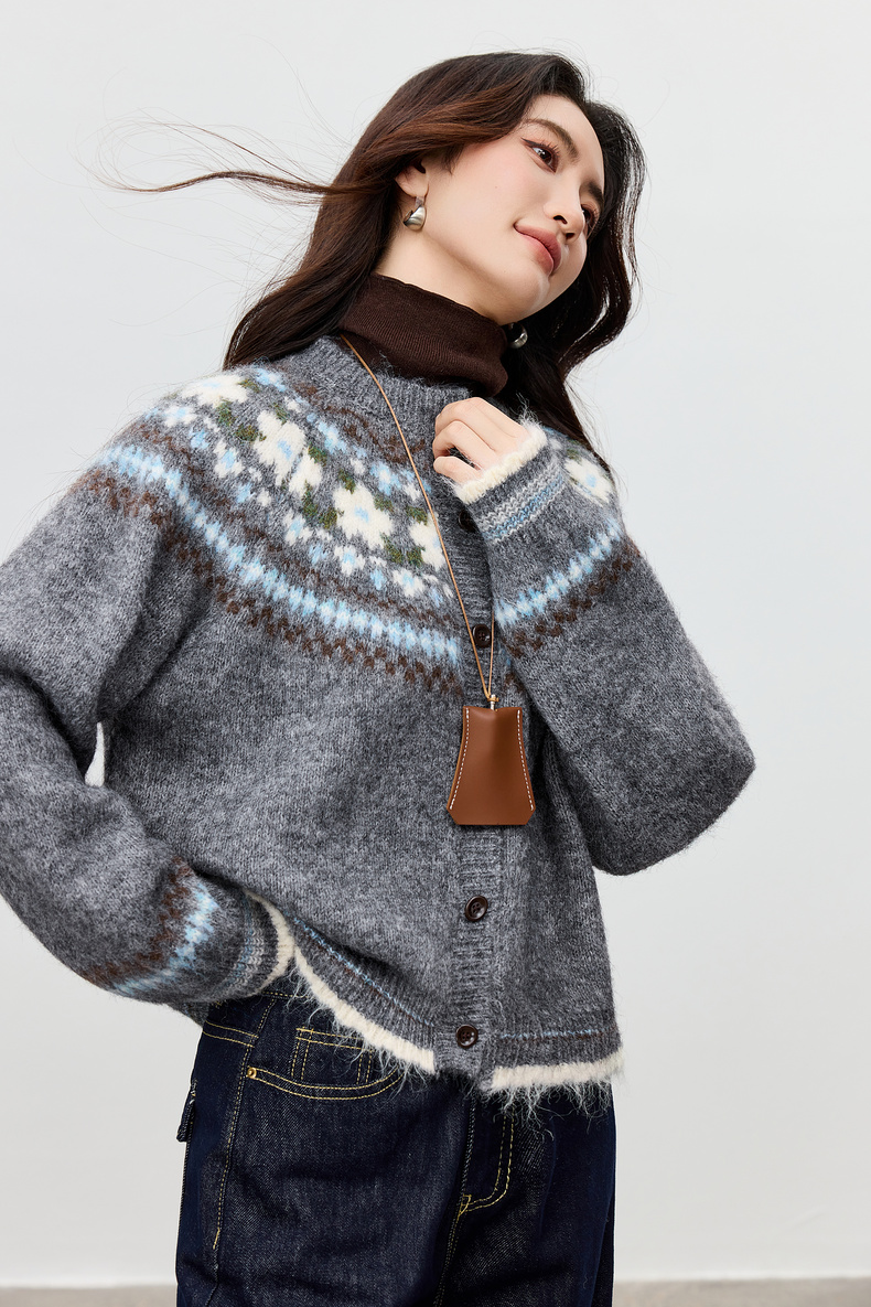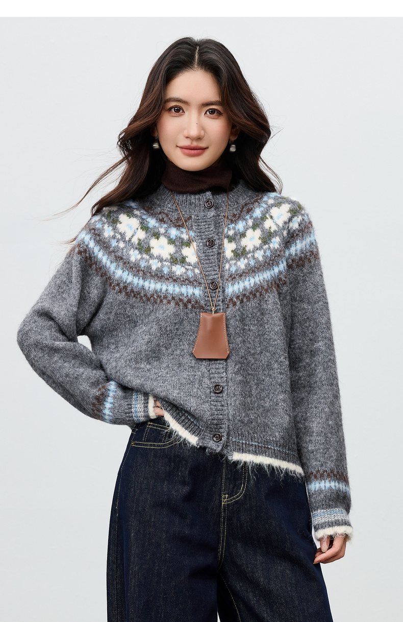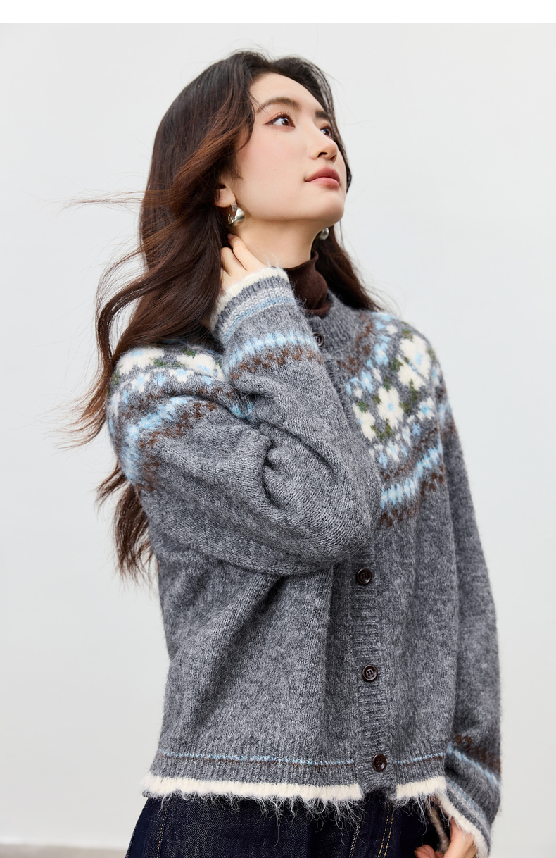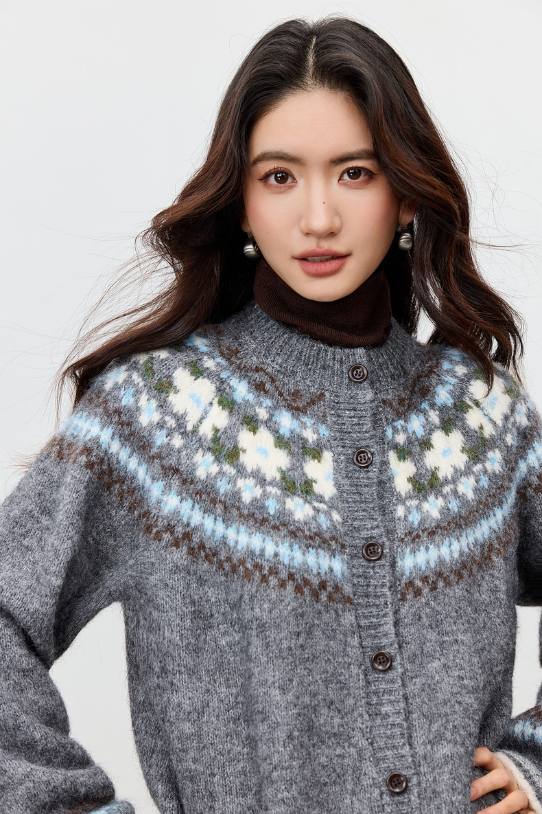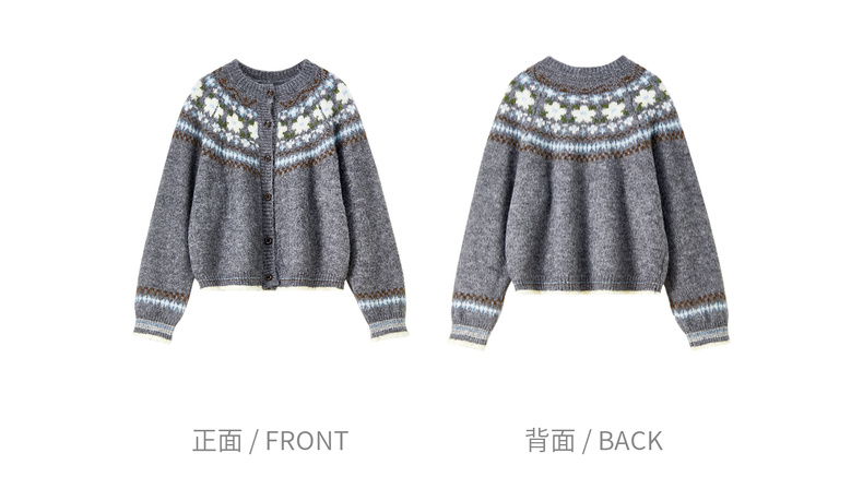 【内购】【费尔岛提花图案】圆领单排扣插肩袖含绵羊毛软糯弹力开衫毛衣-W54EB3649