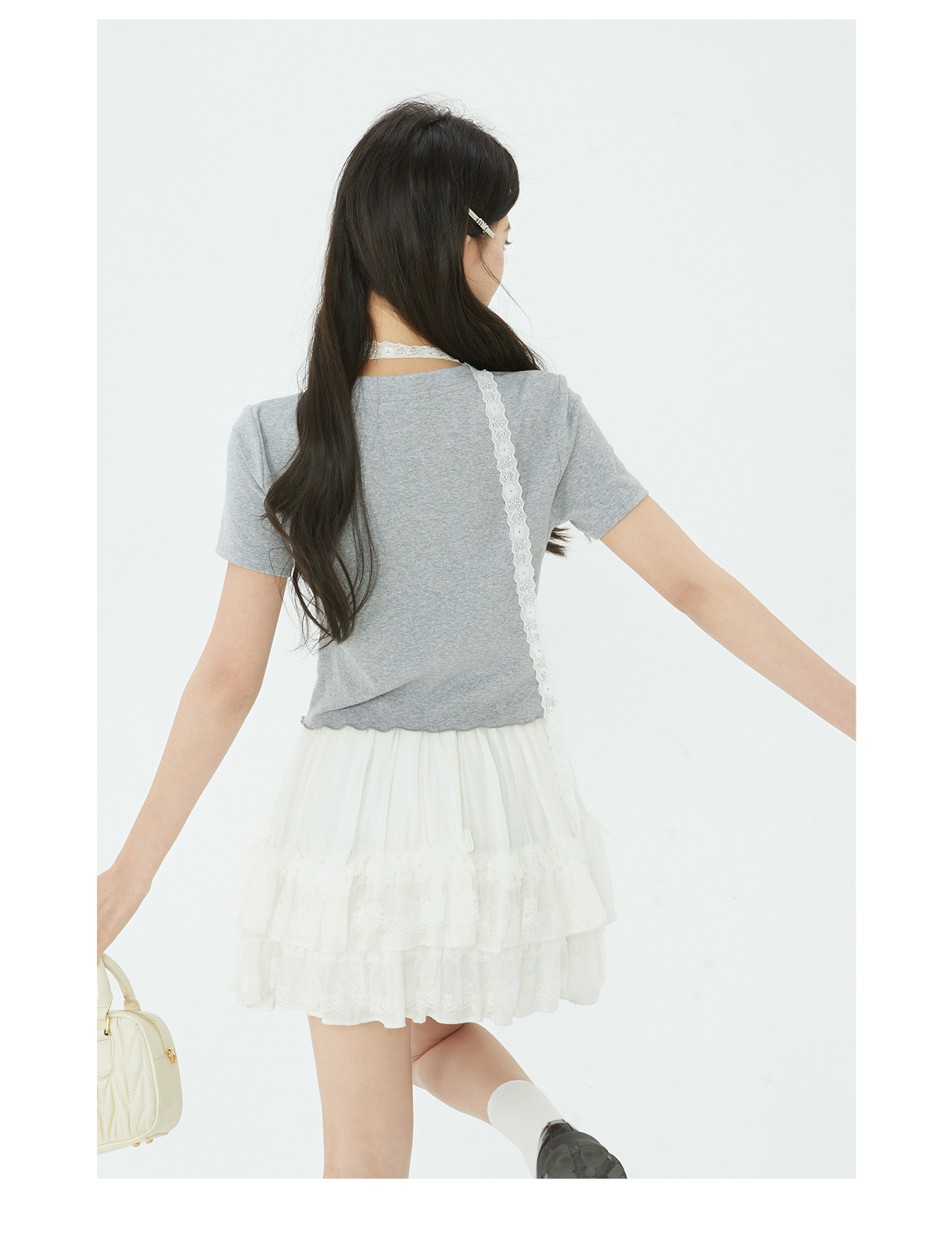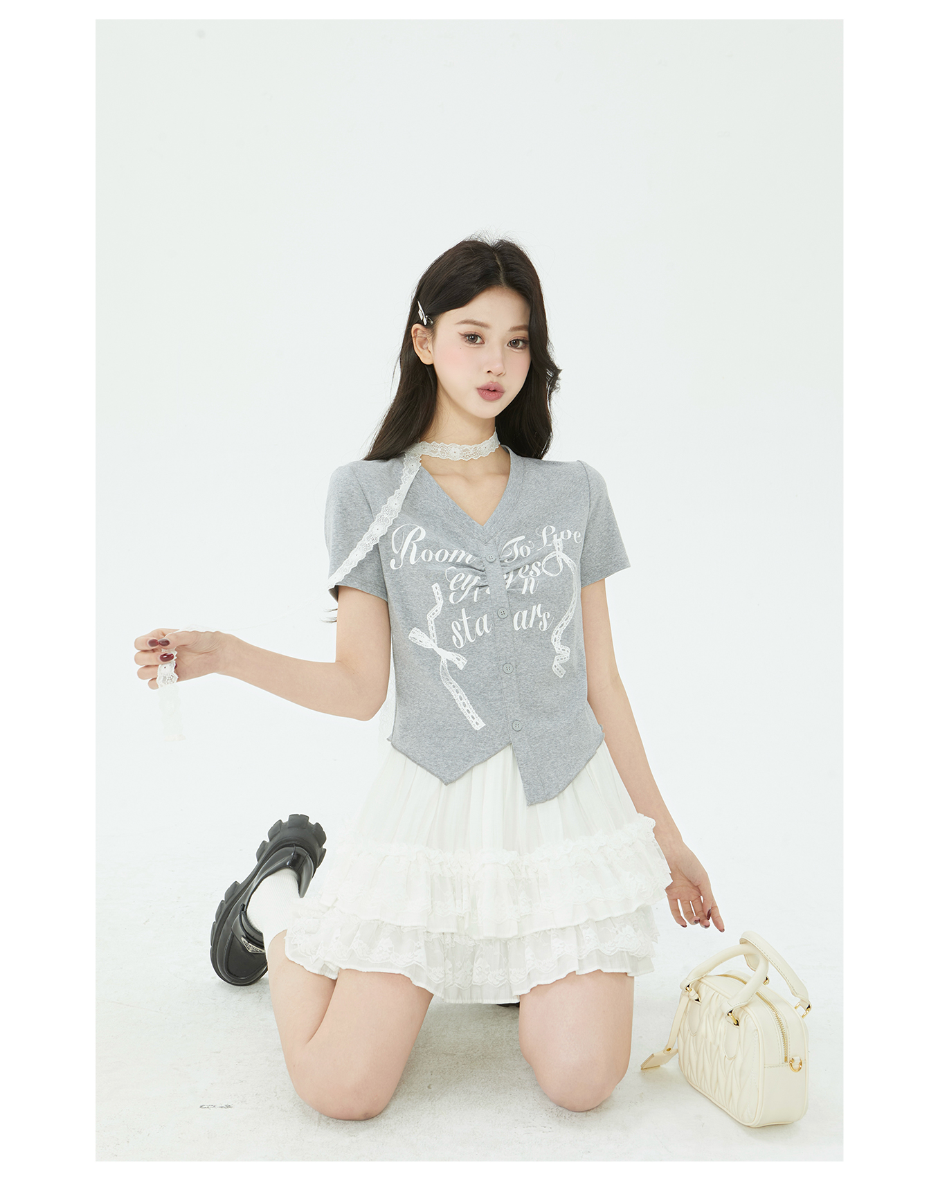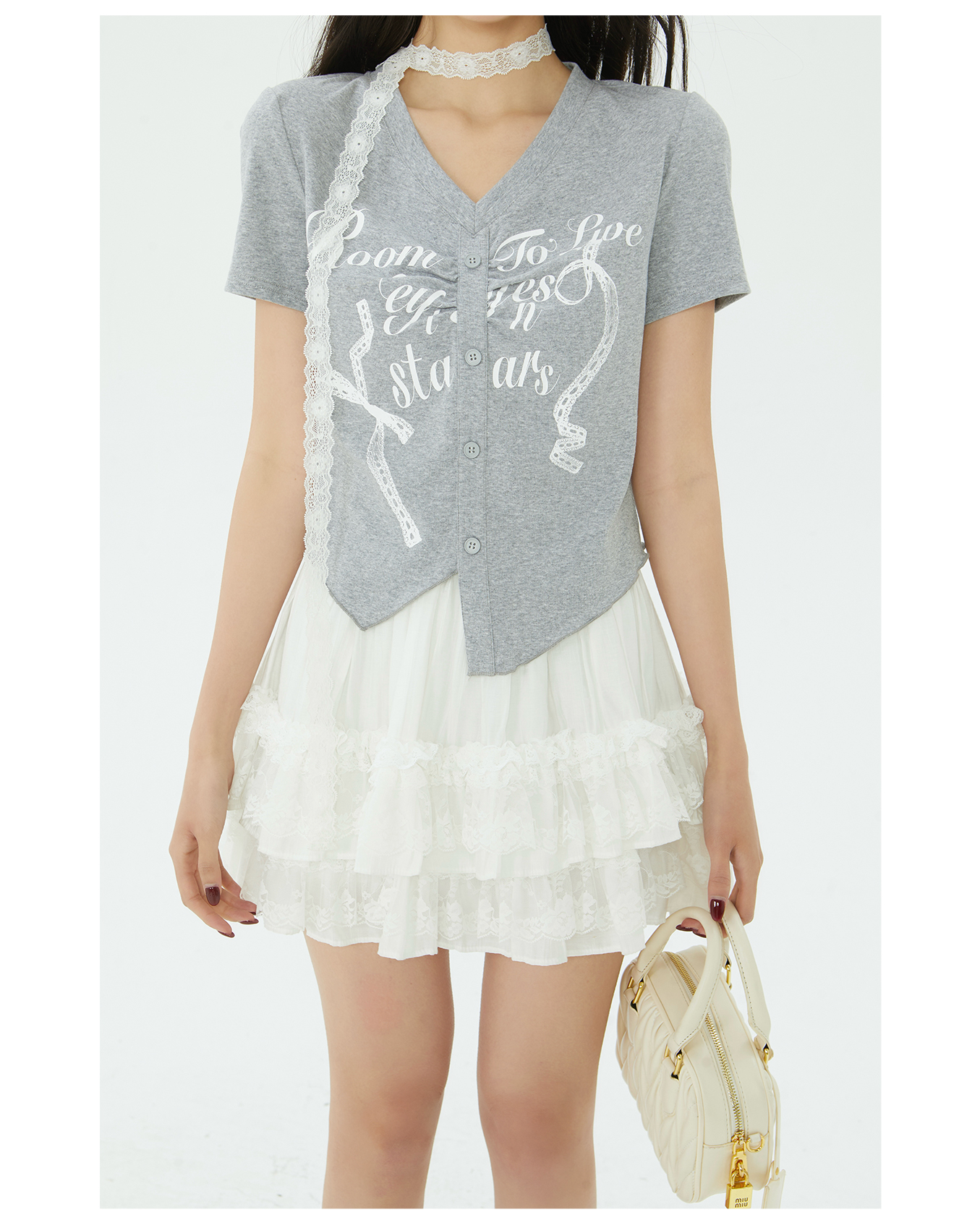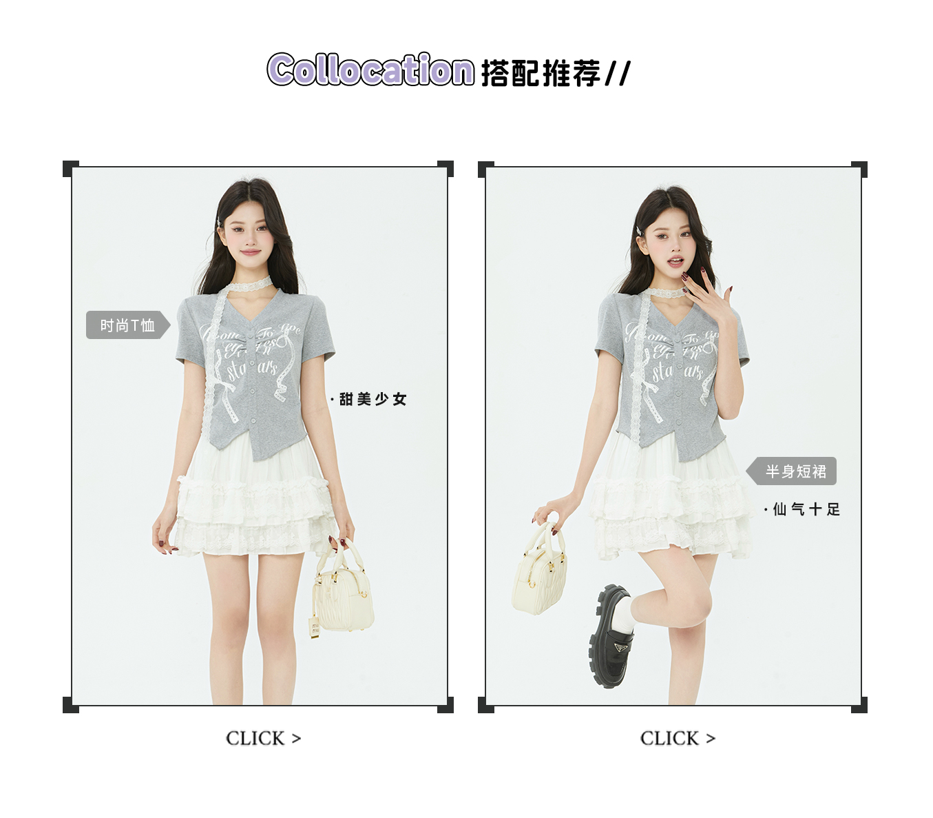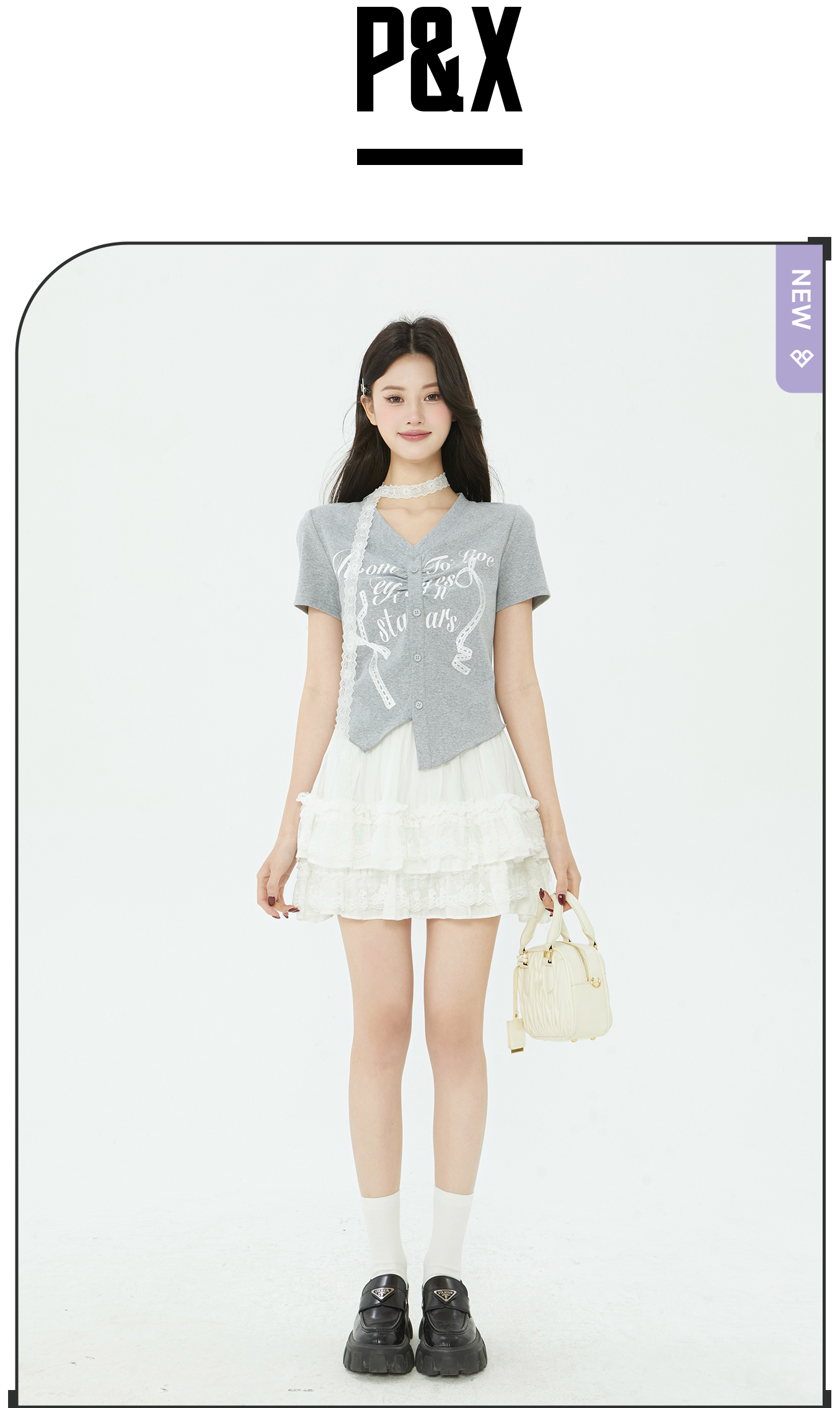 P&X设计师2025夏季新款甜美辣妹风印花修身T恤825202223 灰色