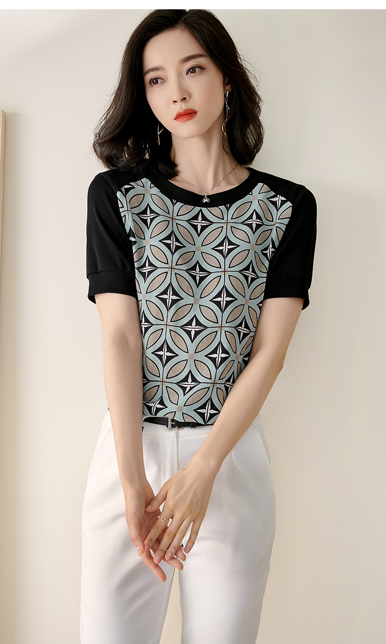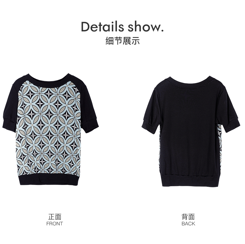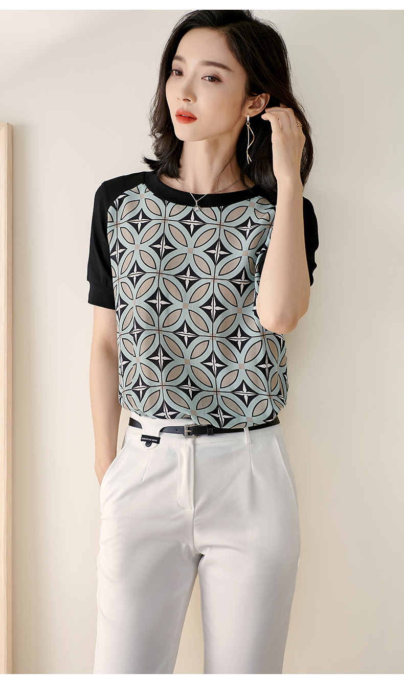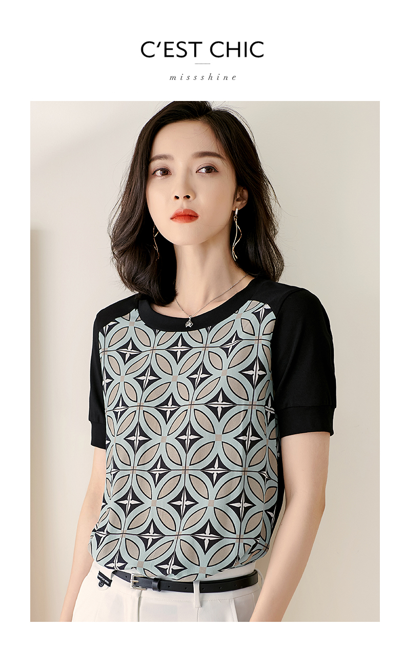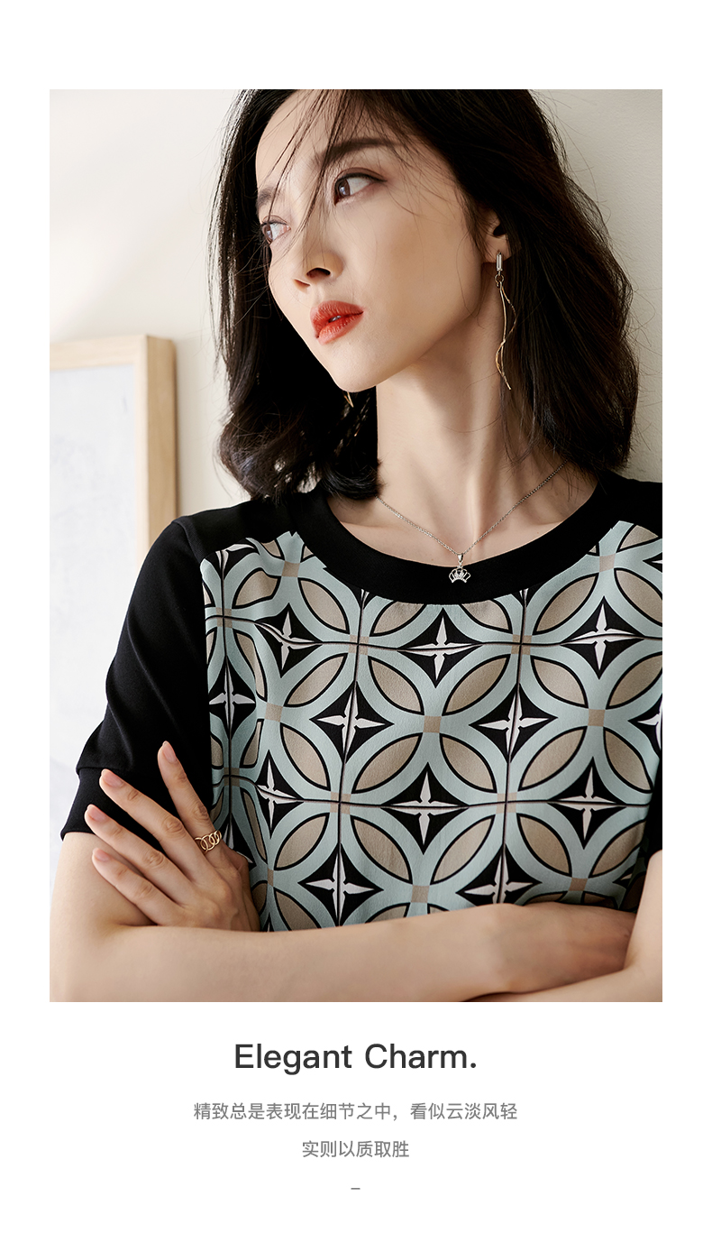 【2XL预售7天】米思阳2026夏季新款时尚几何印花拼接真丝T恤短袖休闲上衣女1627/1194