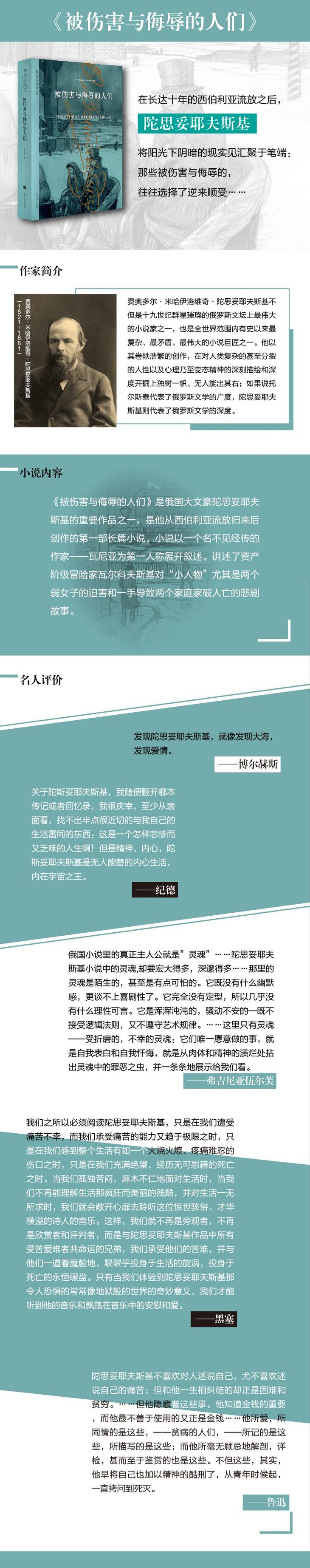 《被伤害与侮辱的人们》系19世纪俄国大文豪陀思妥耶夫斯基的重要作品之一。小说描写了资产阶级冒险家瓦尔科夫斯基对“小人物”,尤其是两个弱女子的迫害,以及一手造成的两个家庭的悲剧。没落贵族伊赫缅涅夫是瓦尔科夫斯基公爵的管家,他尽心尽力地为公爵管理家务和田产,却得不到公爵的赏识和信任,两人经常发生口角,*终闹翻,打起了官司。为了置伊赫缅涅夫一家于死地,瓦尔科夫斯基侵吞了他仅有的一座田庄,又千方百计迫使儿子阿辽沙娶百万家产的继承者做儿媳,使钟情于阿辽沙的管家女儿娜达莎遭到抛弃。另一个受害的是斯米特老人一家,他女儿曾经受公爵引诱而离家私奔,结果被掠夺一空,家破人亡,留下一个孤苦伶仃的私生女涅丽,*后涅丽也在贫病交迫中离开人世。小说对弱者给予深深的同情,同时对资产阶级自私、虚伪、贪婪、卑鄙的本性进行了无情的揭露和鞭笞。