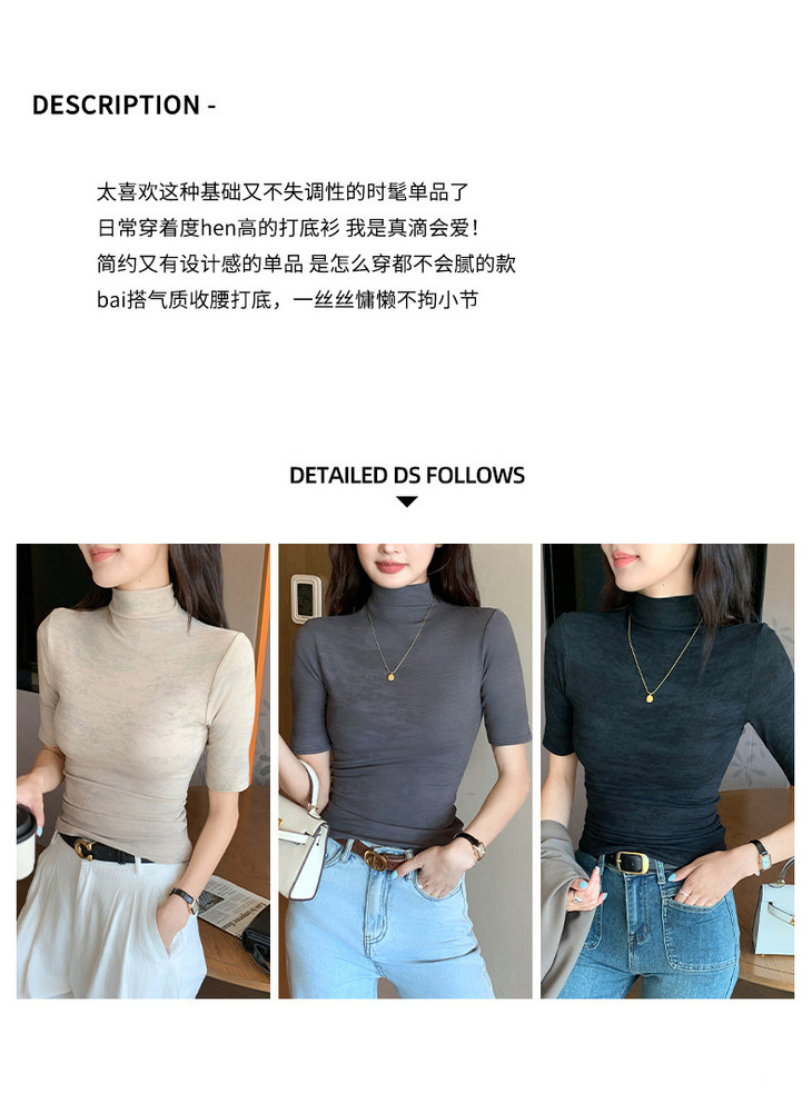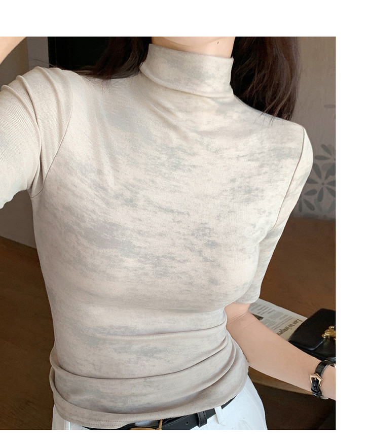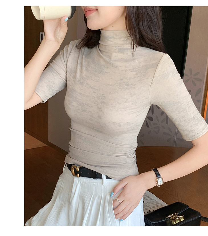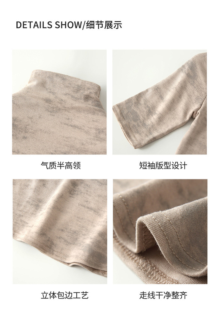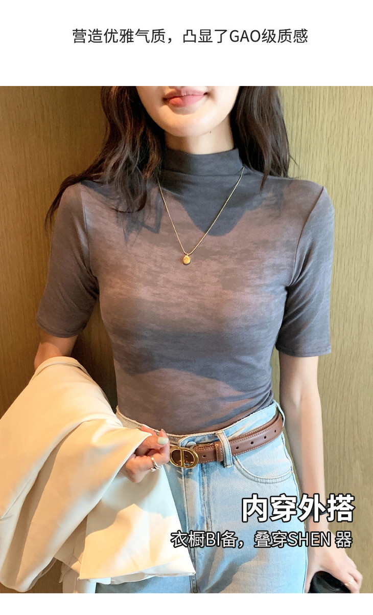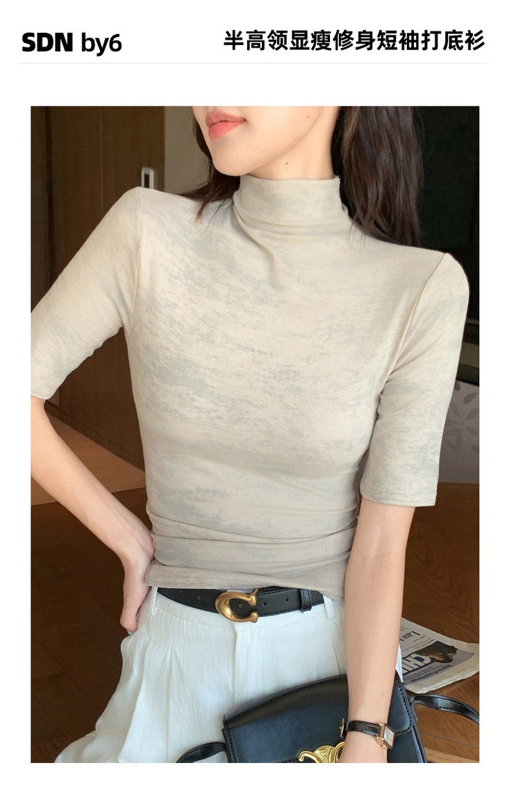 夏季新款打底衫五分袖女迷彩半高领上衣修身内搭t恤针织短袖