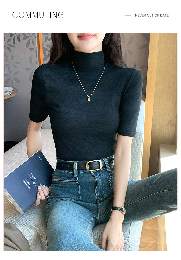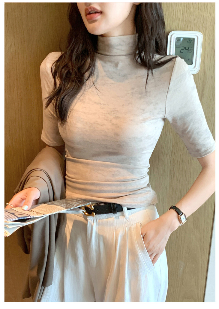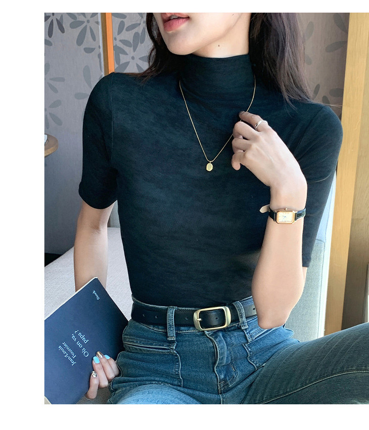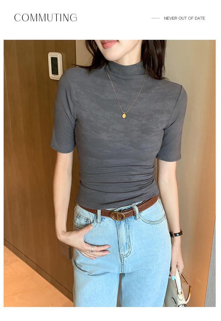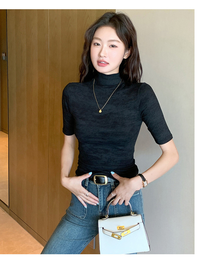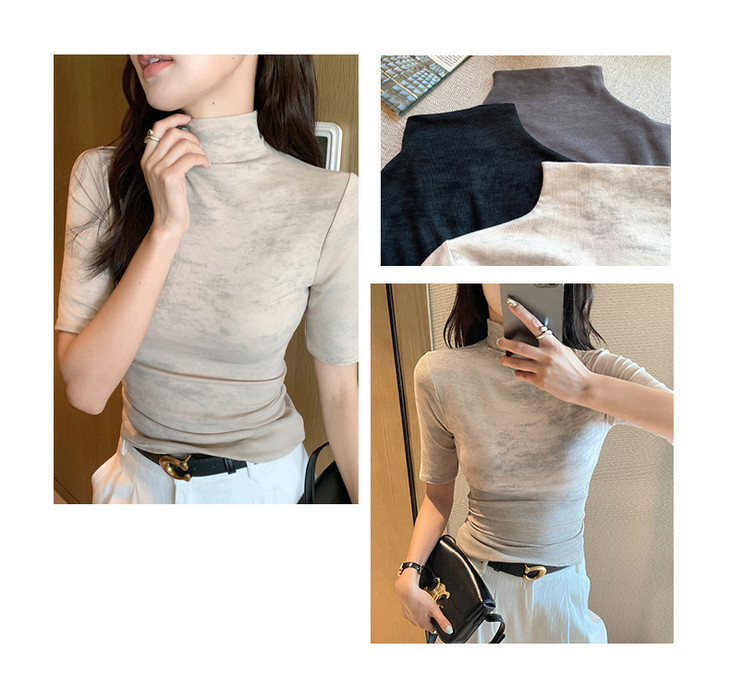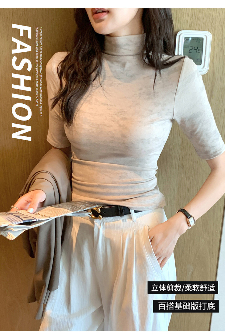 夏季新款打底衫五分袖女迷彩半高领上衣修身内搭t恤针织短袖