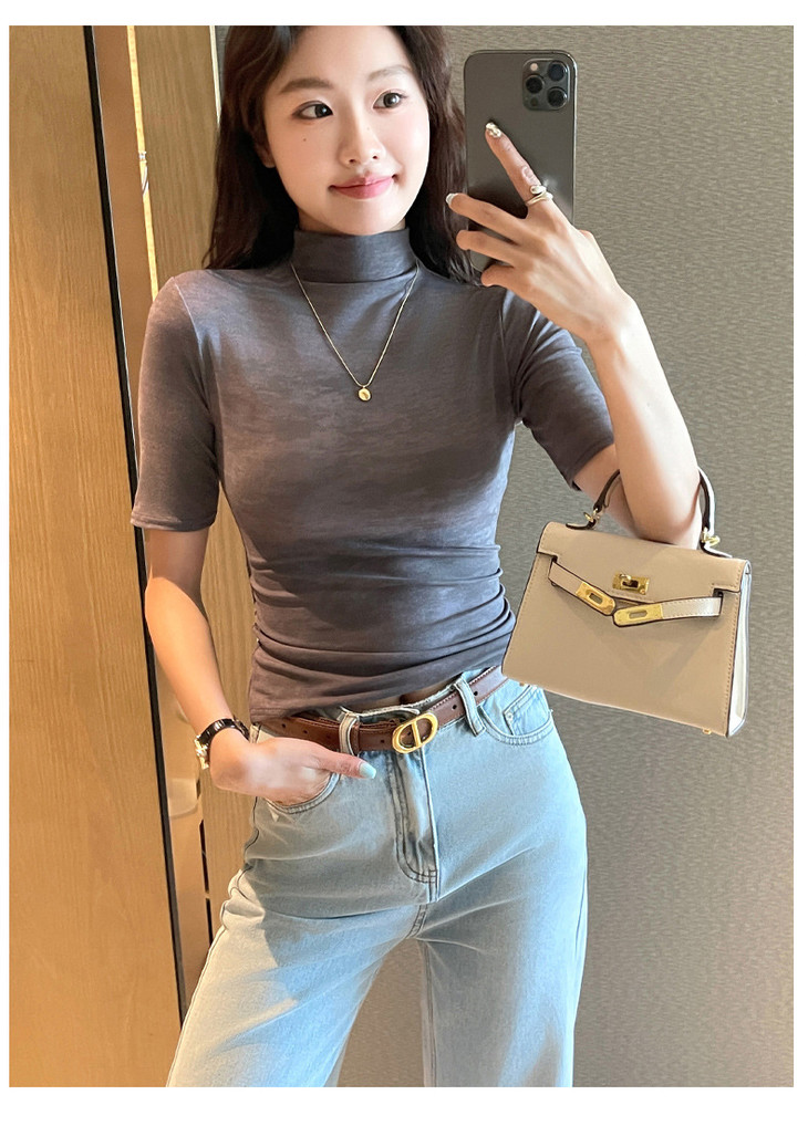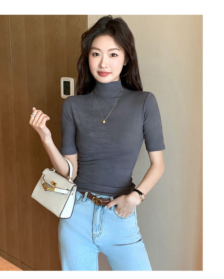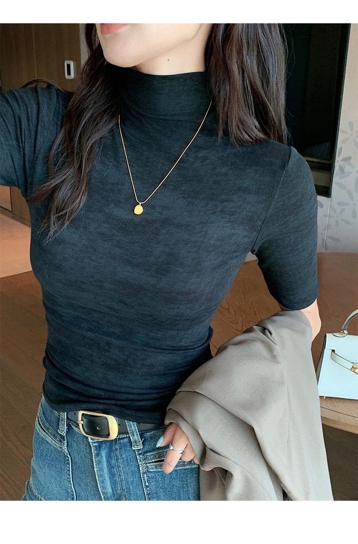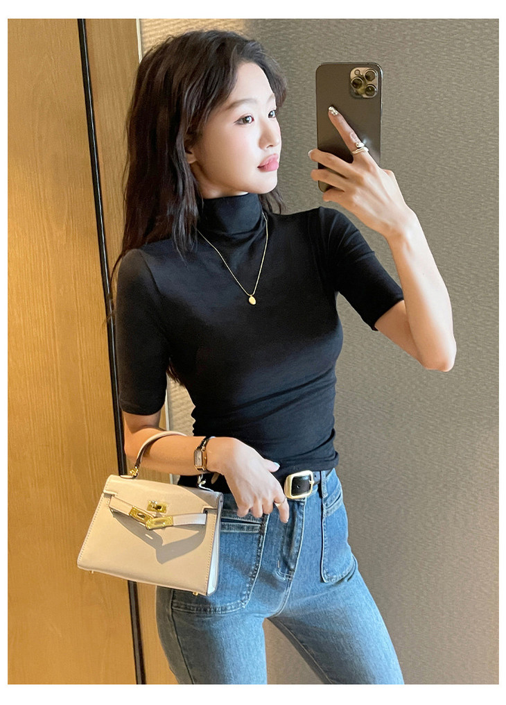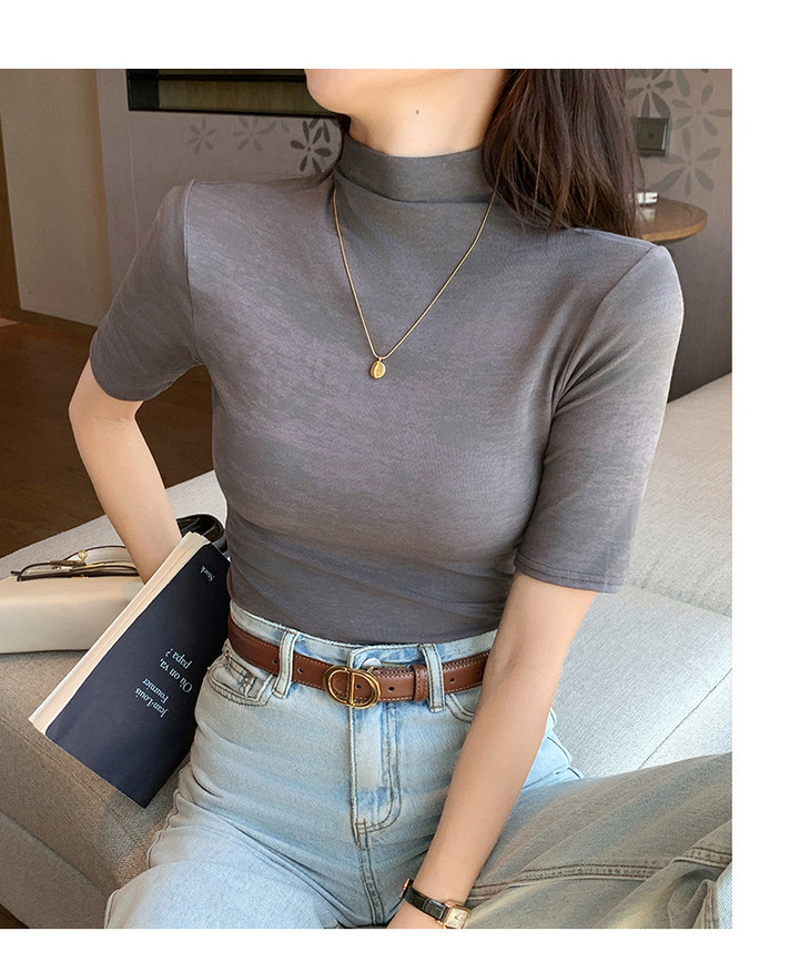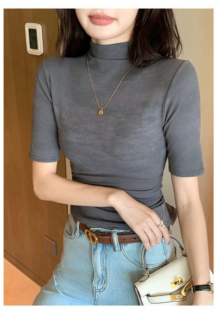 夏季新款打底衫五分袖女迷彩半高领上衣修身内搭t恤针织短袖
