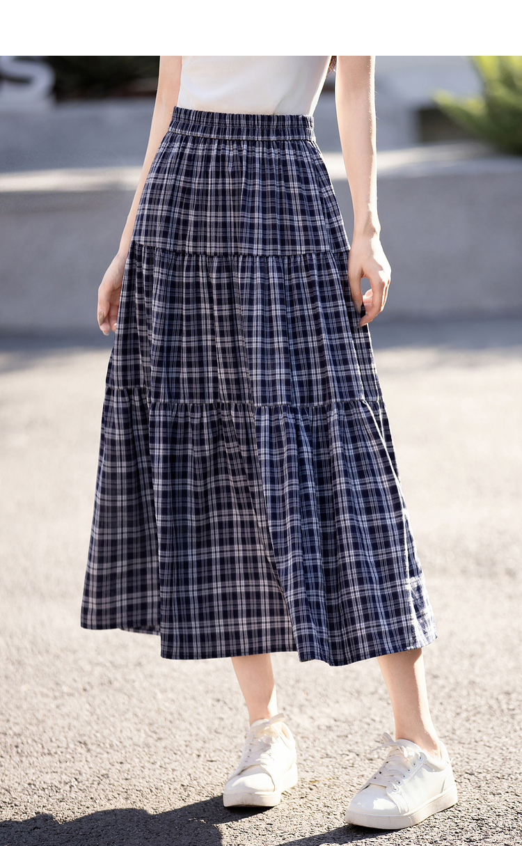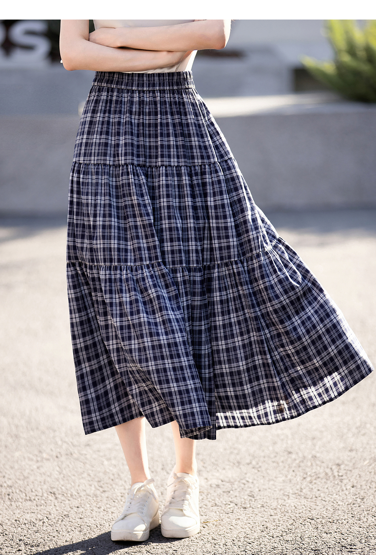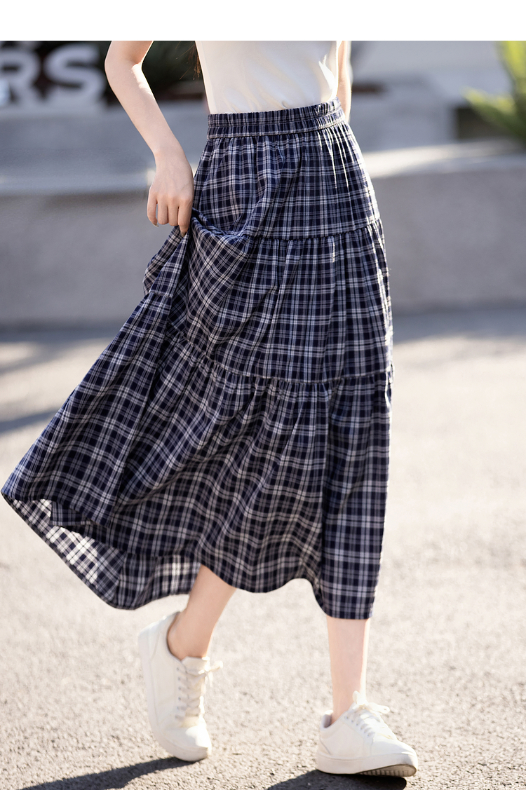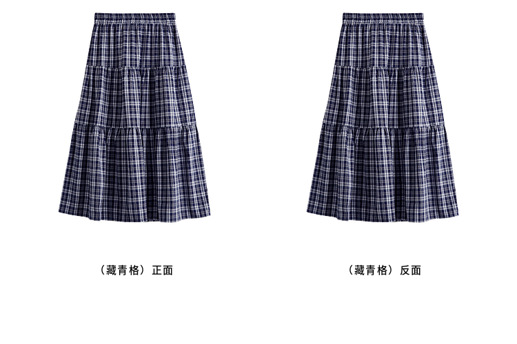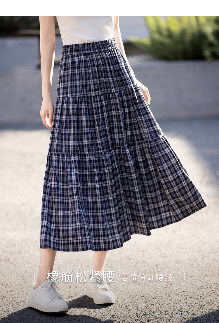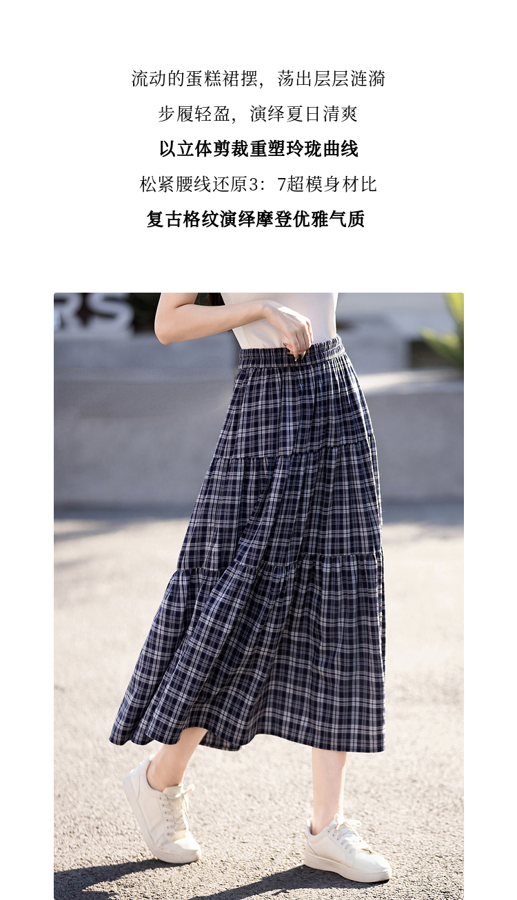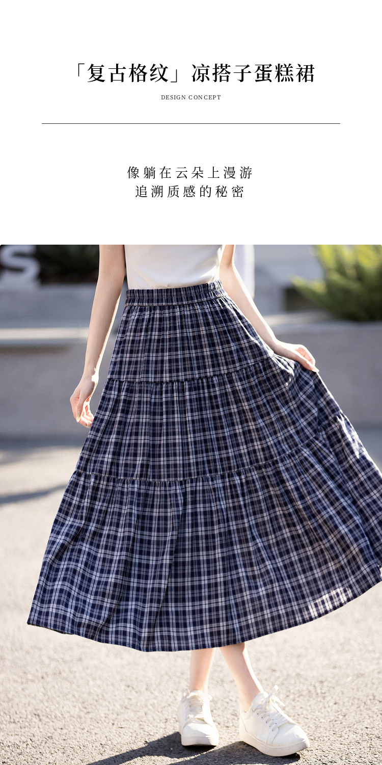 【专属特价】熙世界复古藏青格纹半身裙女夏装新款高腰显瘦格子长裙a字蛋糕裙