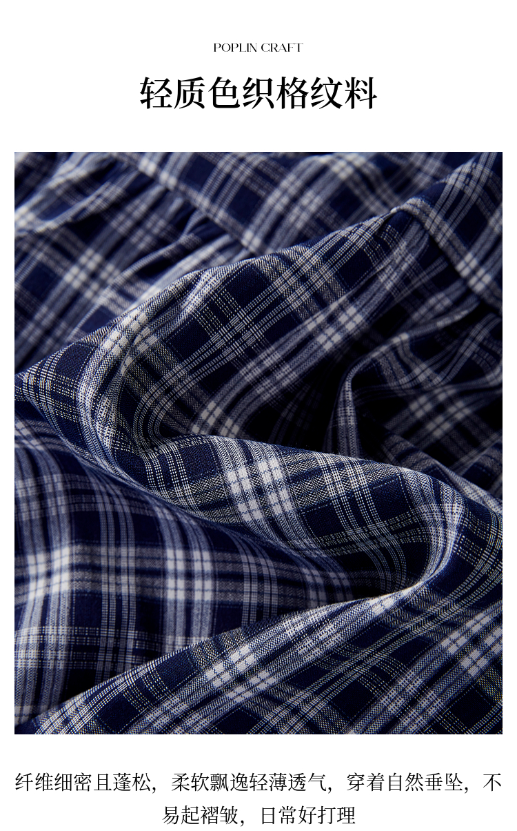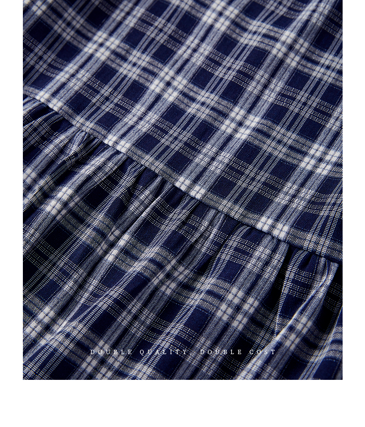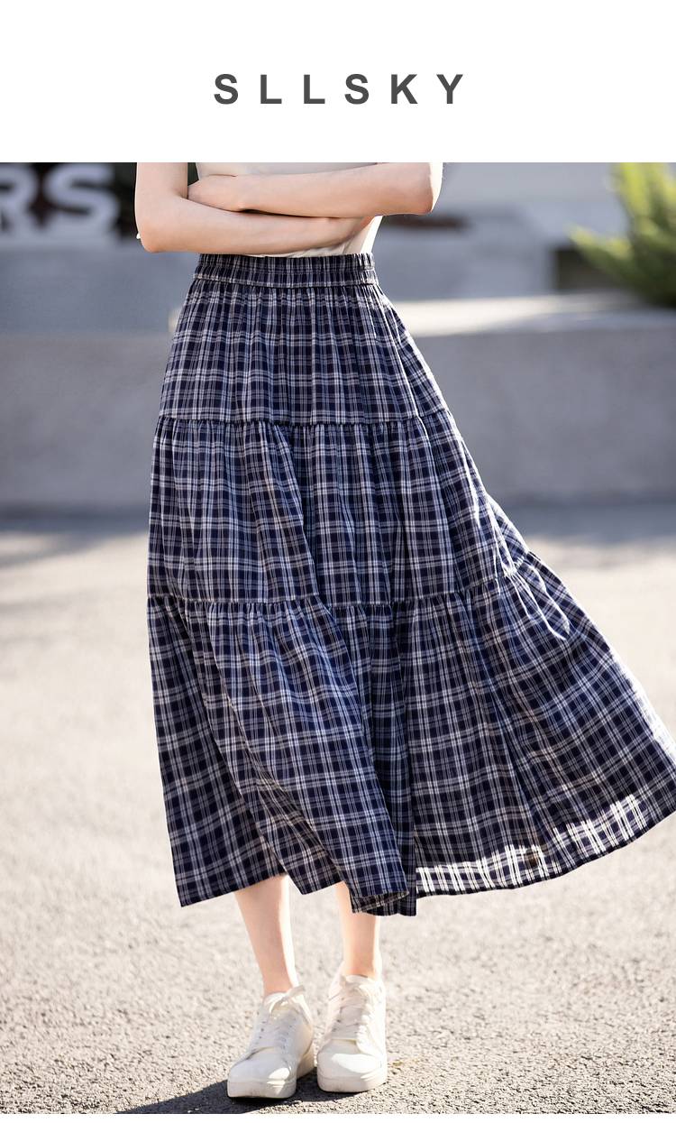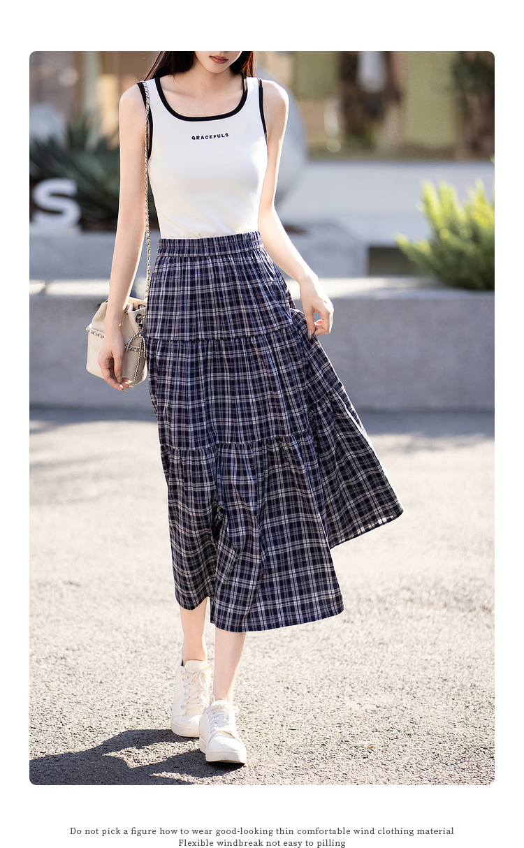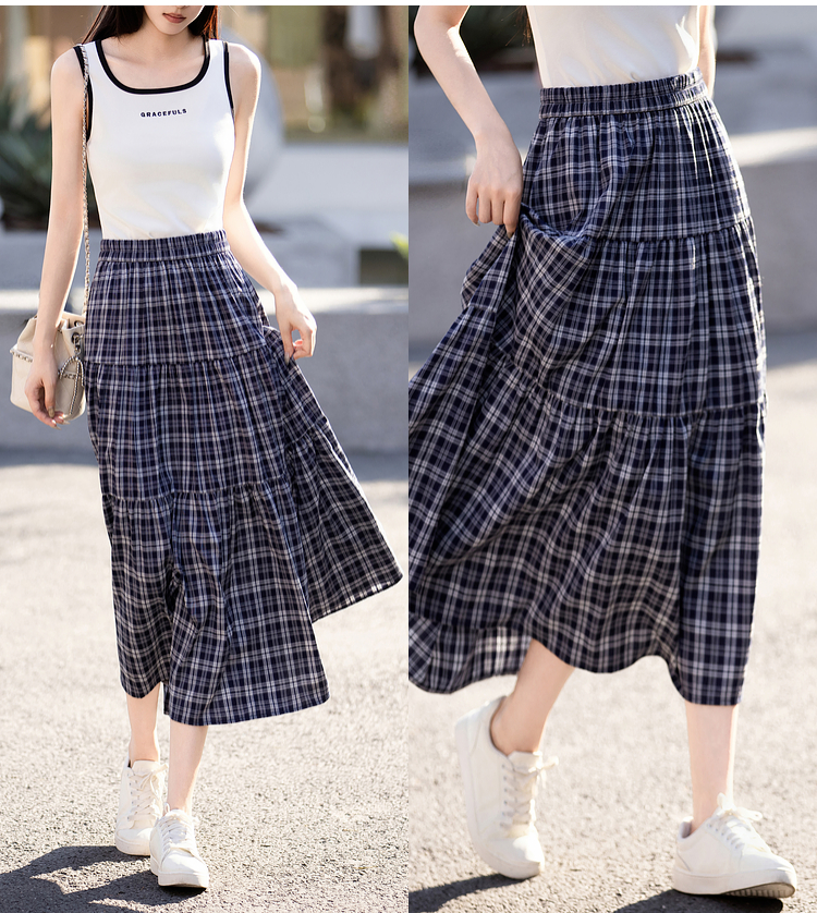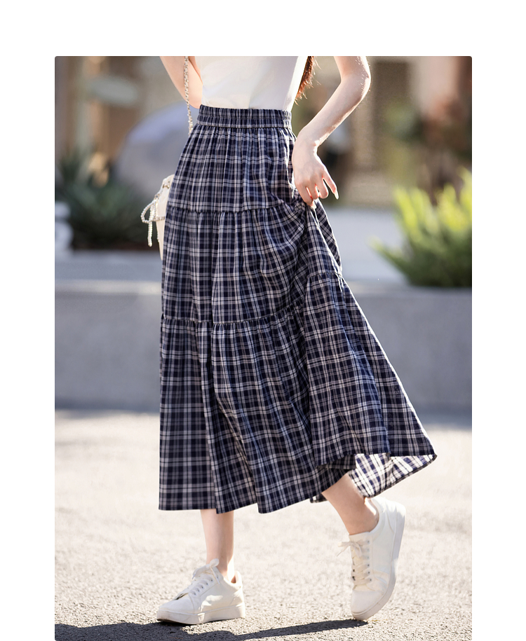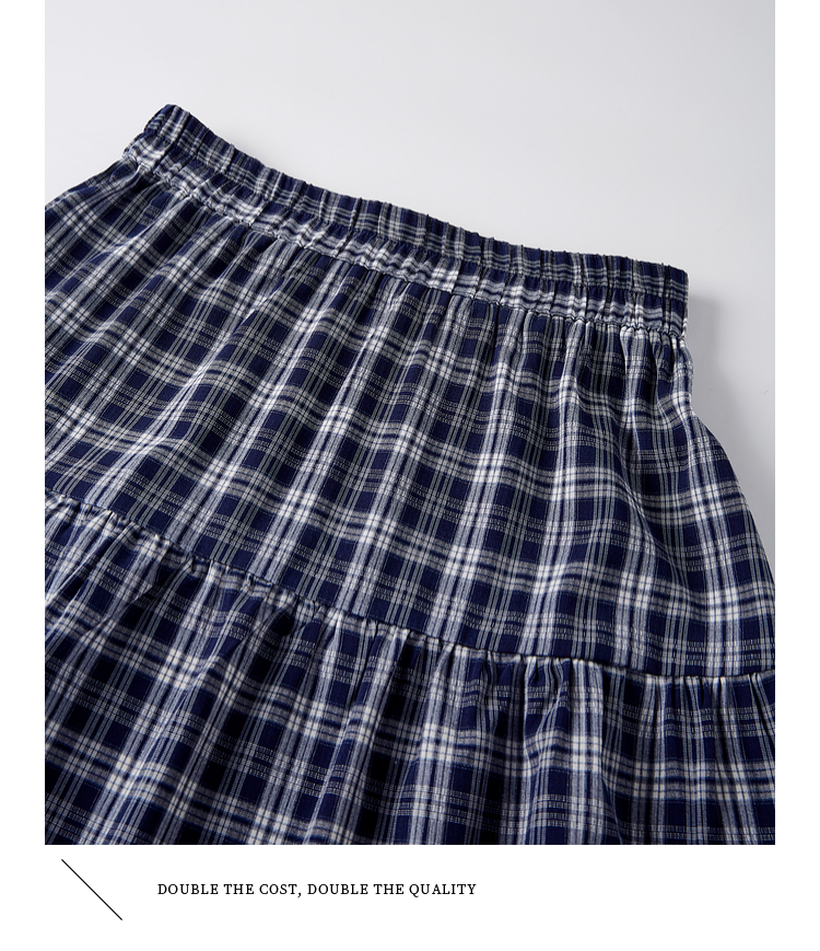 【专属特价】熙世界复古藏青格纹半身裙女夏装新款高腰显瘦格子长裙a字蛋糕裙