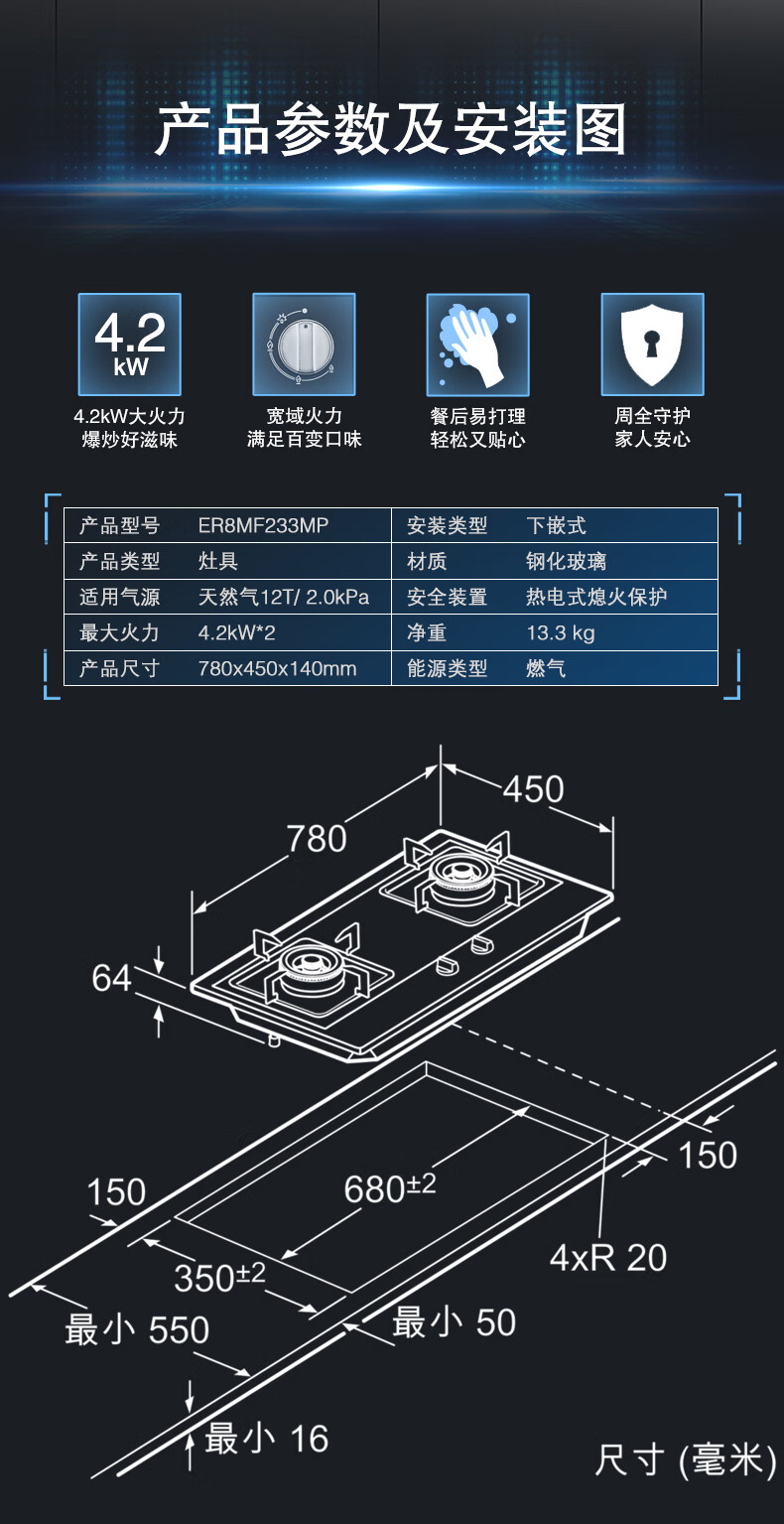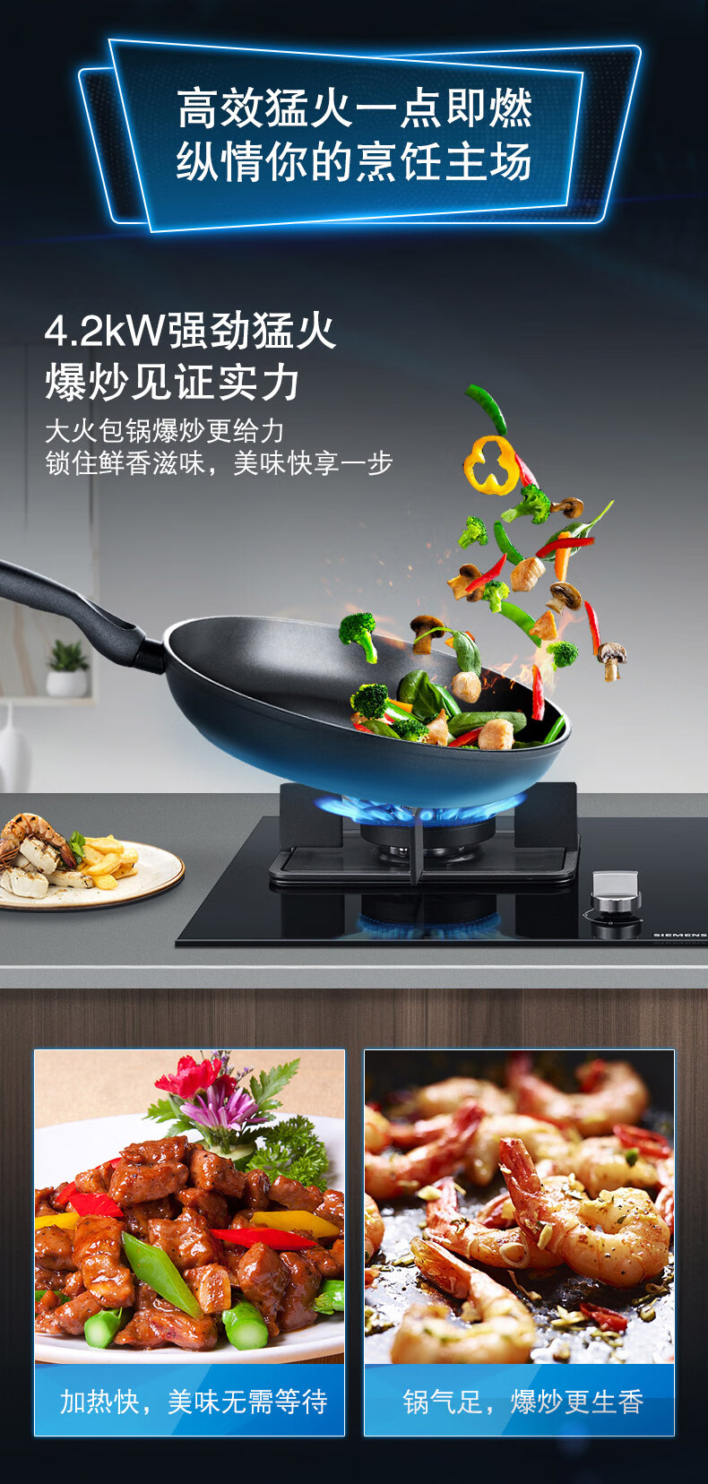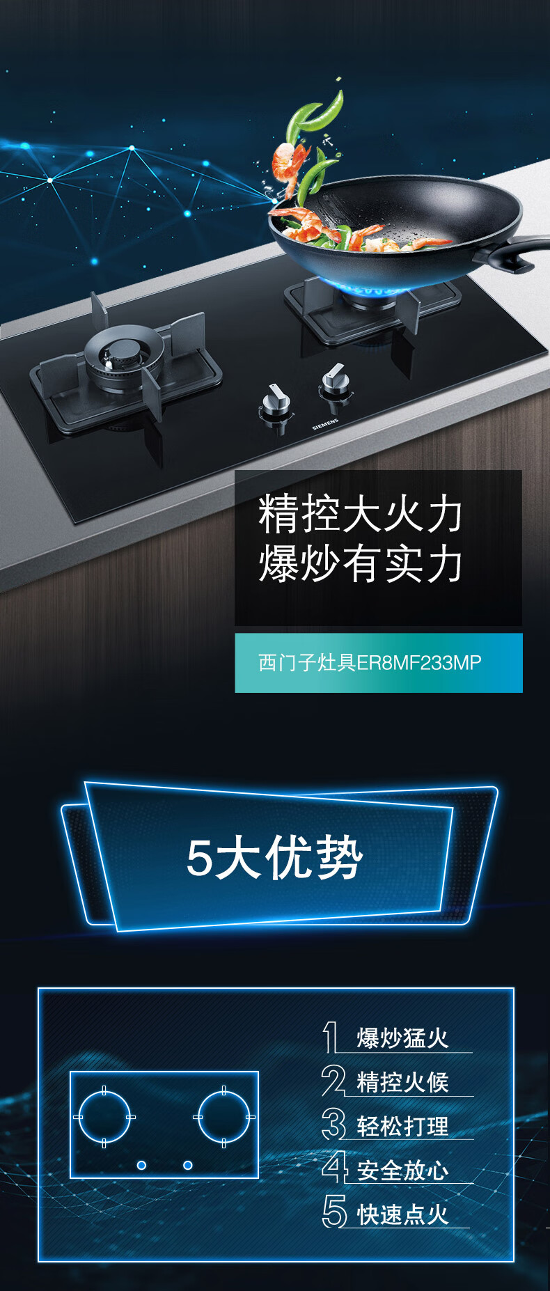 西门子(SIEMENS)西门子燃气灶双灶4.2kW大火力230°宽域调节劲火精控一键快速点火家用嵌入式灶具ER8MF233MP