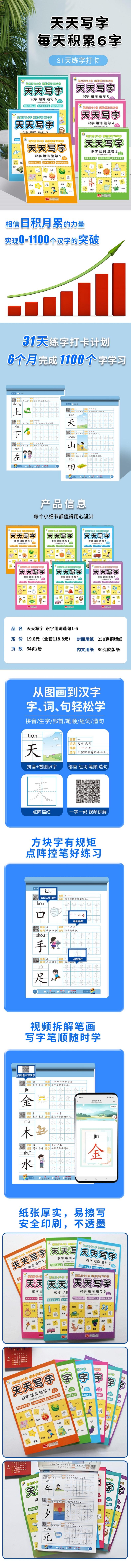 相信日积月累的力量天天写字每天积累6字6个月完成0-1100字的突破1、从图画到汉字,字词句轻松学2、方块字有规矩,点阵控笔好练习3、视频拆解笔画,写字笔顺随时学4、纸张厚实,易擦写;安全印刷,不透墨