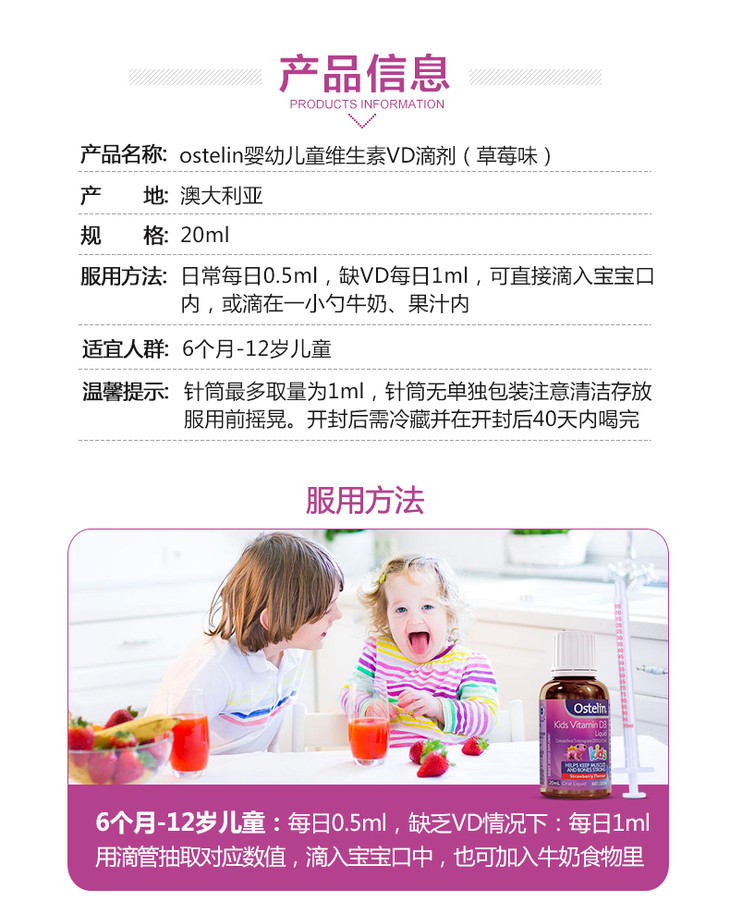【保税】澳大利亚Ostelin 奥斯特林VD婴儿儿童液体维生素滴剂D3草莓味20ml补钙