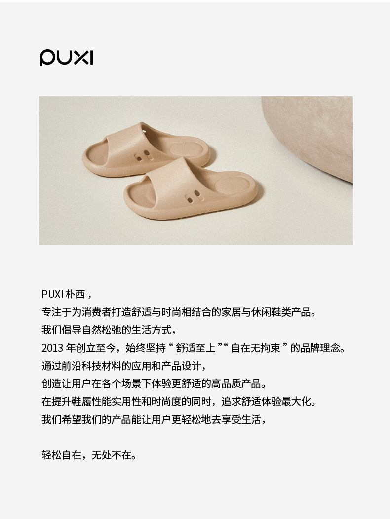 浙江朴西集团成立于2013年,是一家集研发设计生产销售服务为一体的复合型集团。朴西多年来坚持自主延发设计,并不断融合科技创新,致力于让更多人穿上舒适拖鞋,享受家庭幸福感。