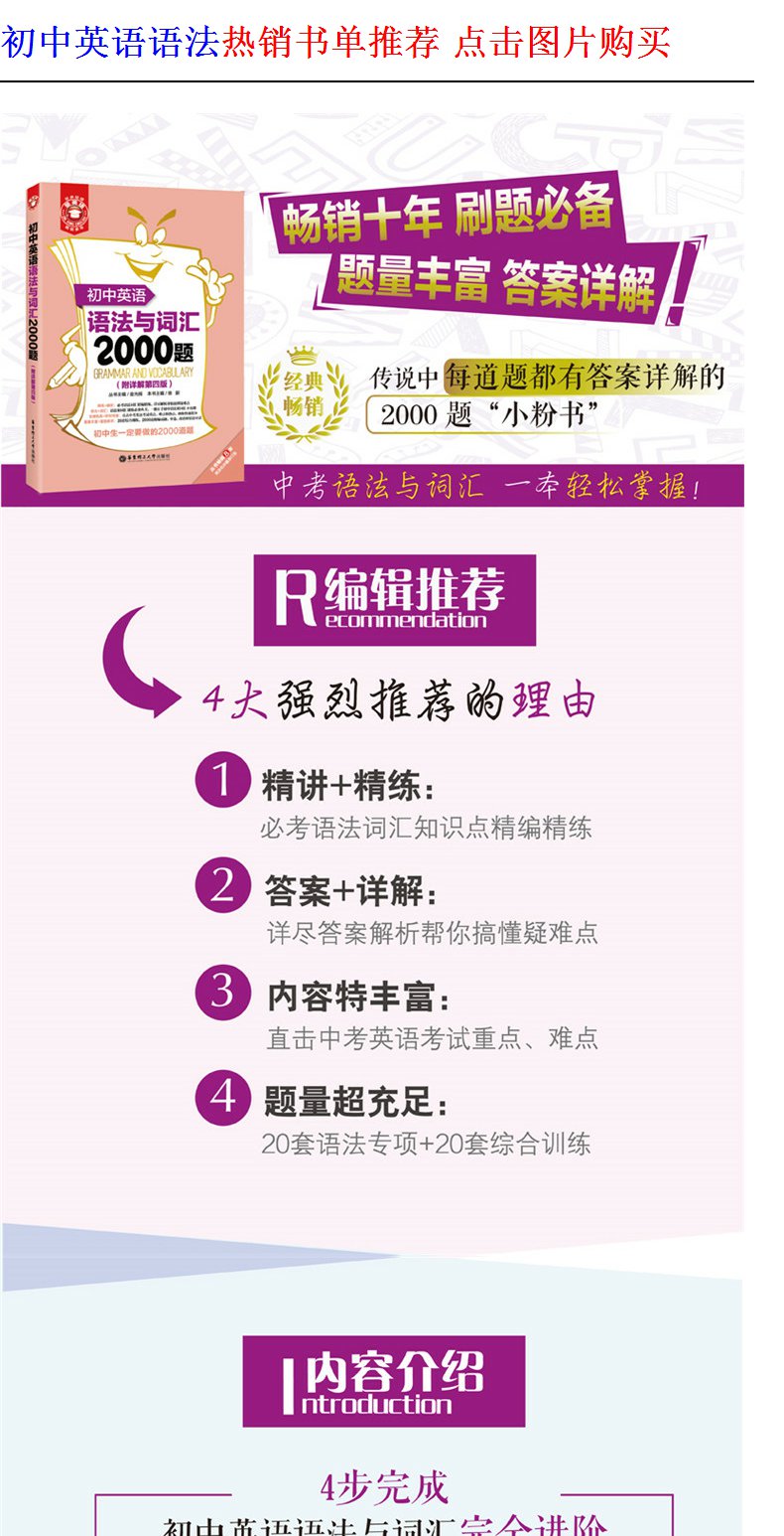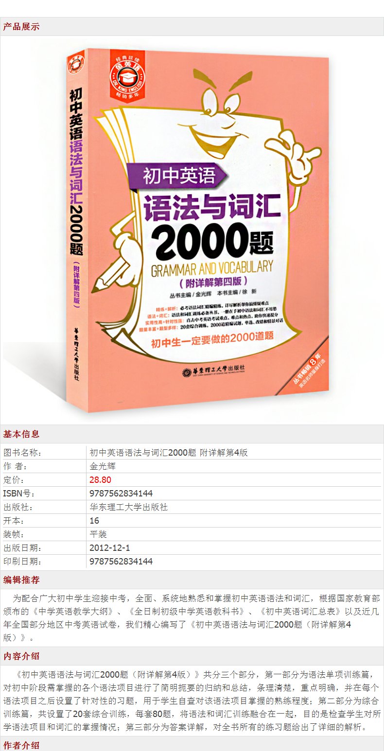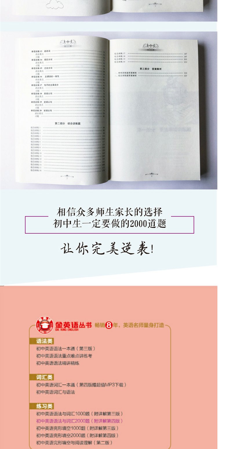 金英语初中英语语法与词汇2000题(附详解第4版)华东理工大学出版社 初中英语学习辅导专项训练英语词汇学习语法书练习册
