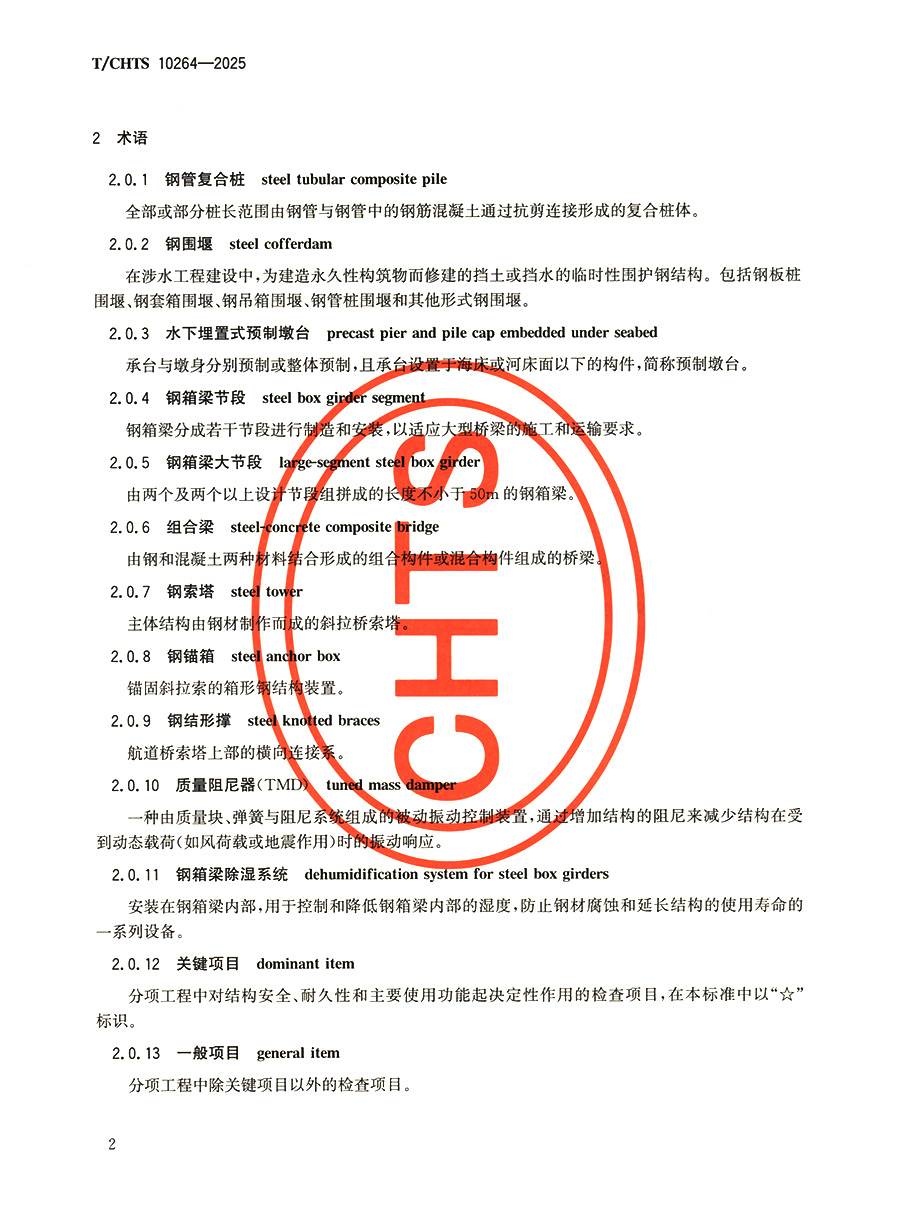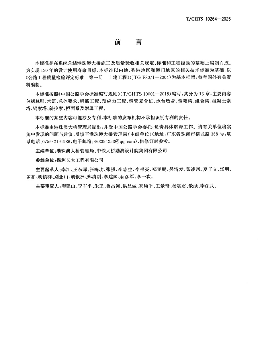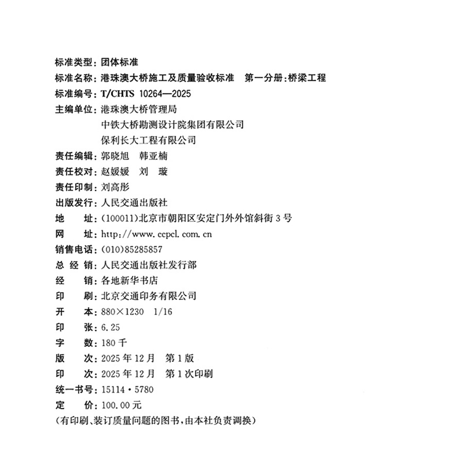 书名:港珠澳大桥施工及质量验收标准 第一分册:桥梁工程(T/CHTS 10264—2025)