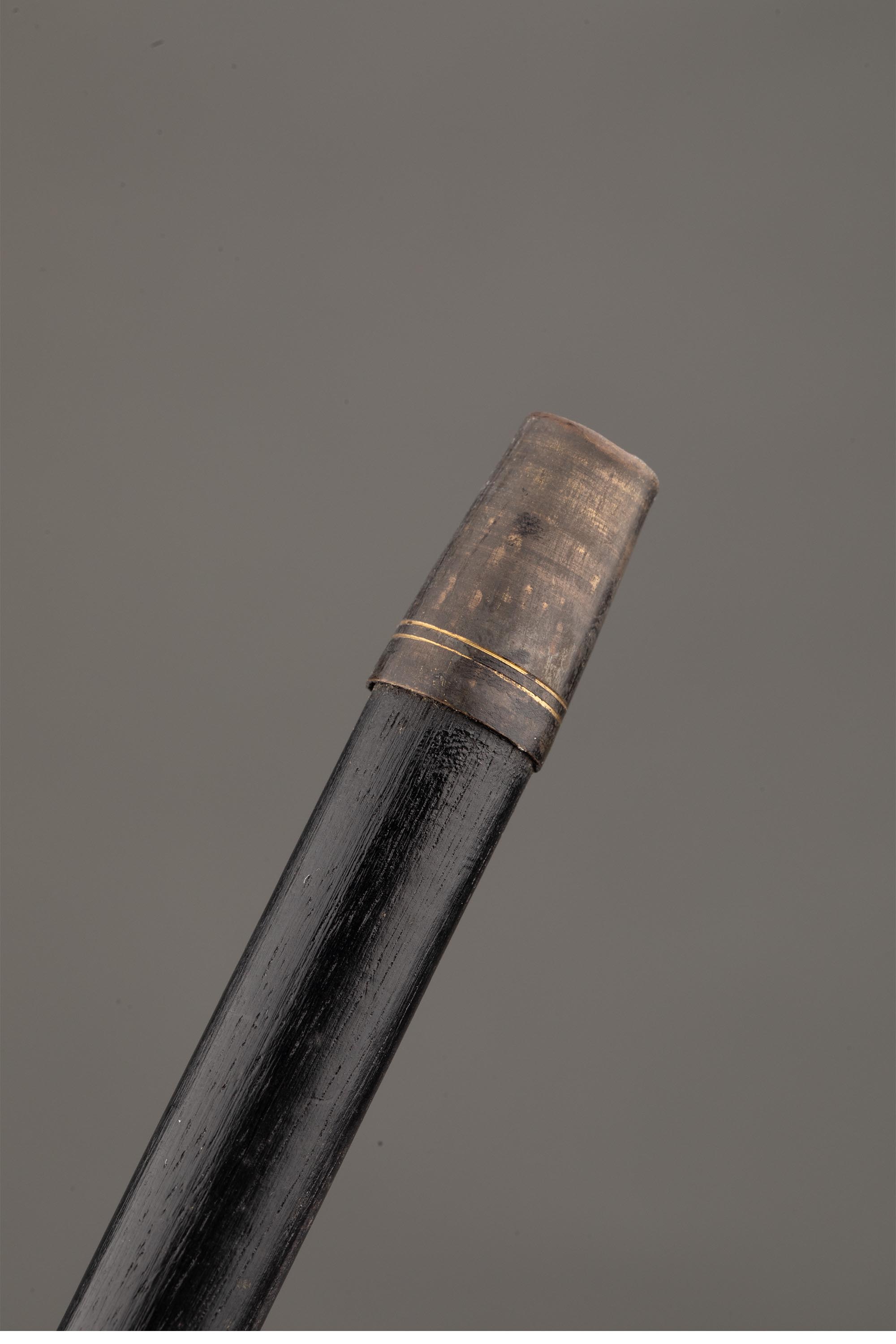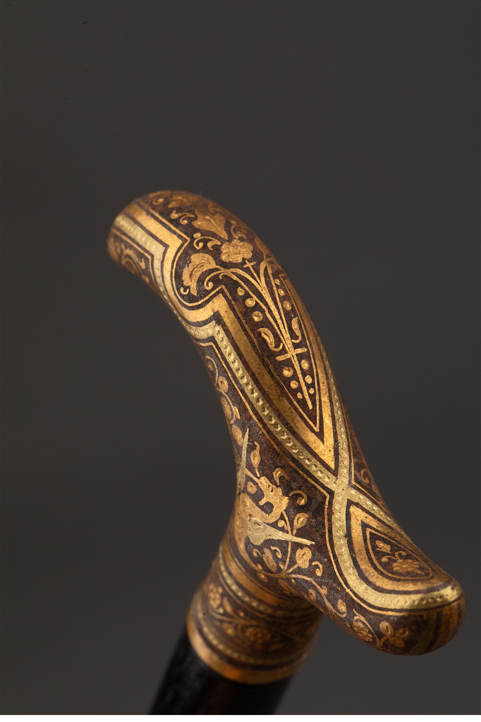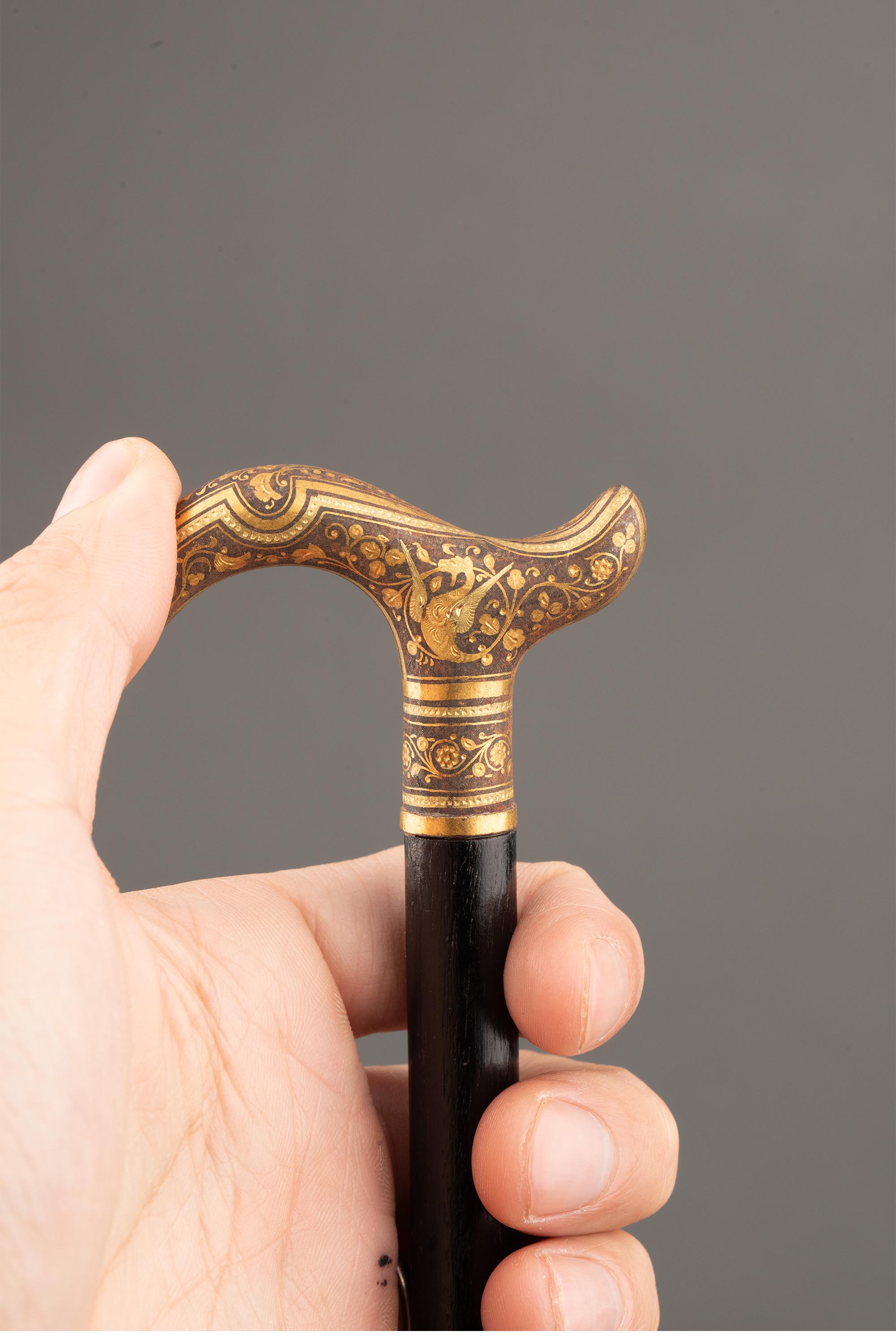 1880-1910年代西班牙出品卷叶花卉纹饰托莱多钢镶嵌黄金杖柄硬木古董手杖