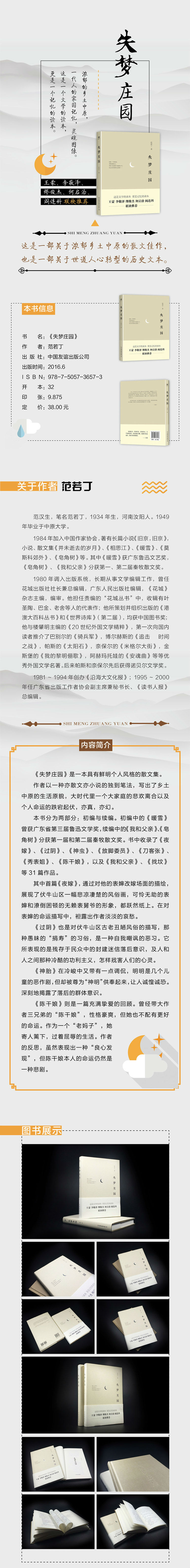 本书题曰《失梦庄园》,当这部书稿即将脱稿时,我突然恍惚起来。在中原大地的伏牛山下,有那座庄园吗?有那些人物吗?有那些梦吗?那里曾有过梦还是梦丢失了?也许那里什么都没有,一切原本都是虚幻。那么我在这虚幻中寻找什么?我写这些不着边际的文字又为什么?是凭吊是哀伤是叹息抑或是批判呢?我无法回答,但我要写下去……
