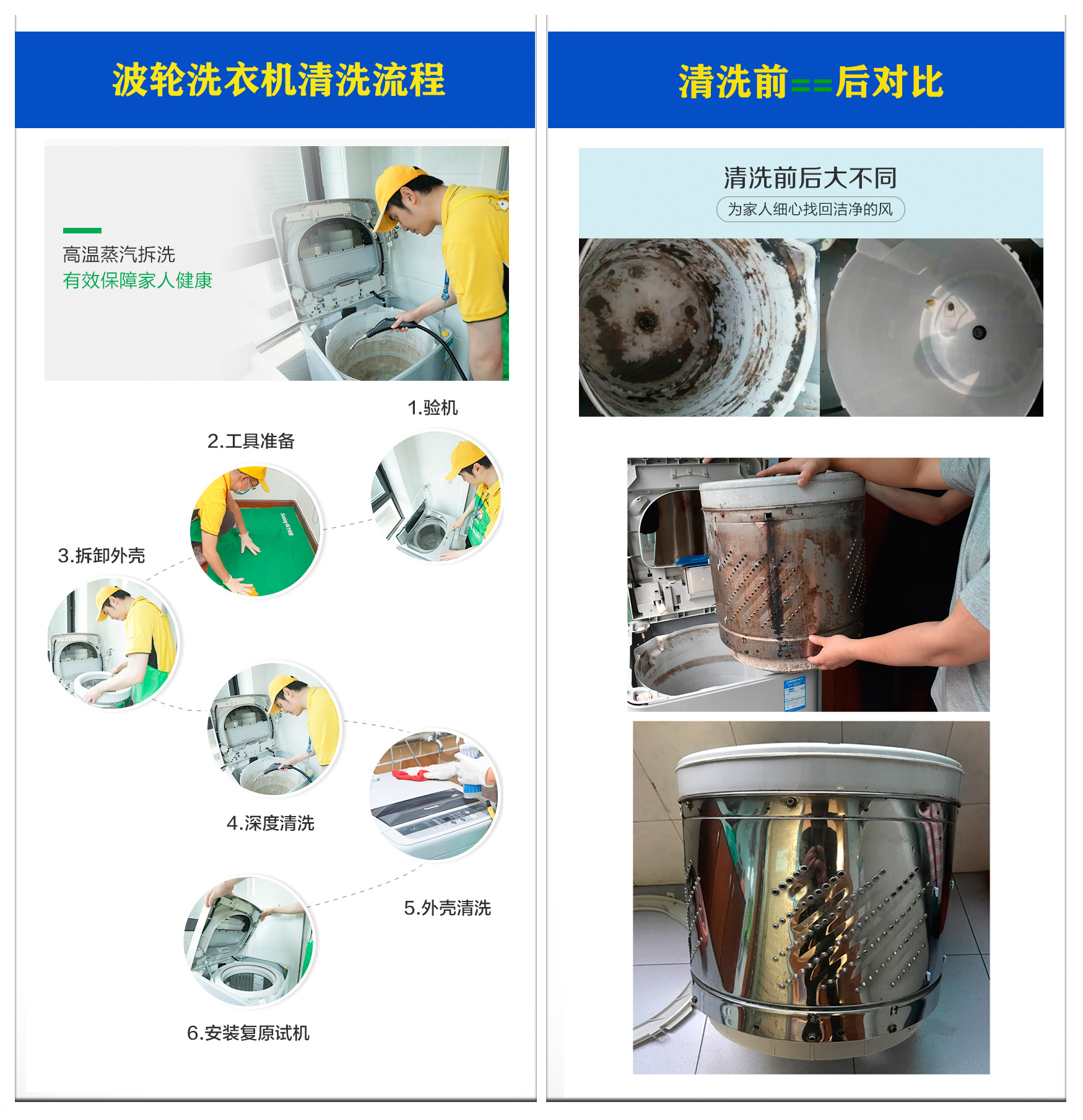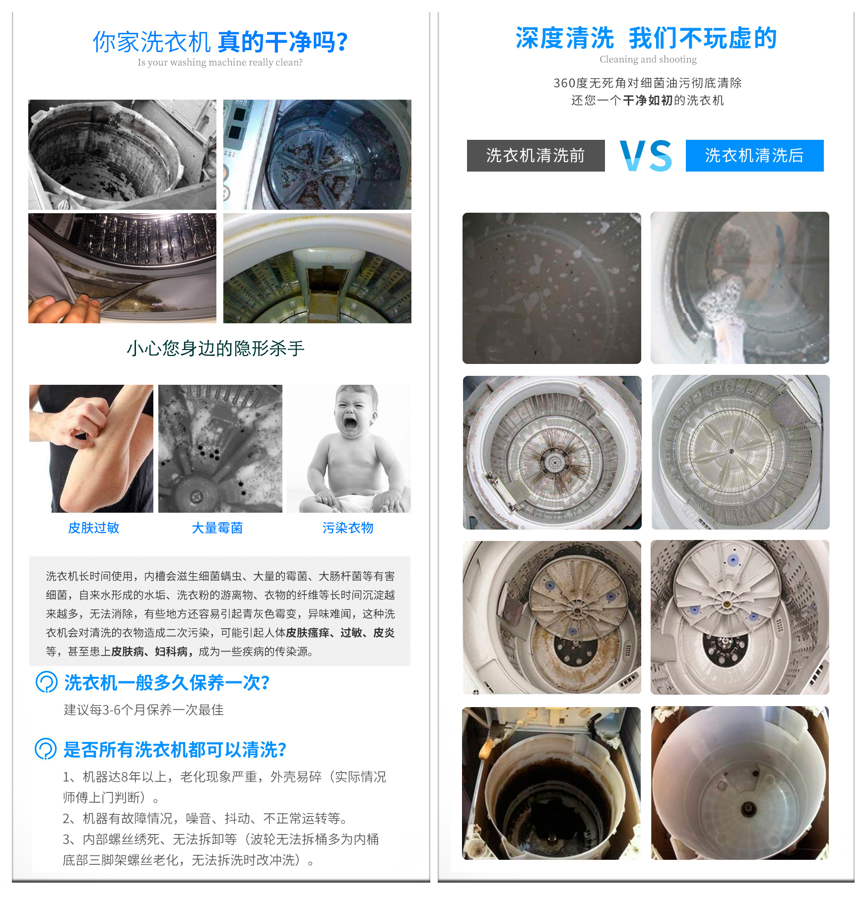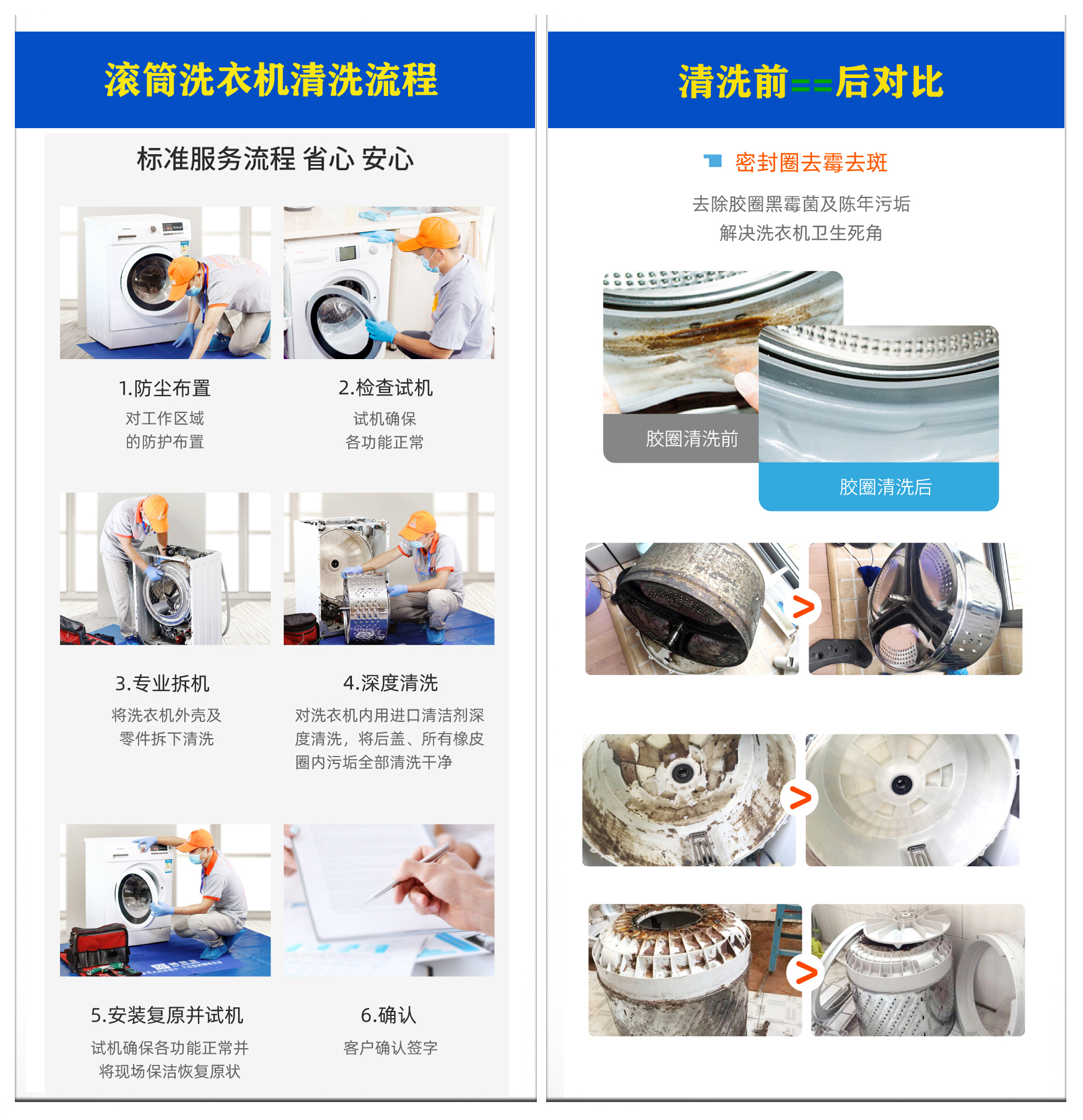 洗衣机清洗包含:洗衣机表面、机盖、桶内部、洗衣机洗涤盒、滤网、密封条、进水管及管口、回转盘、钢圈、门封圈。机器使用年限超过4年的,谨慎接单清洗。